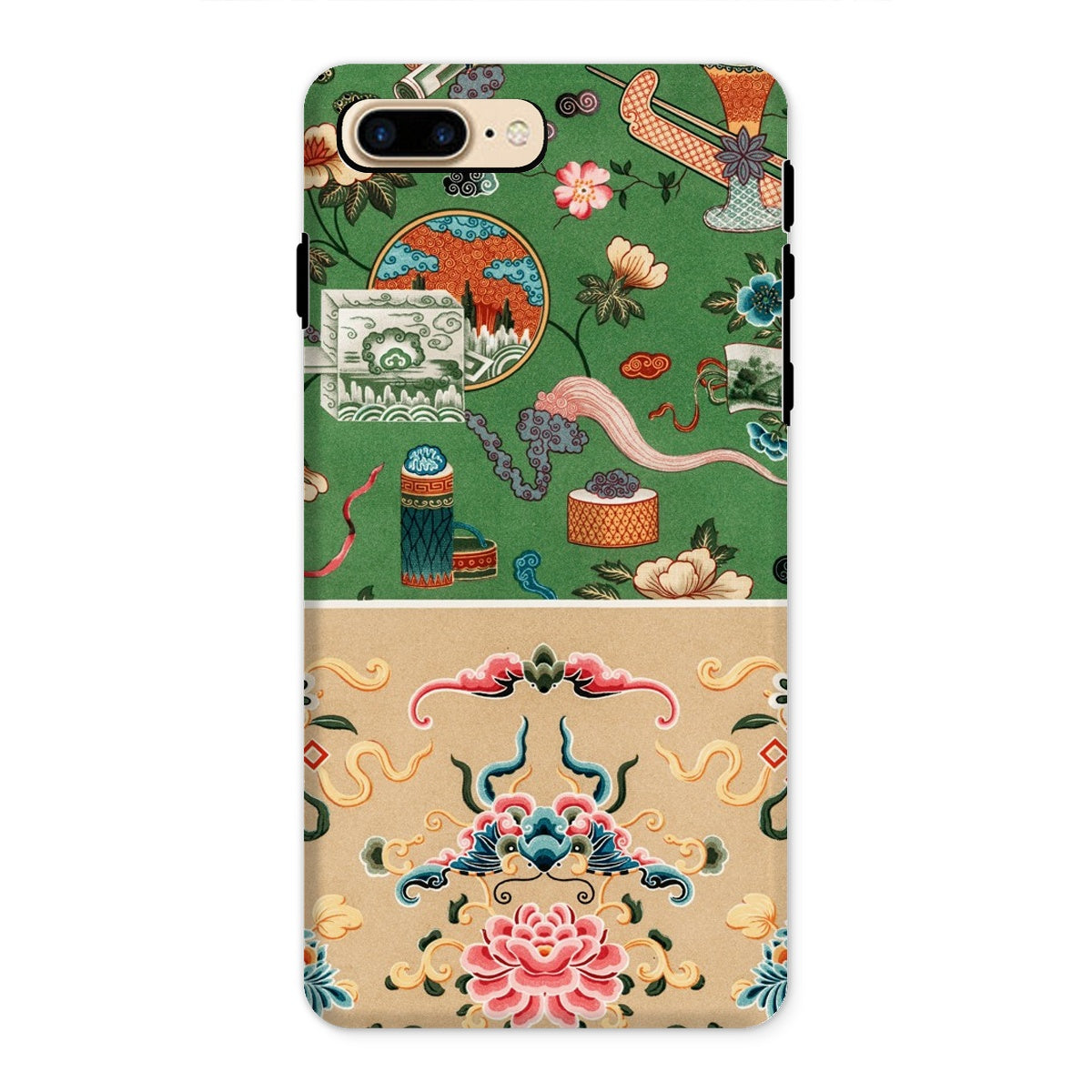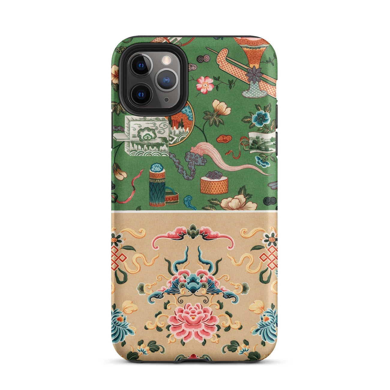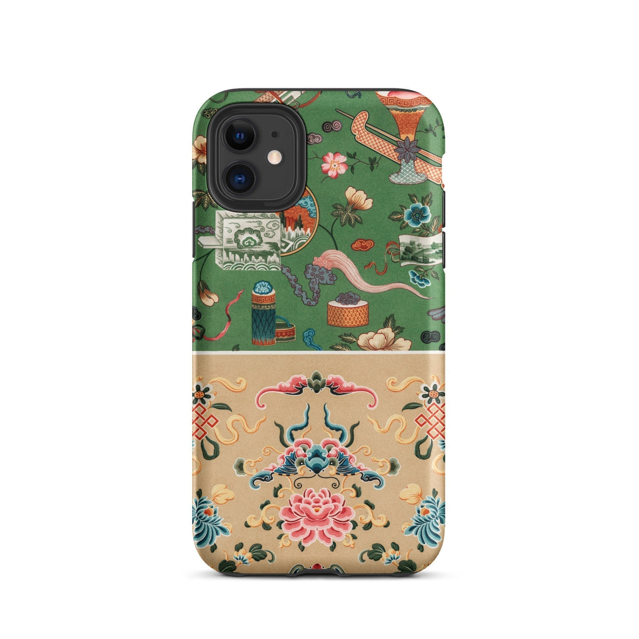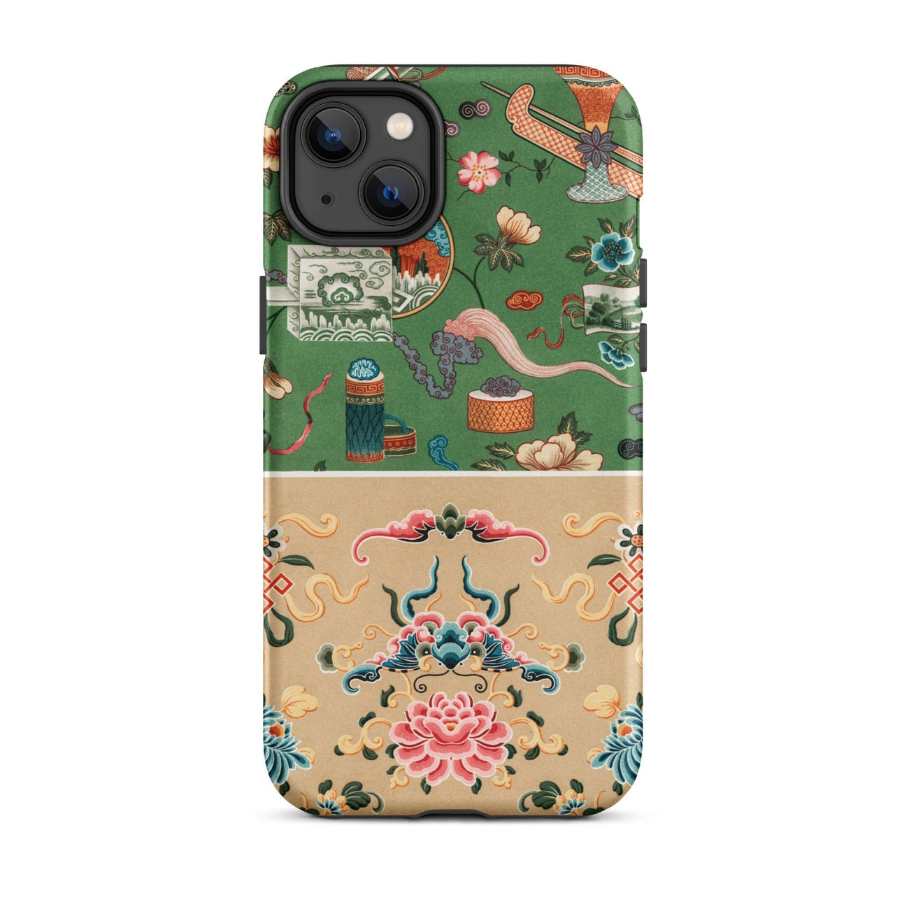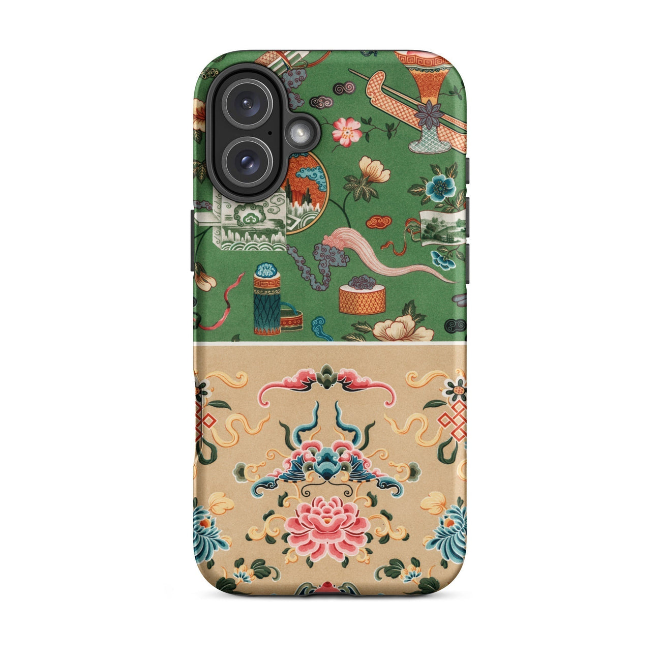 Chinoiserie chic meets iPhone sleek. You're not just protecting your device; you're wielding a pocket-sized portal to the Qing dynasty. Auguste Racinet's double act dances on your screen, a verdant tapestry of Eastern elegance. Jade-hued backdrop cradles delicate blooms, while ornate vessels whisper tales of silk roads and imperial courts.