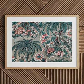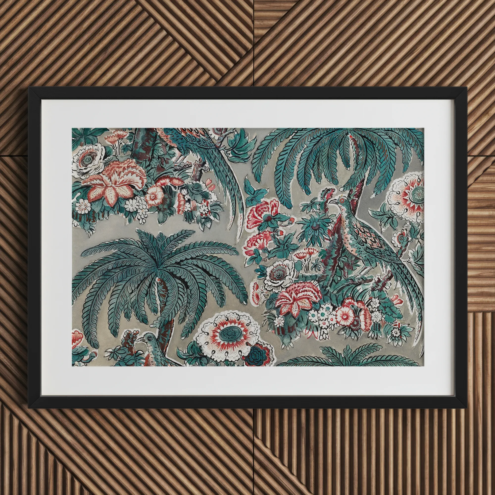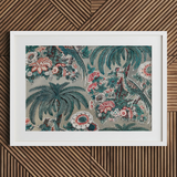 Immerse yourself in the exotic allure of George Loughridge's Chintz watercolor jungle art print, a kitschy marvel that transports you to a lush, tropical paradise. This captivating artwork, reminiscent of 1930s chintz fabric designs, weaves a tapestry of vibrant greens and rich reds, bringing to life an intricately detailed botanical wonderland.
