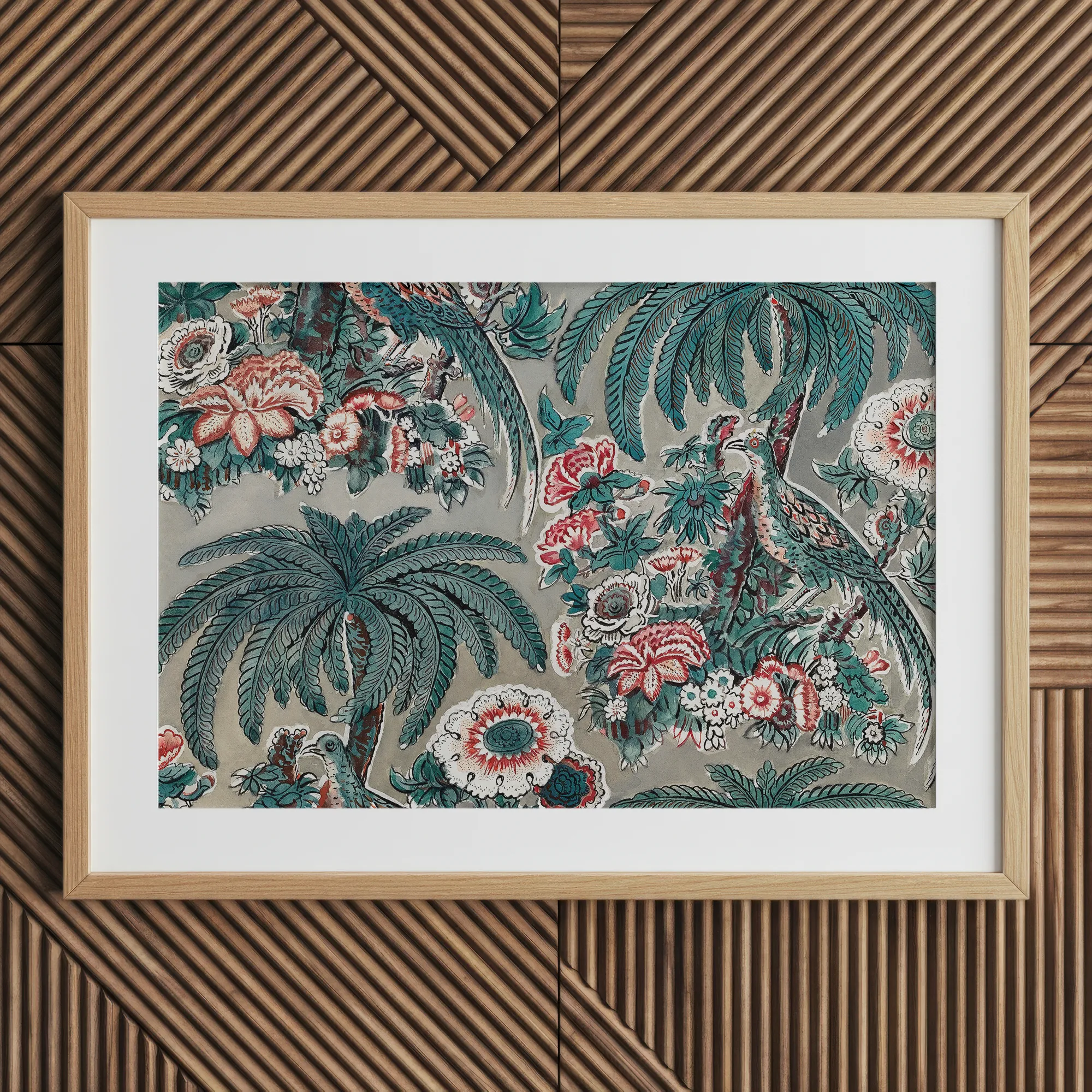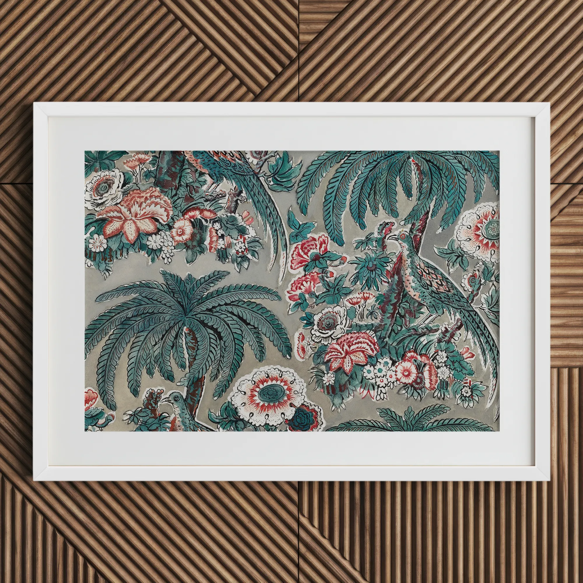 As your eyes wander through the composition, you'll discover meticulously rendered palm fronds swaying alongside exquisitely painted exotic blooms. Elegant birds perch amidst the foliage, their graceful forms adding a touch of whimsy to the scene. Loughridge's expert brushwork seamlessly blends naturalistic precision with decorative flair, creating a harmonious balance that epitomizes the era's fascination with nature's complexity.