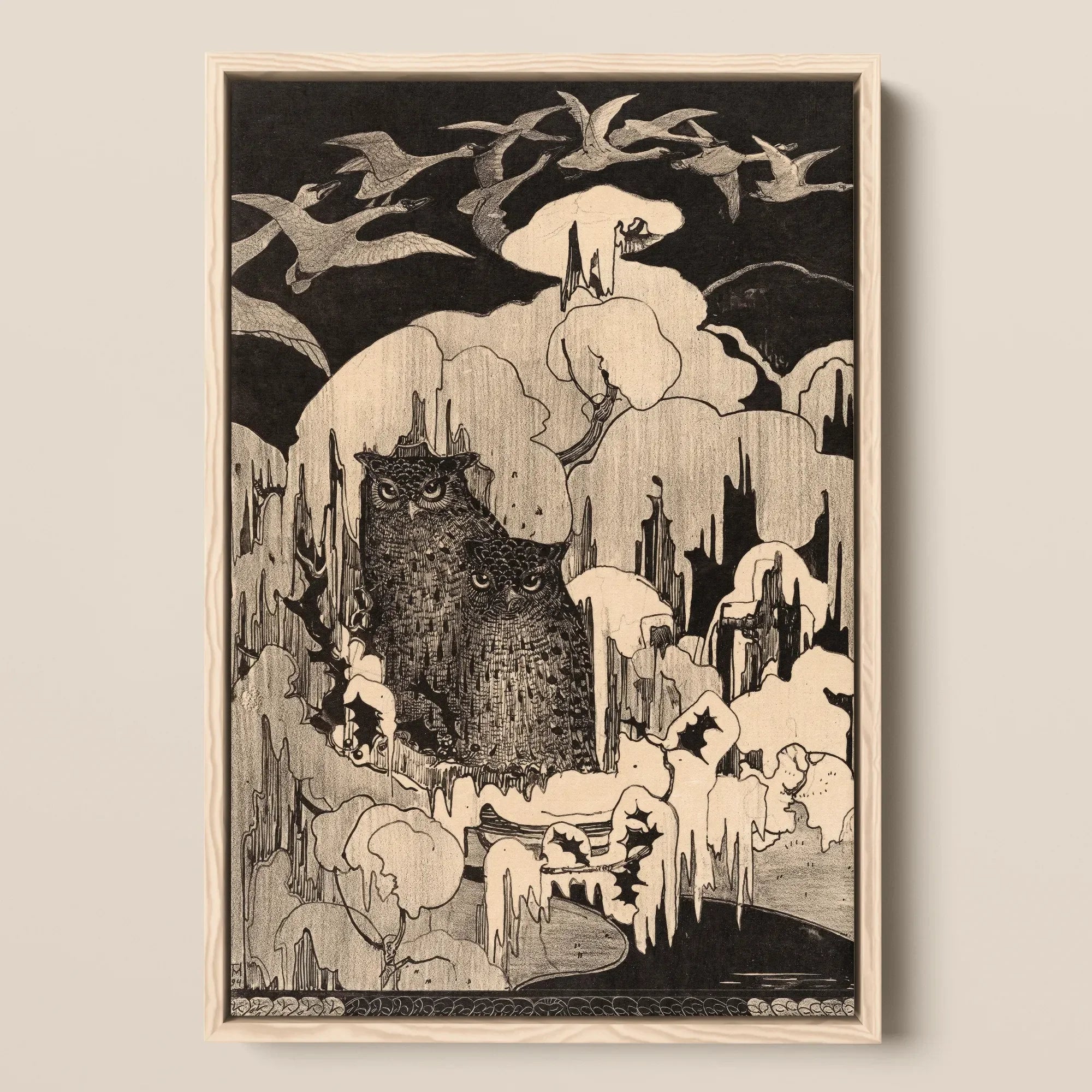 Snow settles like chalk over the forest, muting the night. Two owls cling to crooked branches, their plumage patterned with the same curved lines that ripple through Hoytema’s lithographs. Above them, a column of swans traces pale ellipses across the moon-washed air.