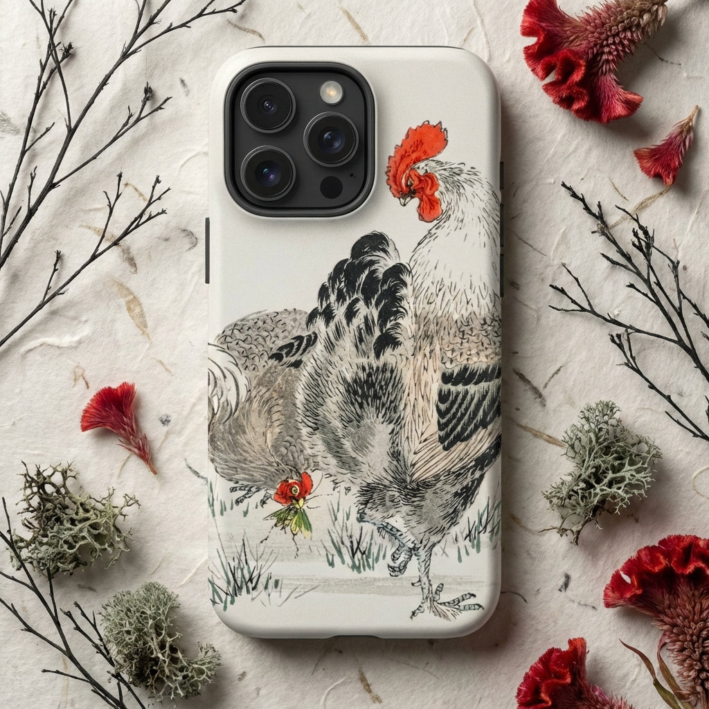 Strut into the digital barnyard, you iPhone-wielding art aficionados. Numata Kashu's roosters swagger across your screen, a Meiji-era masterpiece reborn as mobile armor. This case isn't just protection—it's a time machine, whisking you to 1885 Japan where woodblock prints ruled and cockerels crowed with inky precision.