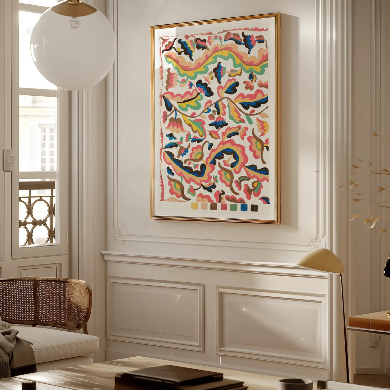 Dive into the vibrant world of Etna Wiswall's Colcha fine art print, a mesmerizing tapestry of color and form that bridges folk art traditions with modernist flair. This energetic composition bursts with undulating shapes and bold hues, inviting you to explore a rhythmic dance of blues, reds, and greens. Wiswall's innovative approach transforms organic patterns into a stylized abstract symphony, captivating viewers with its whimsical intricacies.