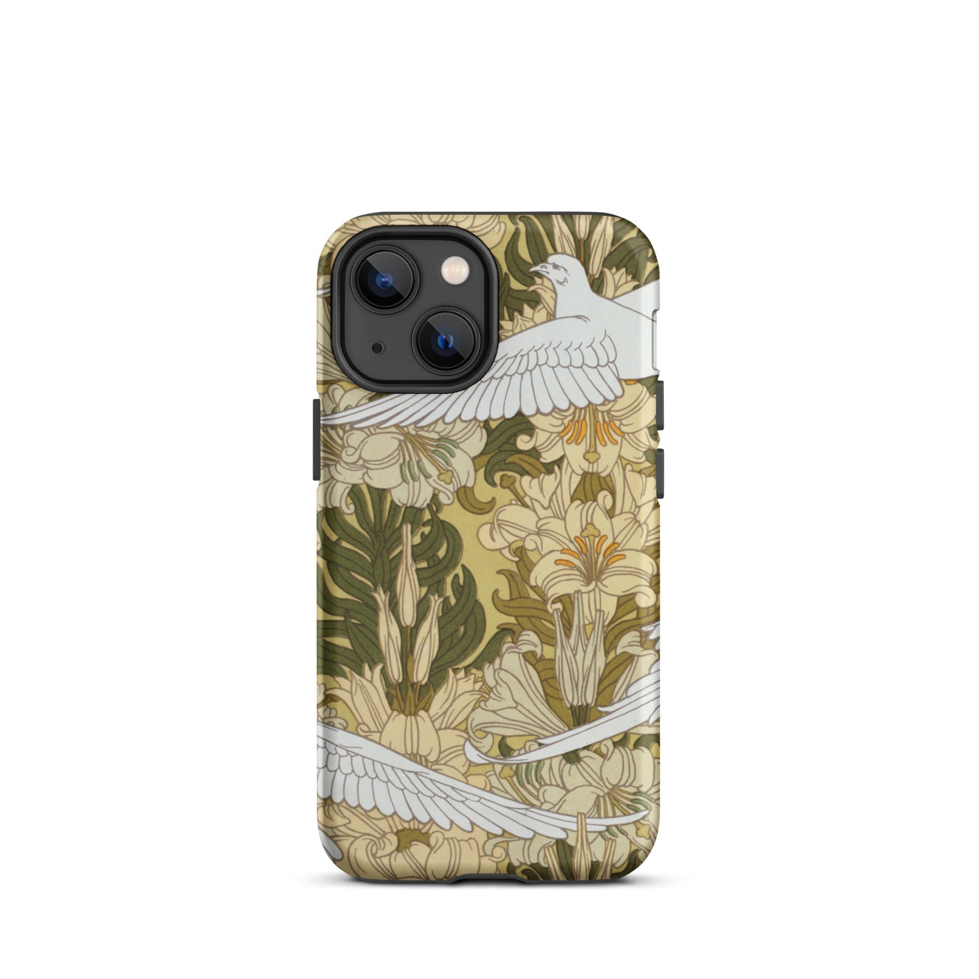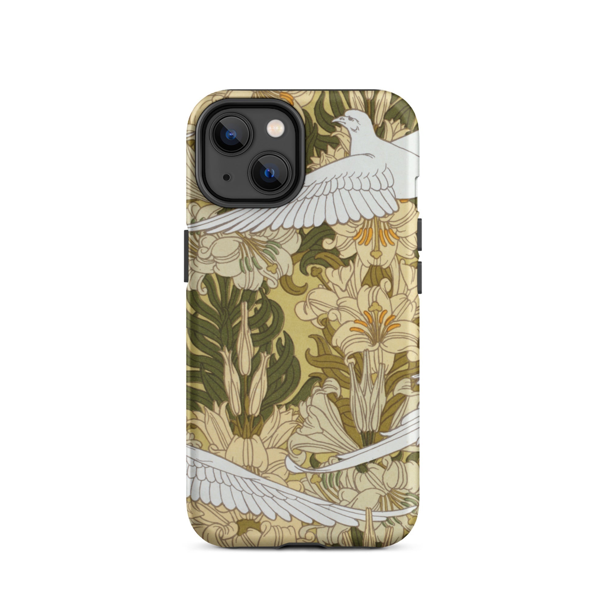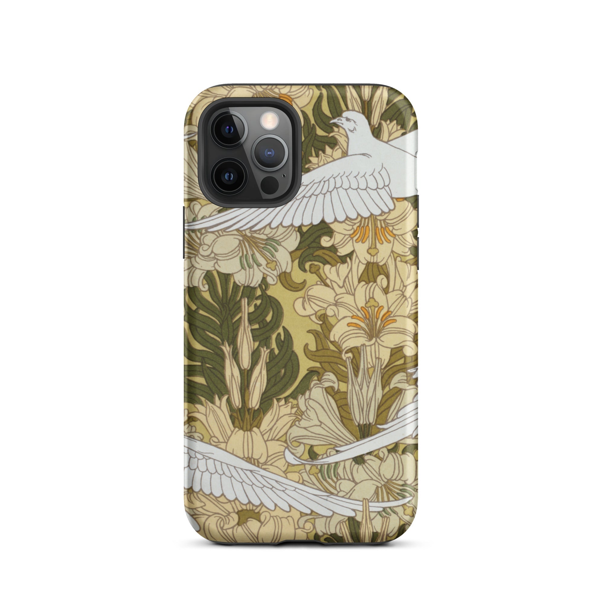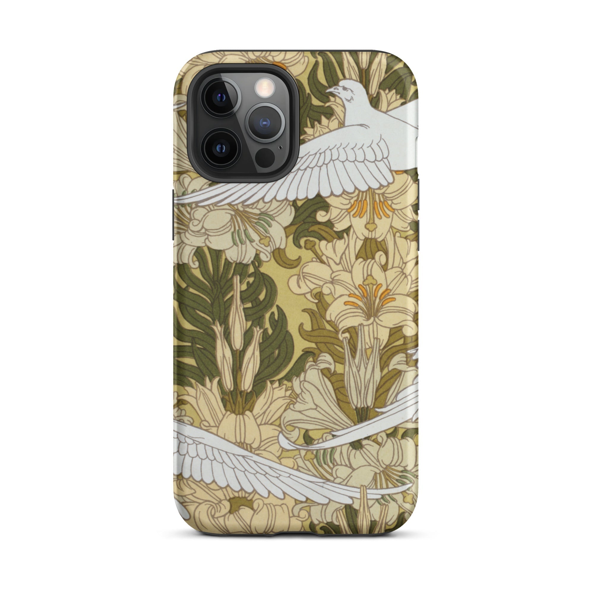 Cradle the essence of Art Nouveau in your palm with this 'Colombes et Lis' iPhone case. Verneuil's masterpiece transforms your device into a portal to the Belle Époque, where technology and nature entwine in harmonious rebellion against the industrial age. The case's surface blooms with a symphony of olive hues and ivory tones, as stylized doves navigate a labyrinth of sinuous lily stems.