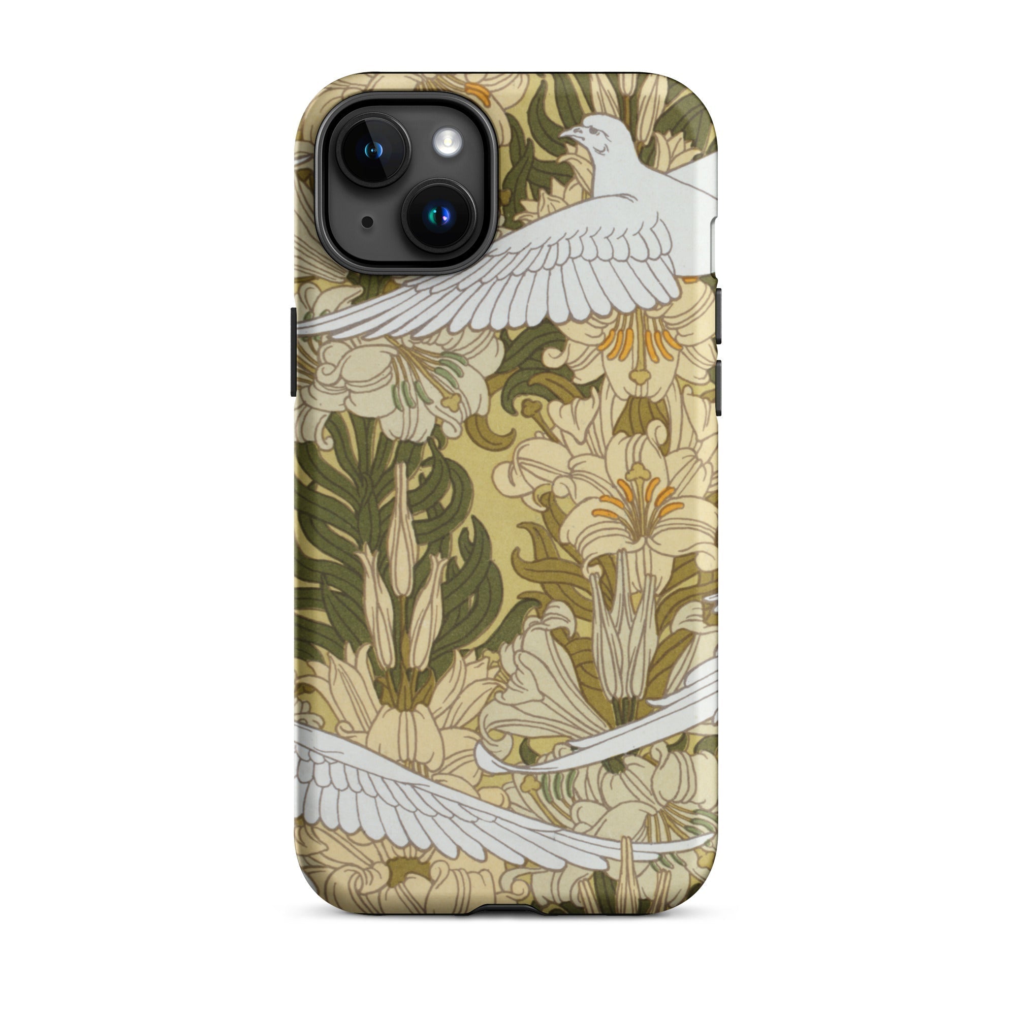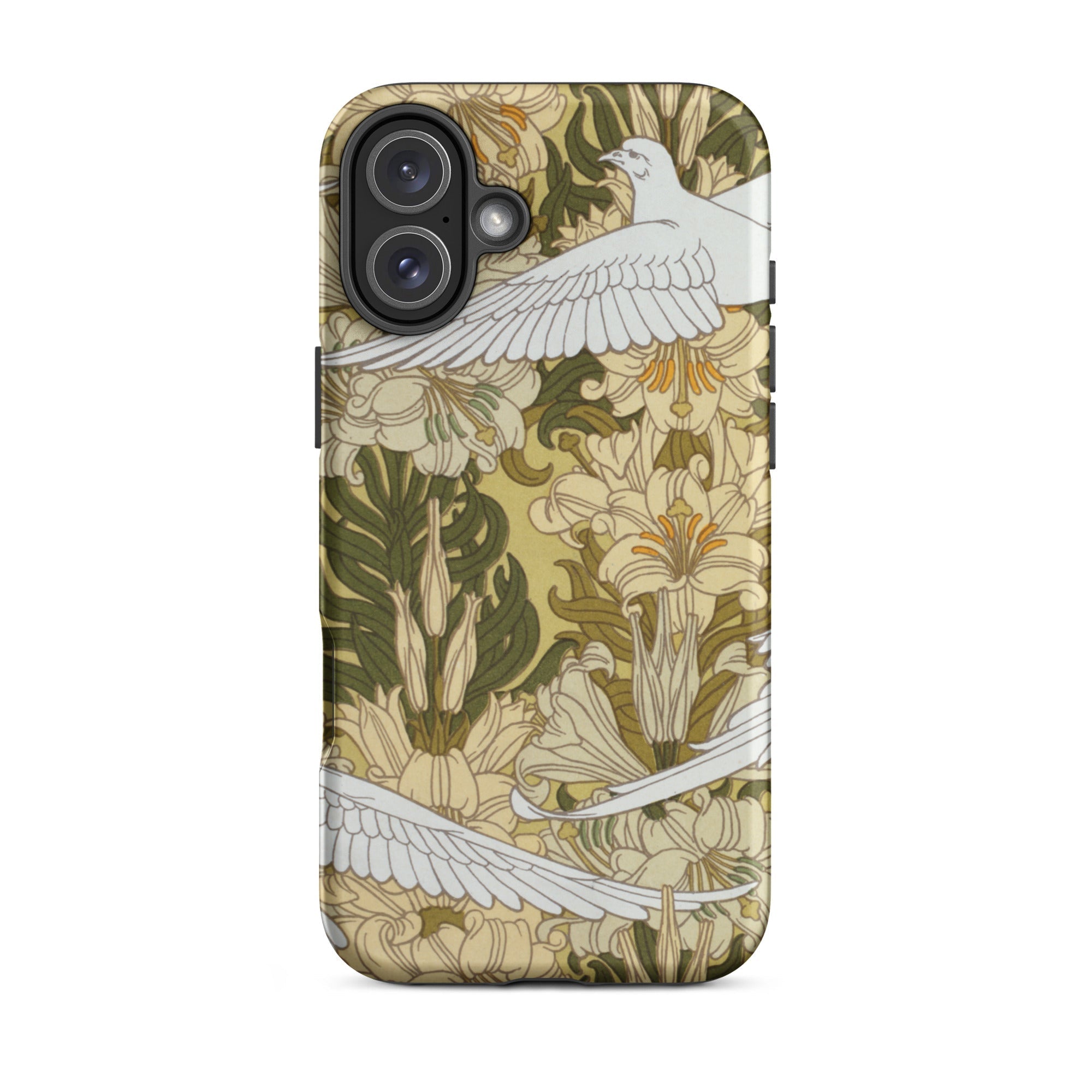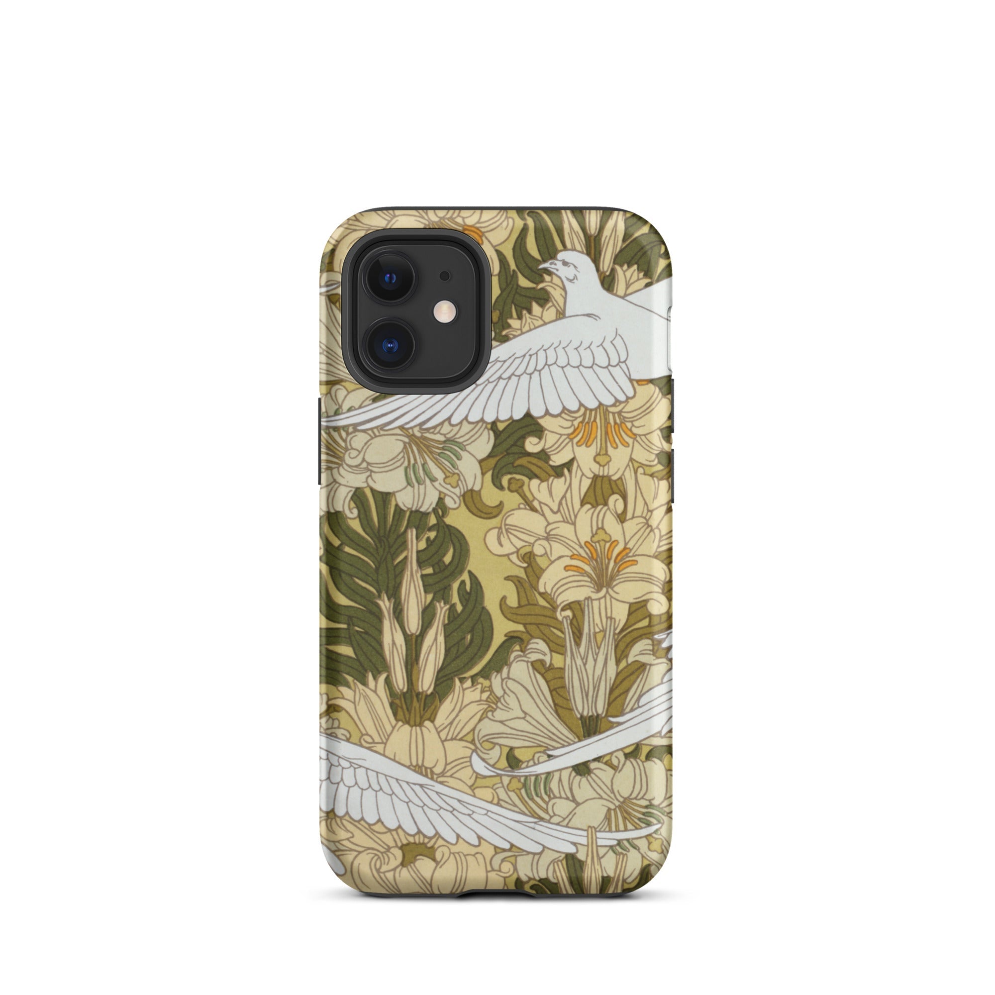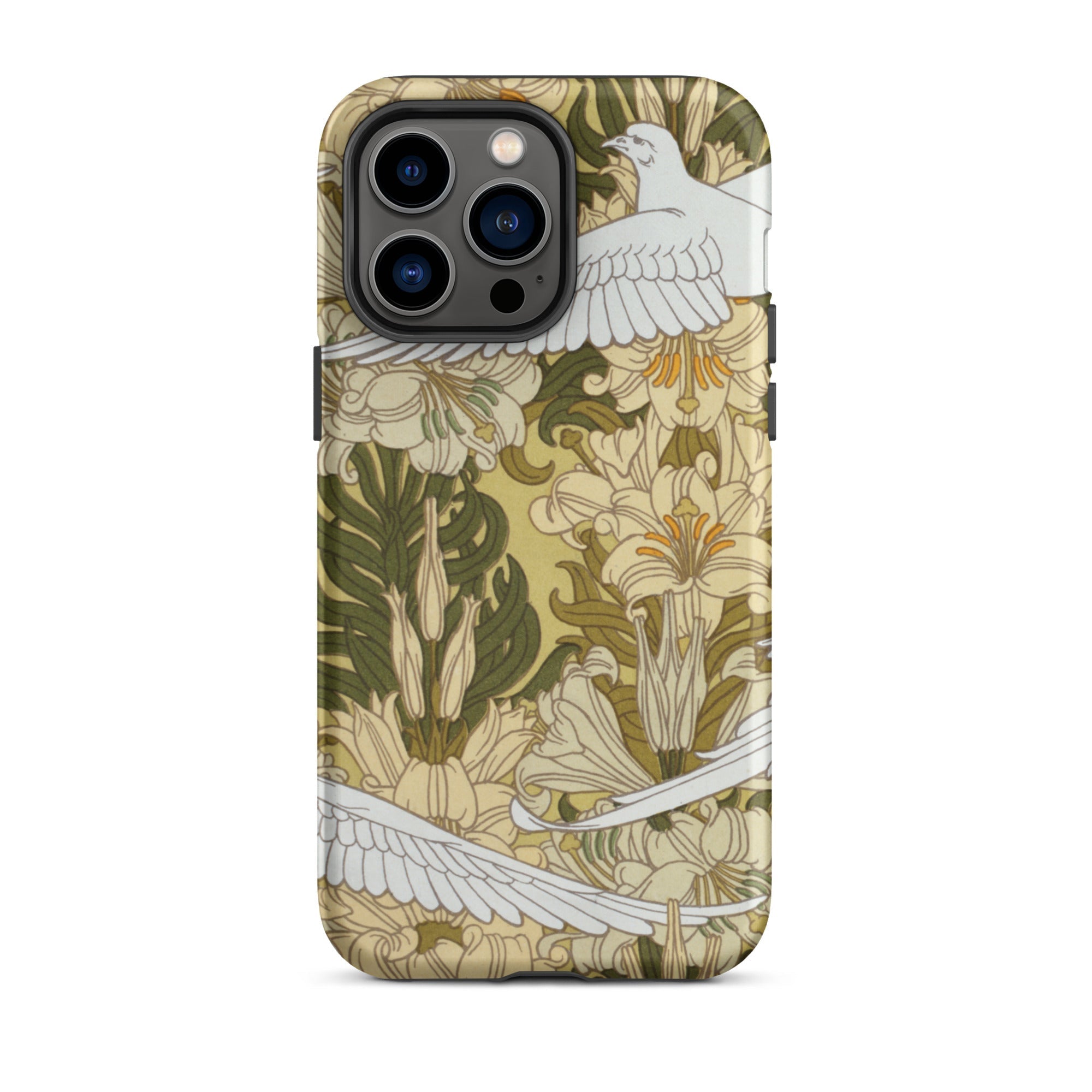 Cradle the essence of Art Nouveau in your palm with this 'Colombes et Lis' iPhone case. Verneuil's masterpiece transforms your device into a portal to the Belle Époque, where technology and nature entwine in harmonious rebellion against the industrial age. The case's surface blooms with a symphony of olive hues and ivory tones, as stylized doves navigate a labyrinth of sinuous lily stems.