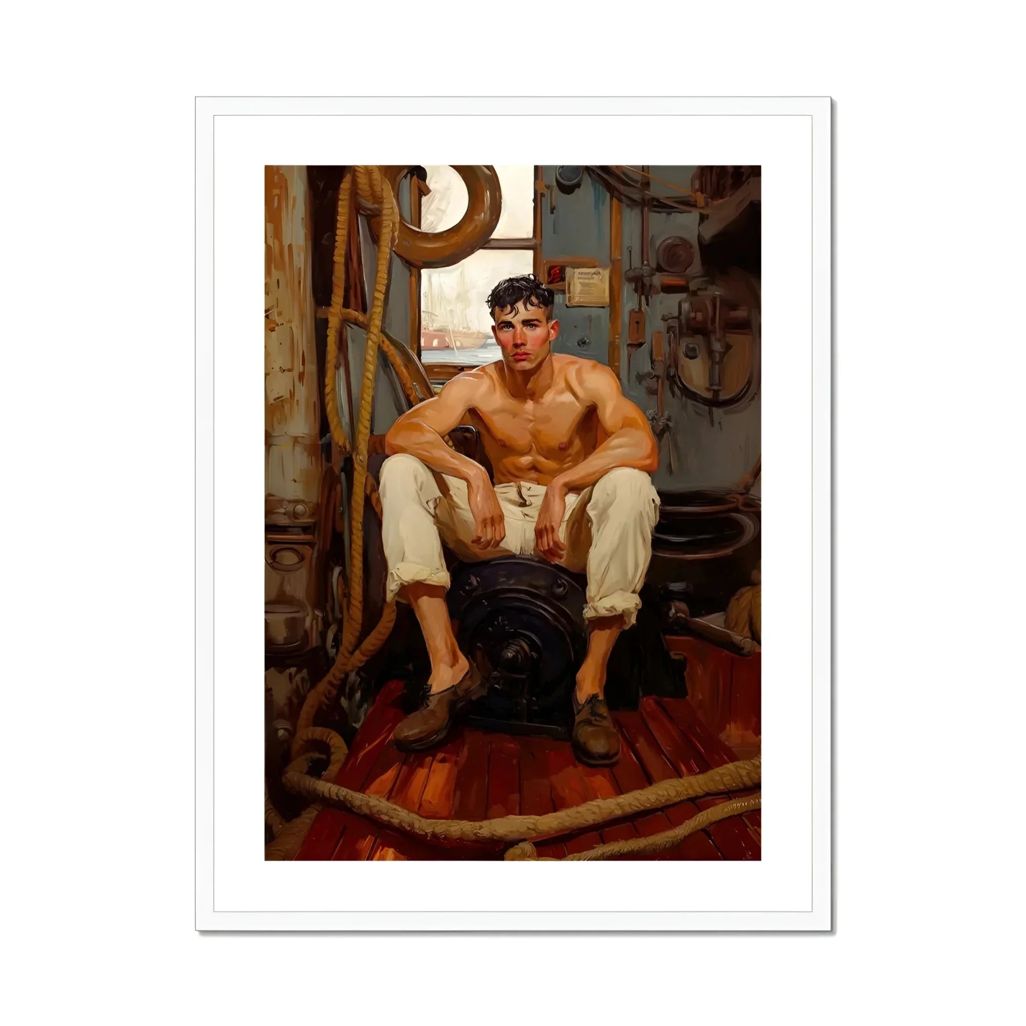You can feel the heat of the maritime air, the rope snaking beside him like a silent companion. There’s no mistaking the homoerotic tension here—the gaze of a sailor stripped down to his most vulnerable state, yet still brimming with power. His bare chest, broad and sun-kissed, speaks to a history of strength and resilience, but there’s softness in his face—a pride that hums beneath the surface.