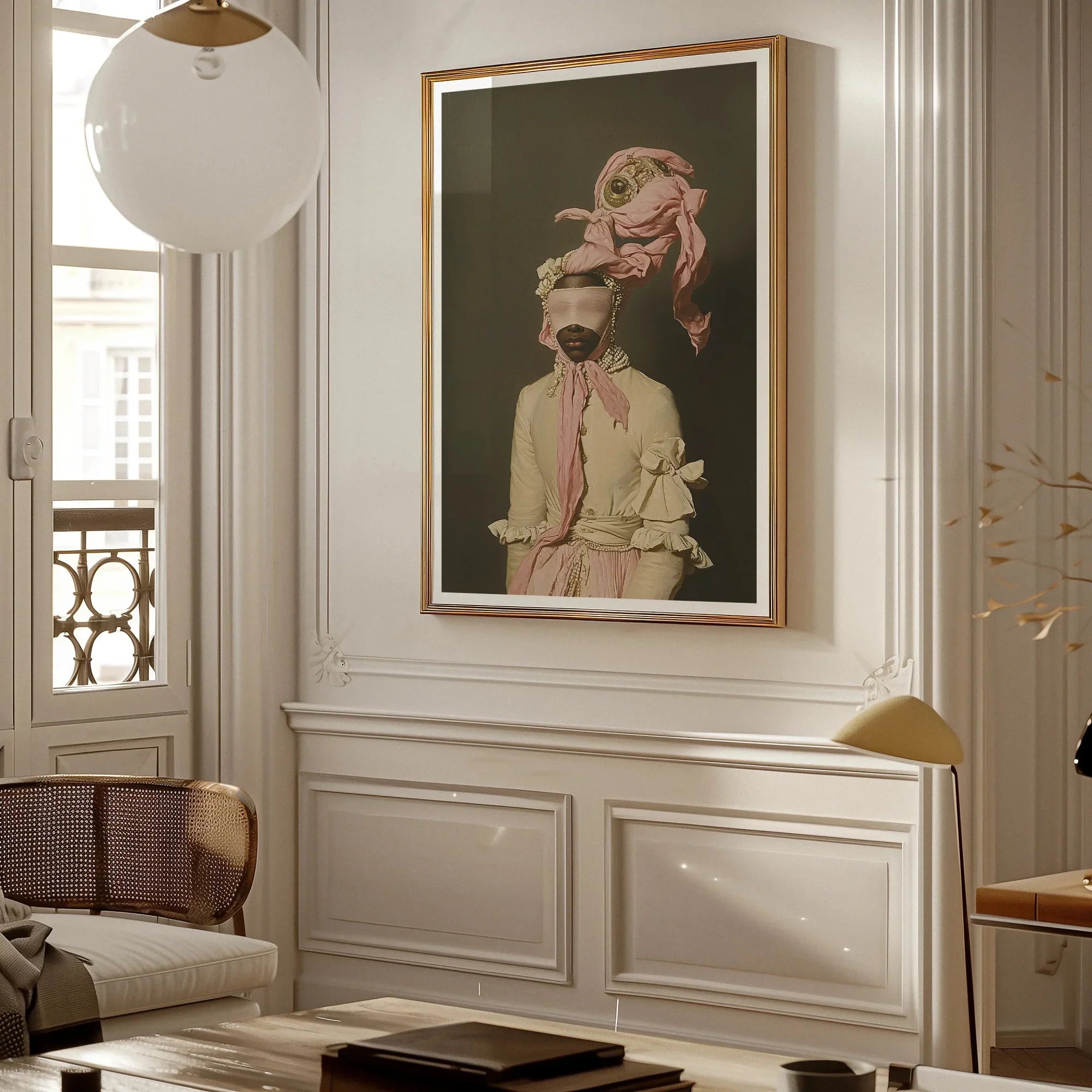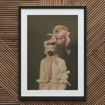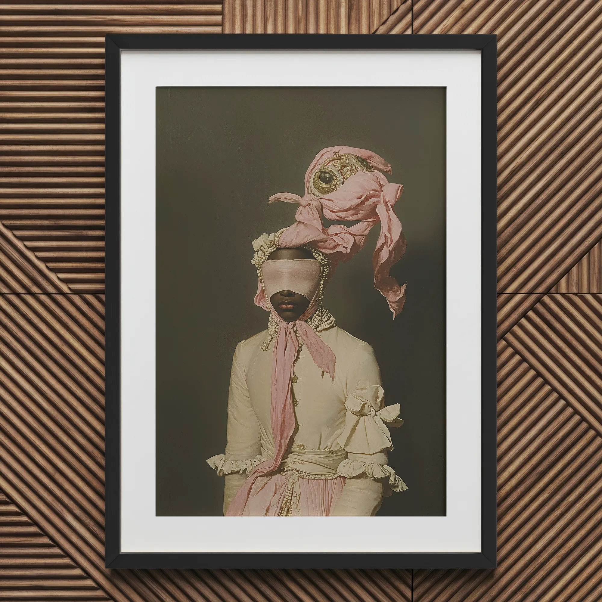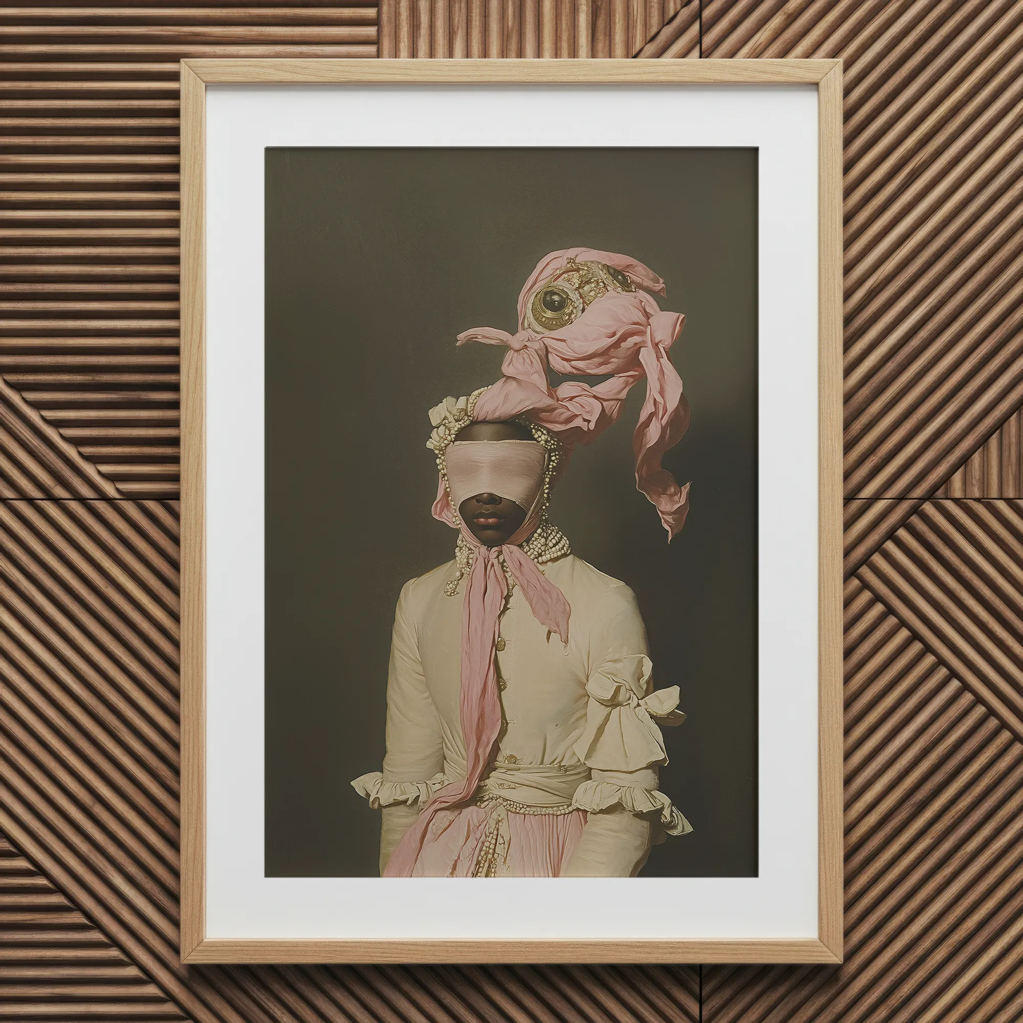 The pink sash unwinds—fluid, rebellious—as if it remembers the soft weight of ceremonial gele and the defiant posture of those who wore them in both celebration and survival. No passive embellishment, this silk ascends into a sculptural silk garment. A baroque surrealist headdress that refuses gravity’s logic. Crowned by a singular gilded eye. Watching—but not in judgment. In witness. A neo-baroque styling gesture: to see and be seen on one’s own terms.