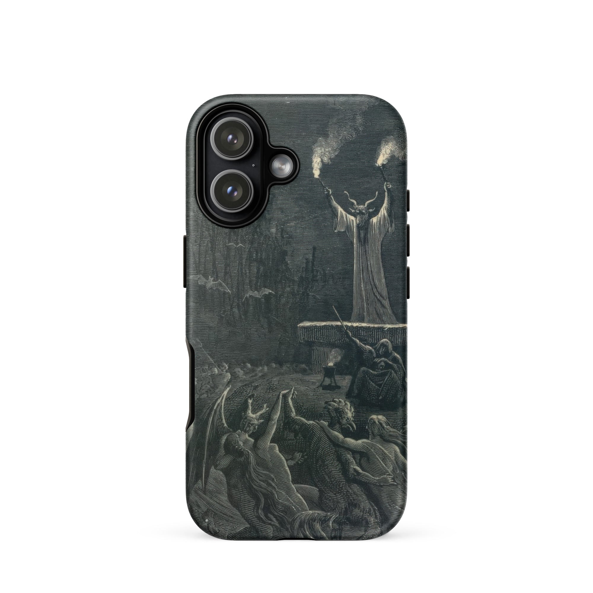 The iPhone case captures nineteenth-century engraving drama: Romantic horror fused with Gothic imagination, visionary printmaking steeped in the occult revival, etched textures vibrating with infernal energy. Bats flicker through the sky while monstrous bodies writhe in violent choreography, echoing witchcraft lore, Satanic ritual imagery, and literary inspirations from Dante to Milton.
