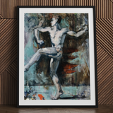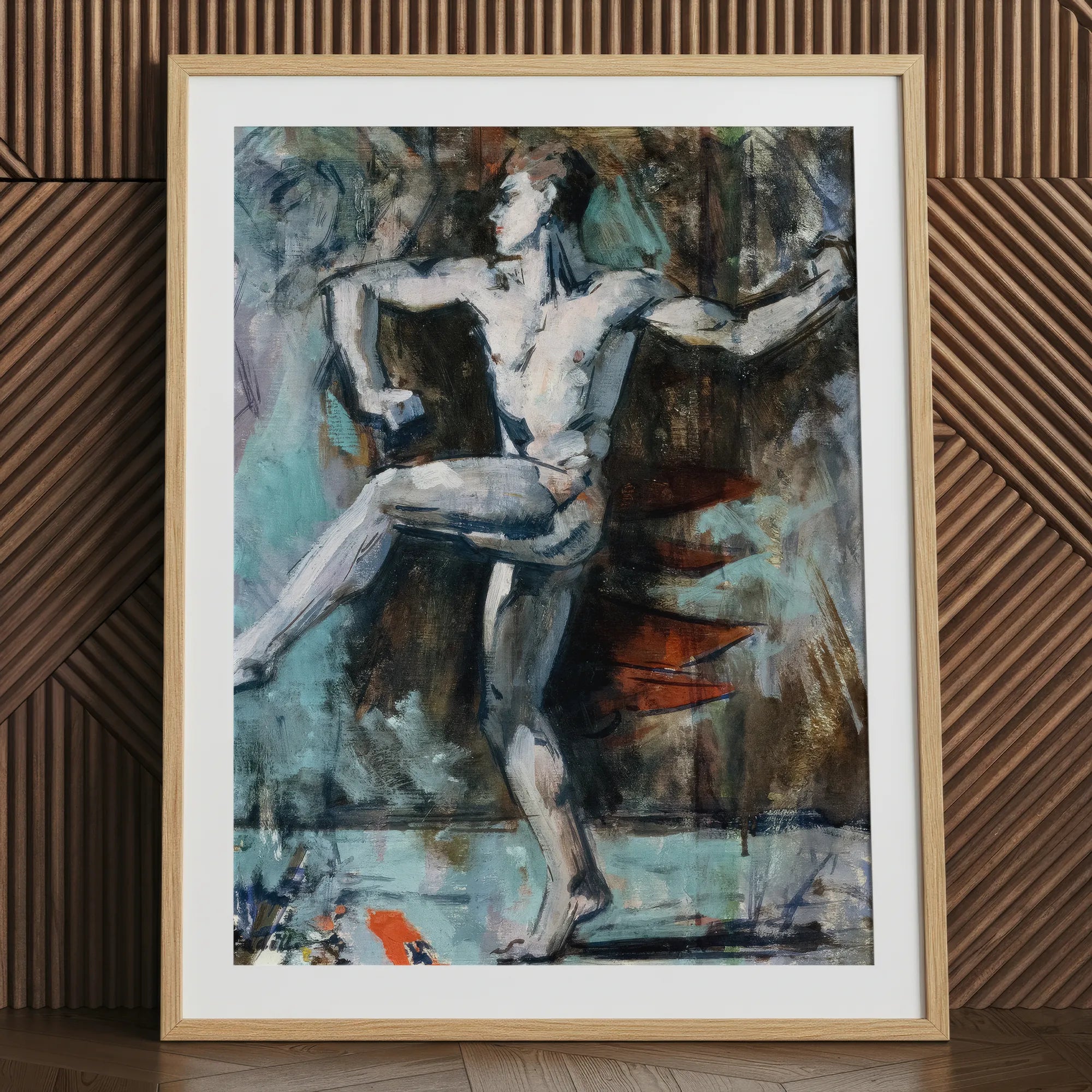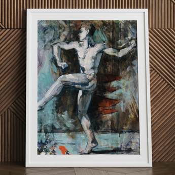 His lifted foot hovers inches above ground, a precarious equilibrium that carries a sense of pulse and breath. Behind him, broken planes of pigment suggest curtains, wings, perhaps the afterimage of performance.