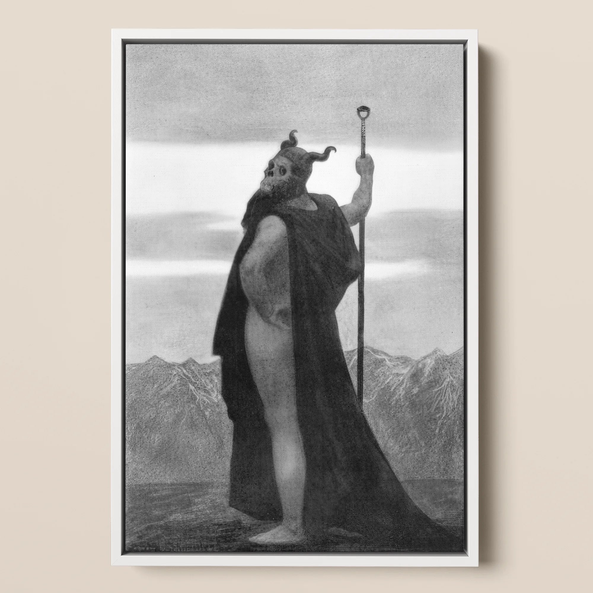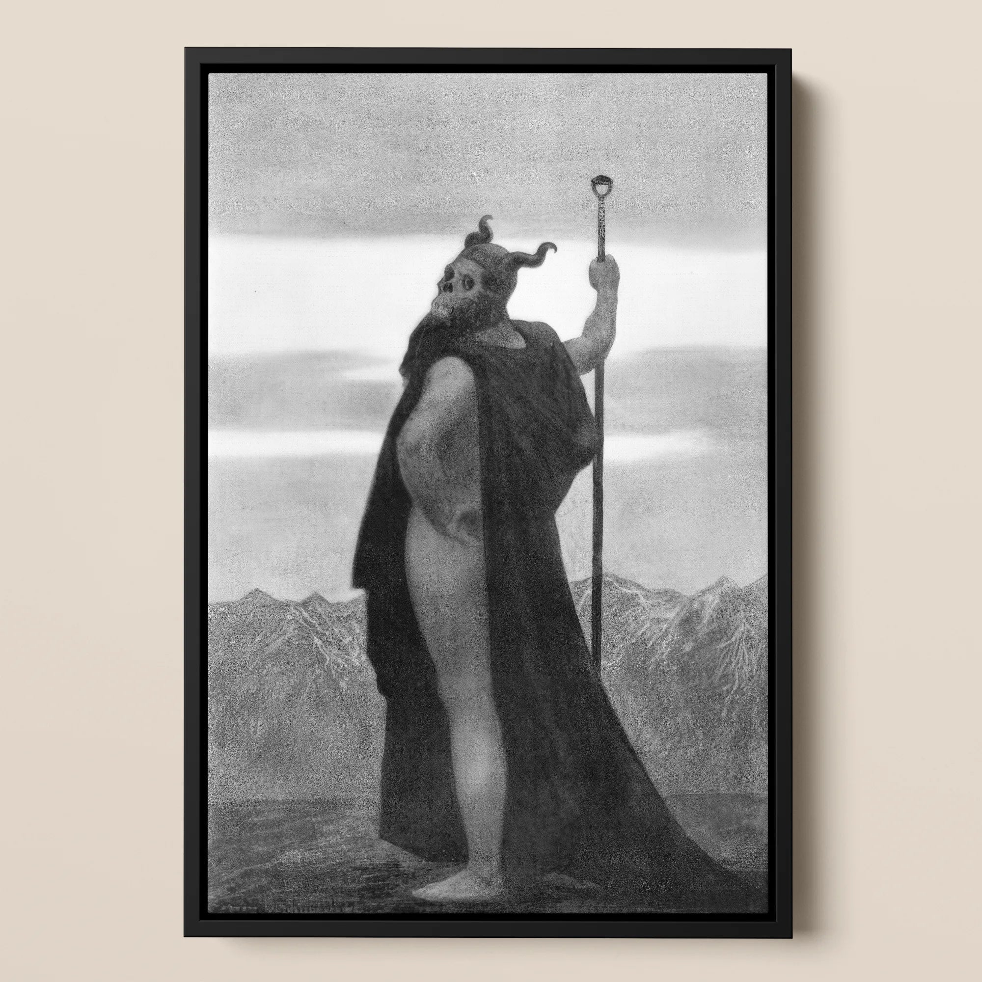 Schneider’s Death stages a rapture of strength — sinewed body haloed by mist, cloak coiling at his heel like spent shadow. The skull mask stares into light, half-god, half-specter, carved from the Nietzschean century’s fever for transcendence. His staff pierces the air, a measure of control over what consumes him.