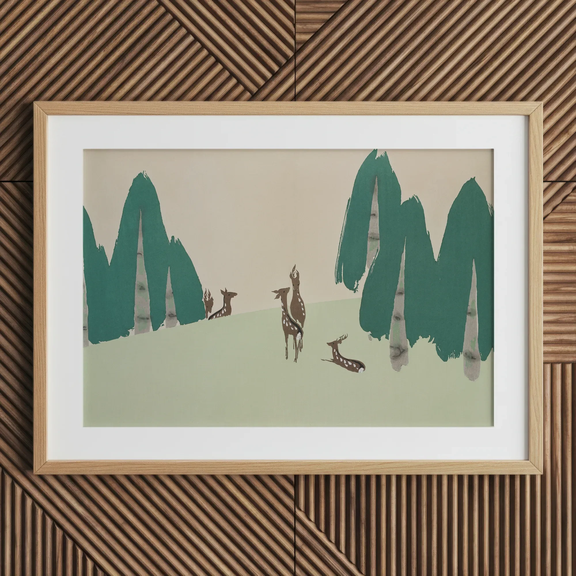 Five deer, shadow-quiet, stand and kneel beneath a hush of teal-green pine, where the sky pales into a soft nothing and time forgets its own name. Kamisaka Sekka’s “Deer” renders the forest not as habitat, but as threshold. Where form is suggestion, and silence moves in deliberate brushstrokes. The trees, abstracted columns of cool viridian, gesture like cloaked guardians; their trunks are birch-gray and slightly blurred, as if memory painted them.