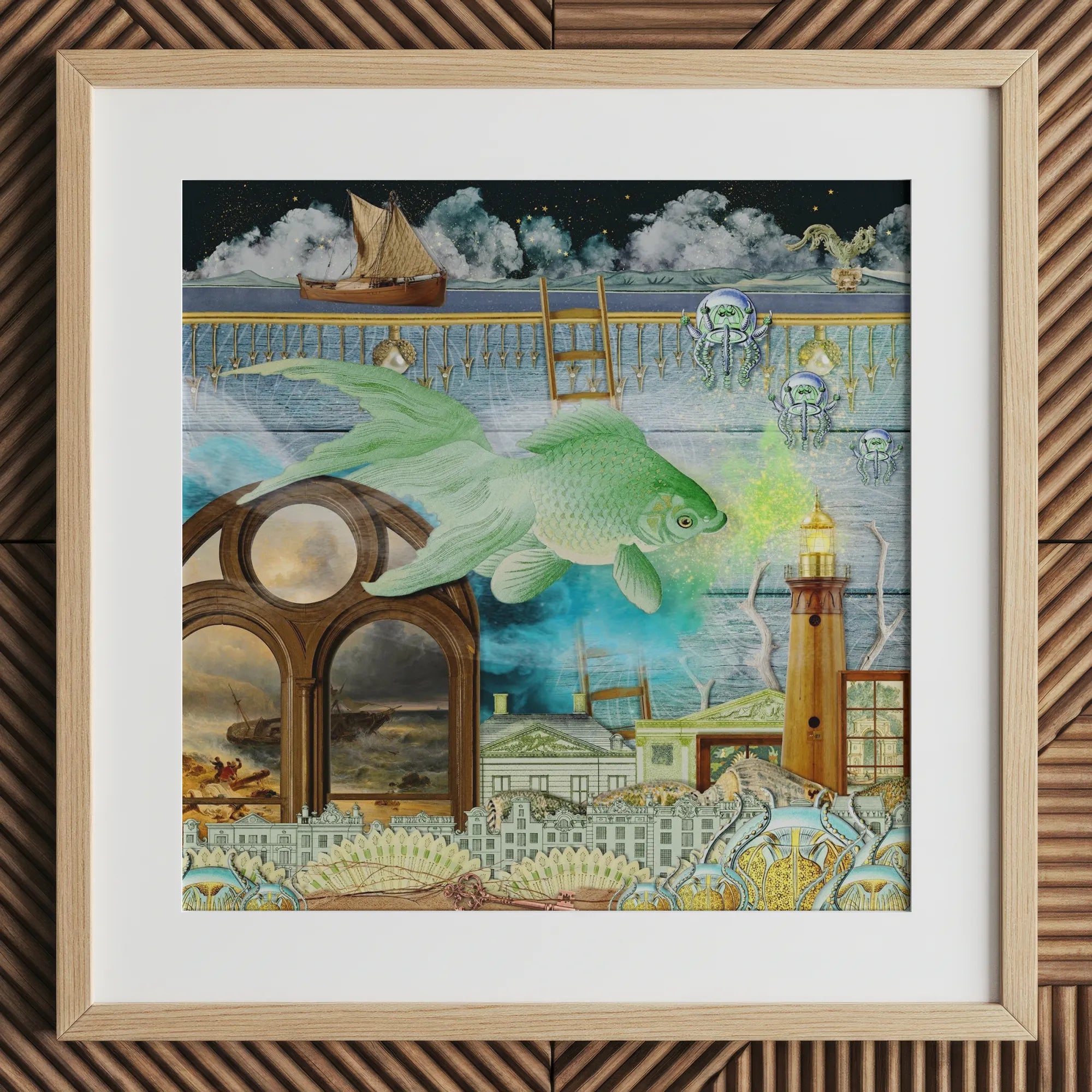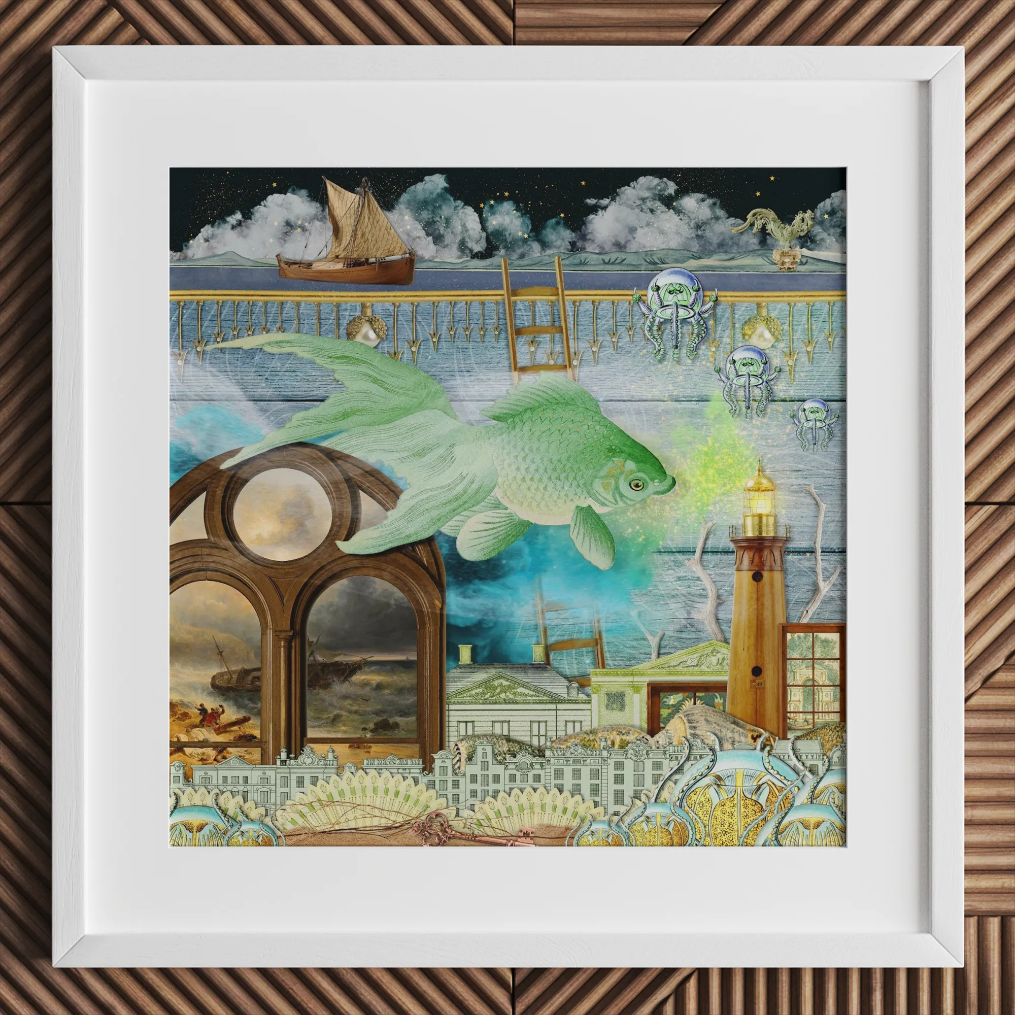Witness a colossal emerald fish, its scales gleaming with bioluminescent potential, as it glides past Victorian-era edifices submerged in an impossible aquarium. Alien jellyfish hover like extraterrestrial scouts, their crystalline domes refracting the glow of a stalwart lighthouse standing sentinel above.