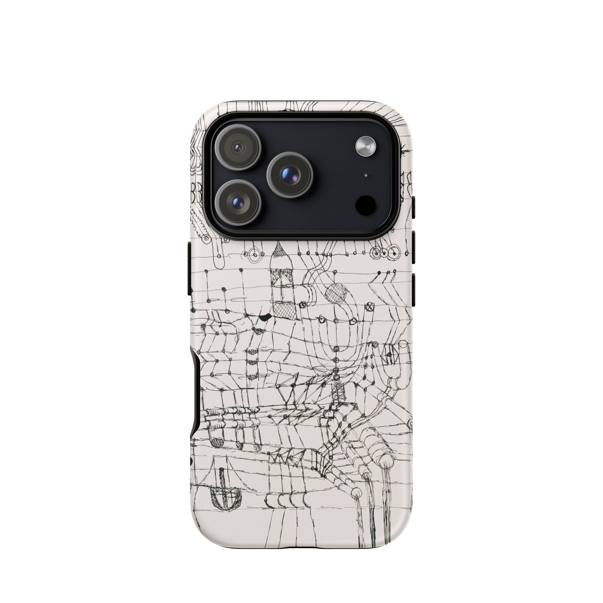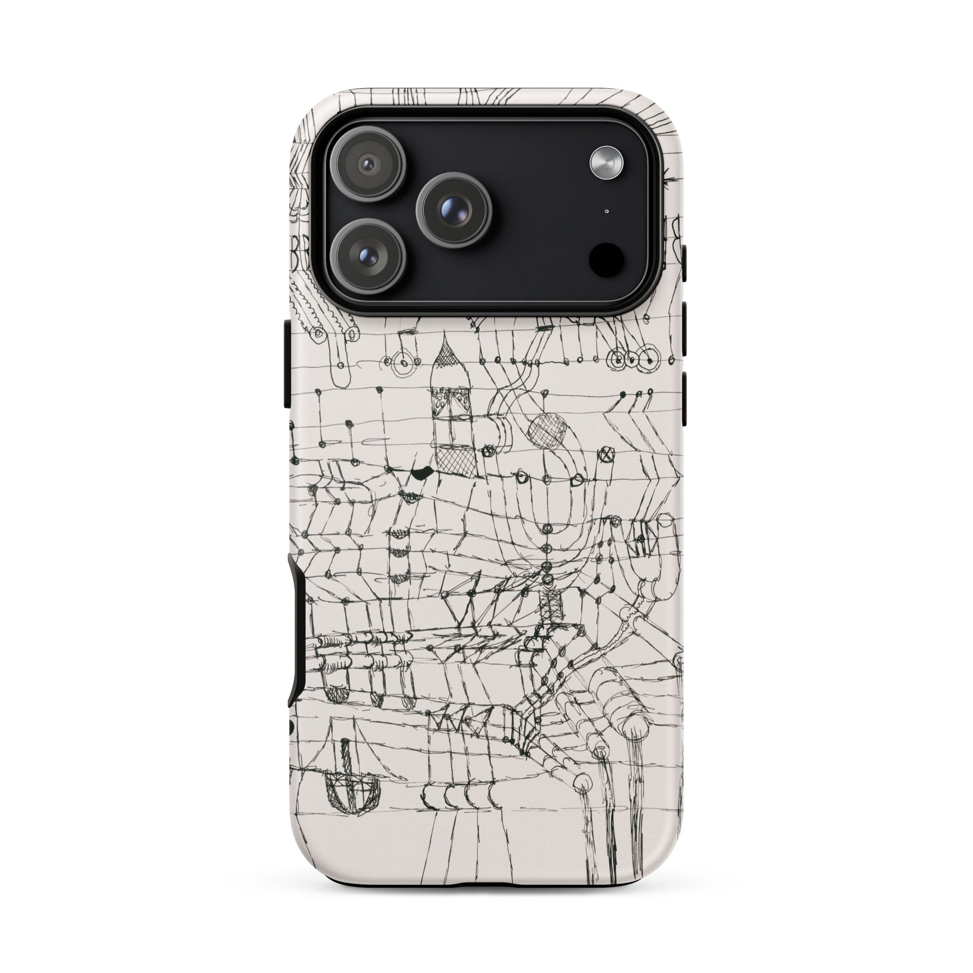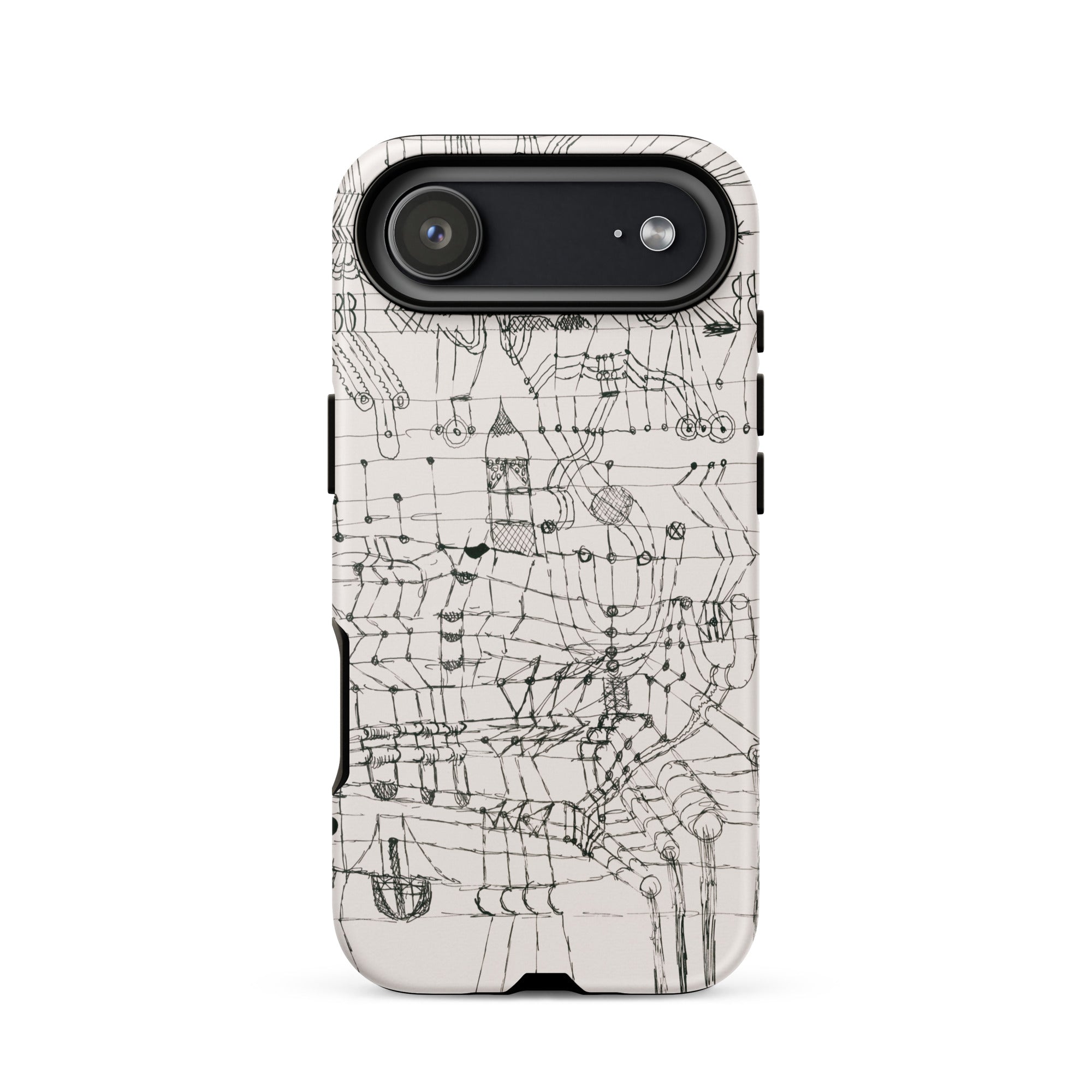 A surreal schematics of interwoven ink network spiraling into conceptual network map. It’s not a case. It’s a Klee diagram art relic—early modernist ink on paper reanimated as a Bauhaus mobile accessory. Machine-human hybrid motif encoded into wearable notation.