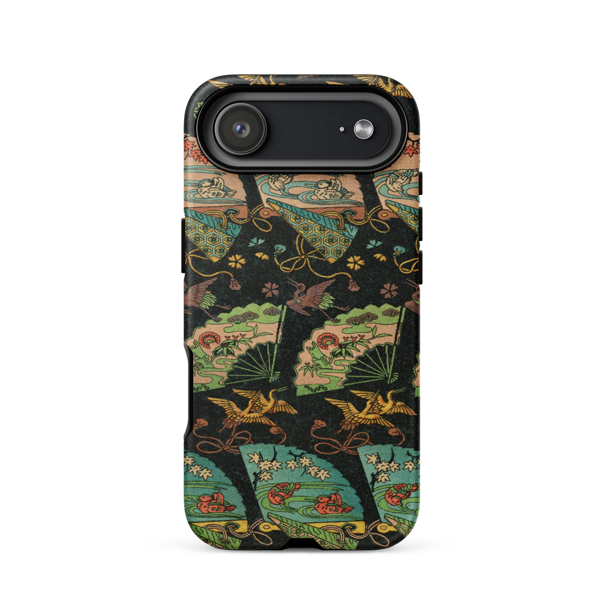 A rich tapestry of Japanese artistry, this phone case design channels the timeless elegance of Meiji-era textile patterns. Hand fans (uchiwa) unfold in tessellated symmetry, each revealing serene microcosms: ducks gliding through rivers beneath crimson maple leaves, and verdant landscapes bloom with flora of all sorts. Golden cranes fly between these fan vignettes, their wings poised in mid-flight, symbols of eternal grace and good fortune.