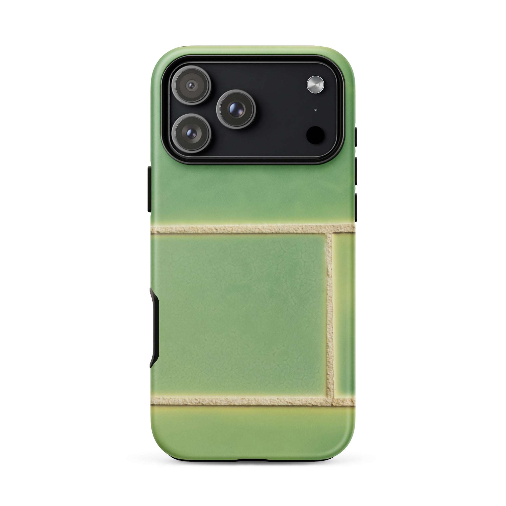 Emerald tiles shimmer, a portal to urban dreams. Your iPhone, now clad in industrial chic, transforms into a sleek mosaic of possibility. Modernist geometry meets organic allure, as jade-hued squares dance with sandy grout lines. This case isn't just protection; it's a statement piece, whispering tales of cityscape evolution and architectural prowess.
