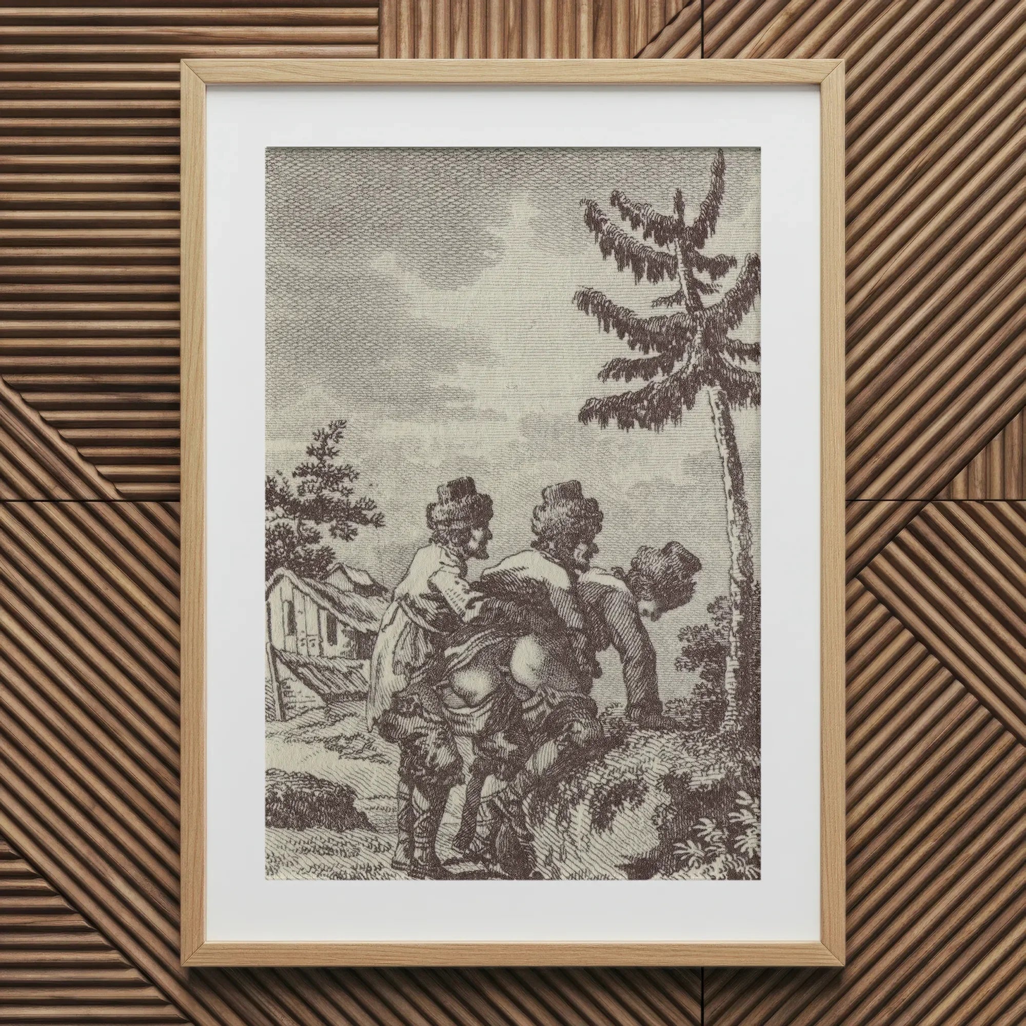 Published under false imprint, it carried philosophy disguised as filth. The sparse tree, the leaning roofline, the barren ground — all whisper complicity between nature and desire. In its stark candor, this engraving strips illusion of virtue until only appetite’s logic endures.