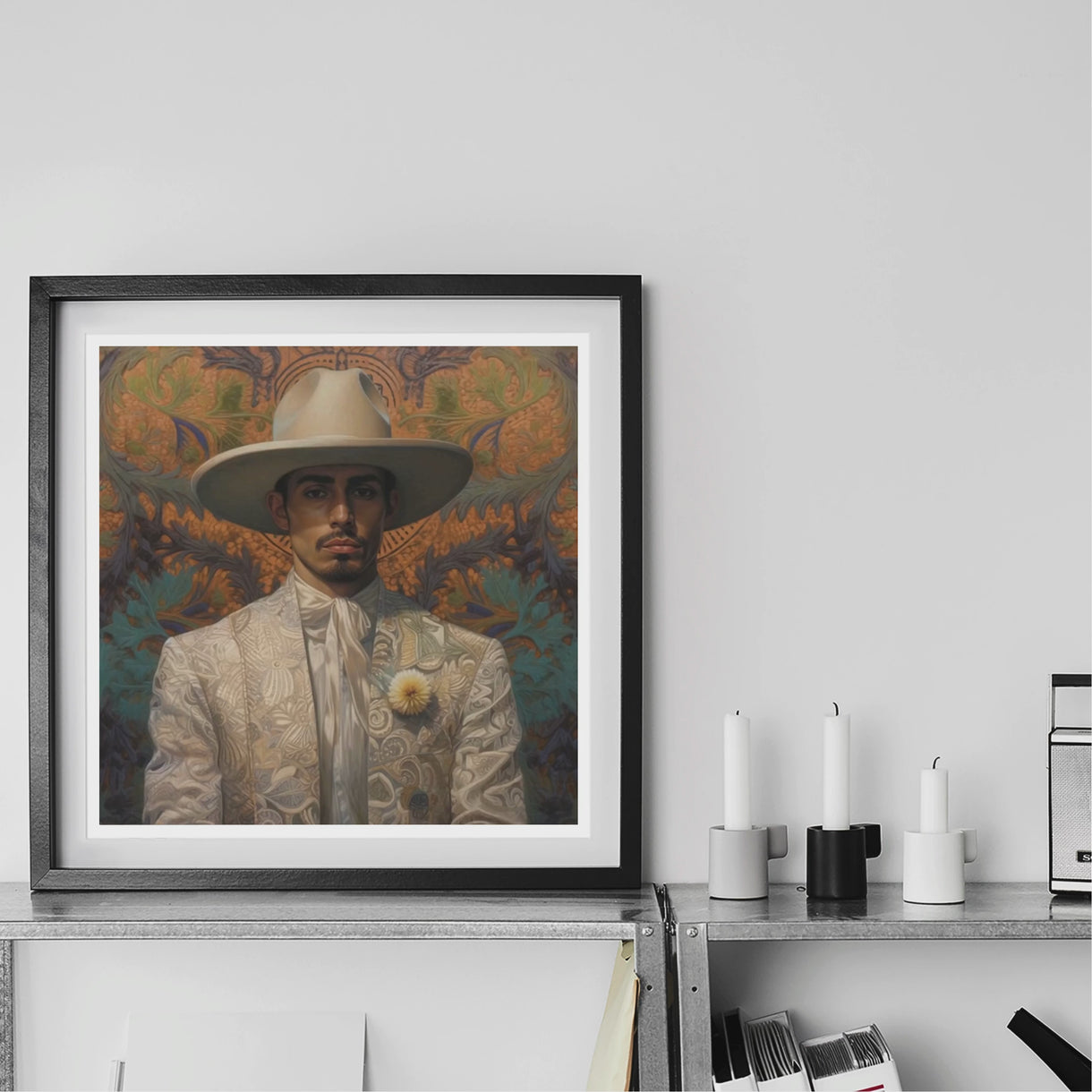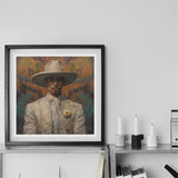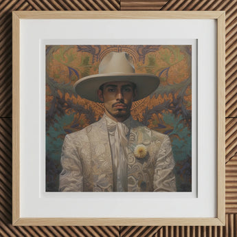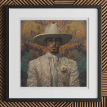 The background does not simply frame him; it breathes with the echoes of mestizaje and resistance, its swirling botánica inspired by exvotos and milagros, with baroque flourishes curling like whispered confidences. Estephan does not ask for permission to exist. He is already legend—a jinete of subversion, a sacred outlaw, an undying ember of queer Latino vaqueros blazing against the night before riding at dawn.