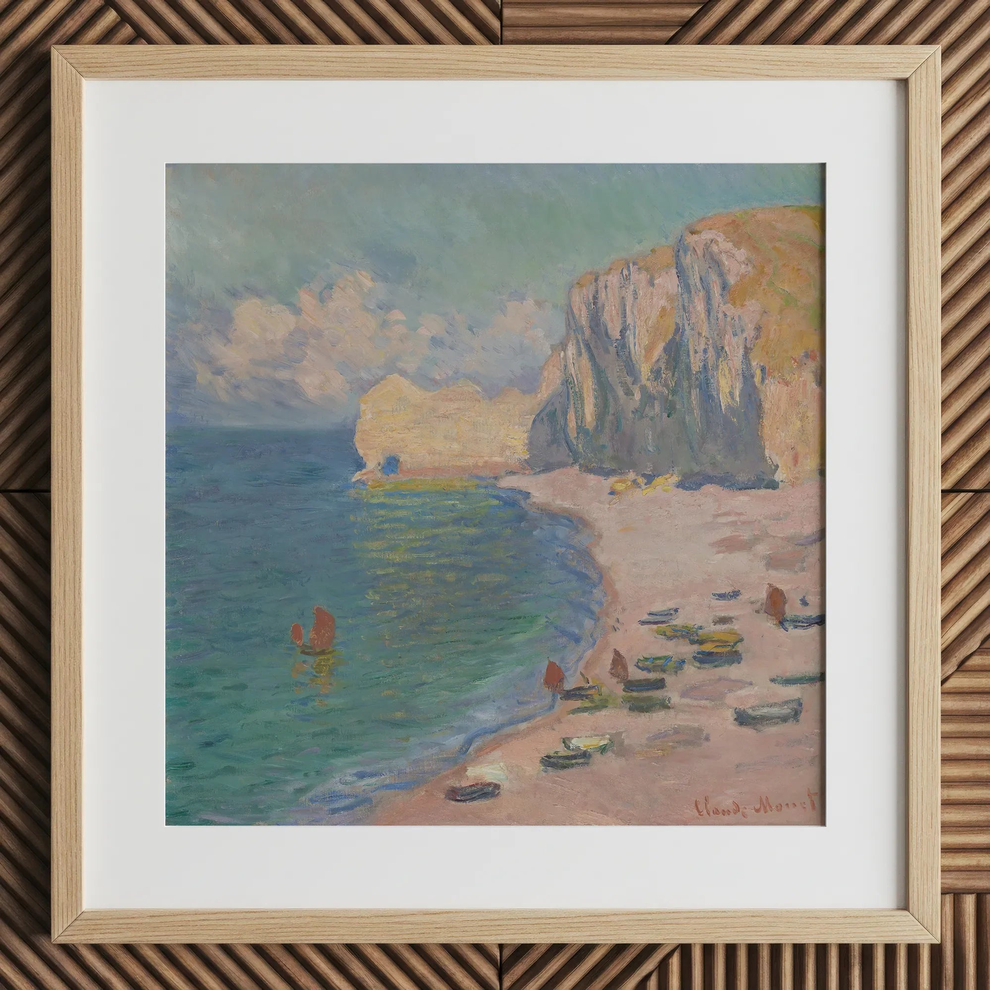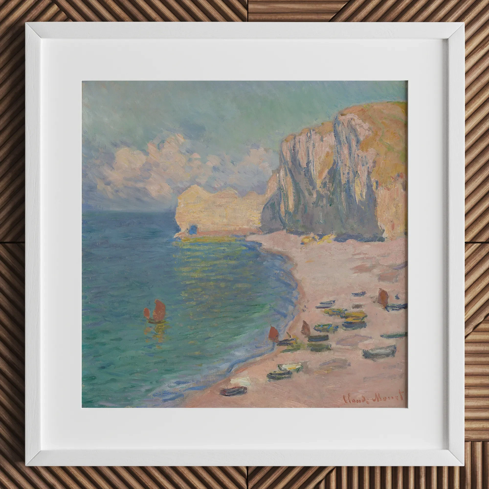Watch as gentle waves caress the sandy shore, their rhythmic pulse echoed in the artist's undulating strokes. Tiny boats pepper the beach, inviting you to embark on imaginary voyages. The iconic Falaise d'Amont looms majestically, its weathered face a silent witness to centuries of tides and time.