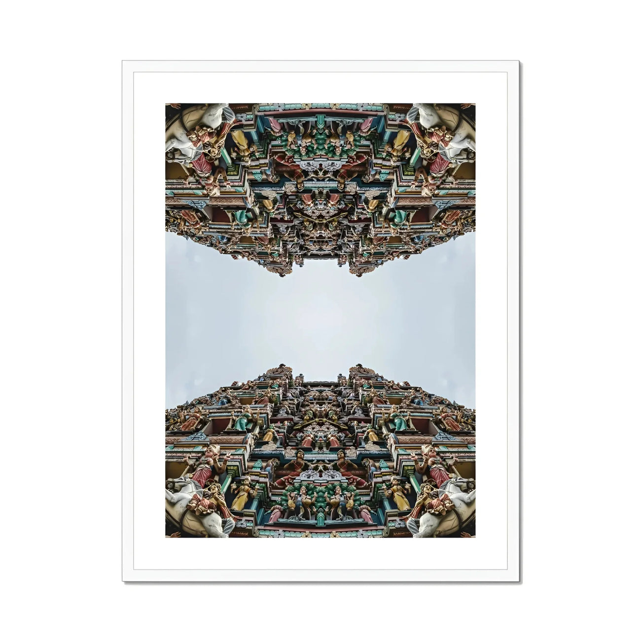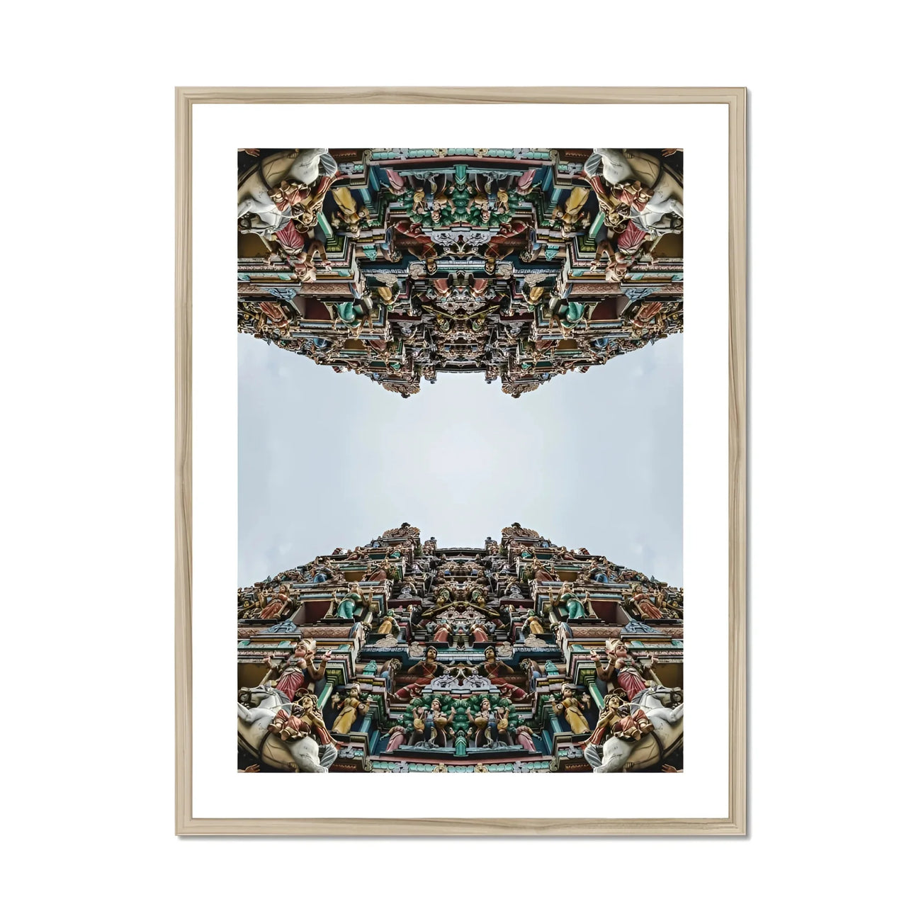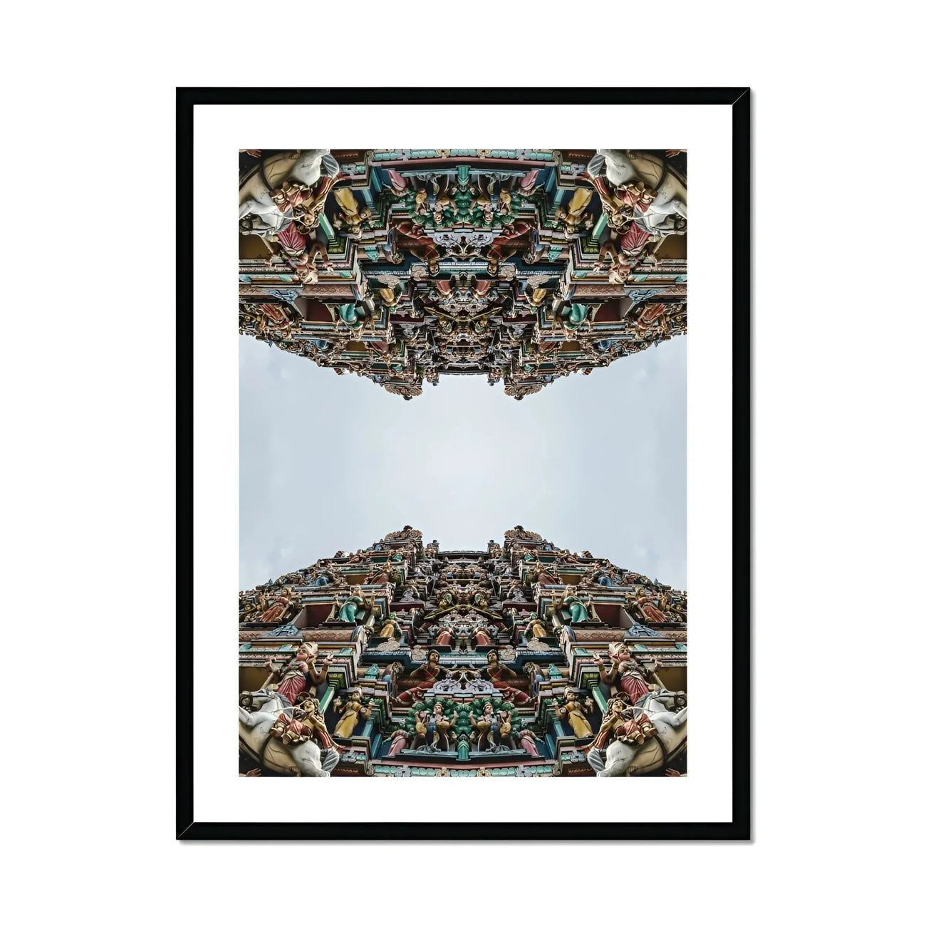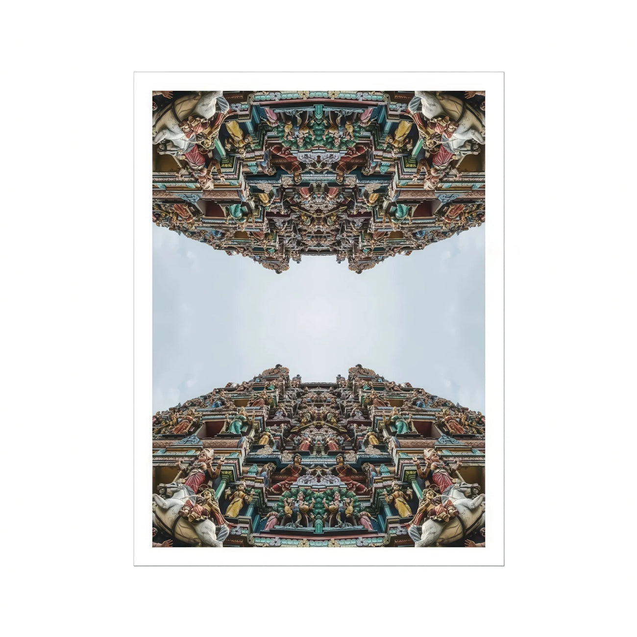 The print's hypnotic symmetry, created by mirroring the gopuram's intricate carvings, evokes the concept of darshan - seeing and being seen by the divine. Your eyes will traverse tiers of deities, each sculpted figure a portal to ancient myths and cosmic truths.
