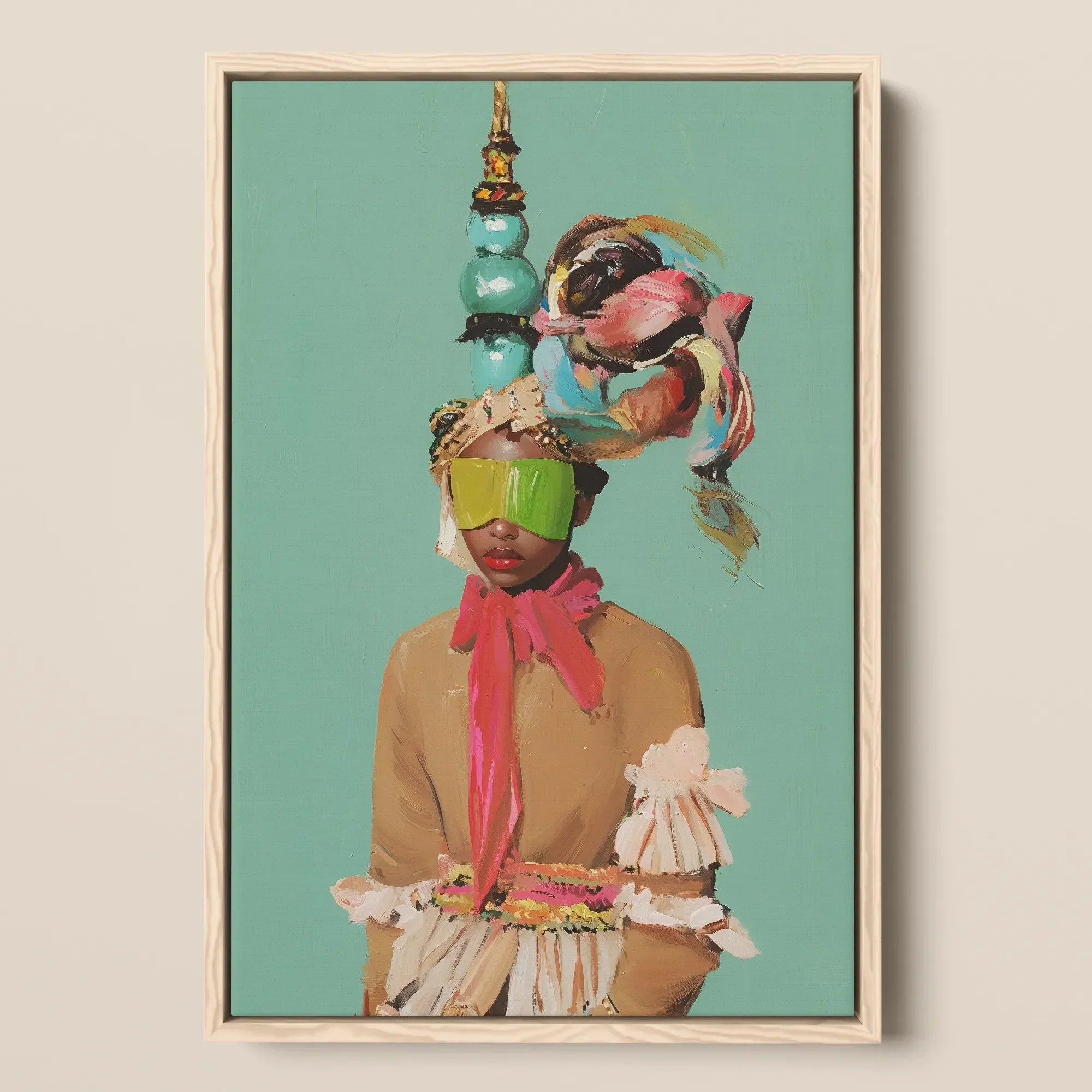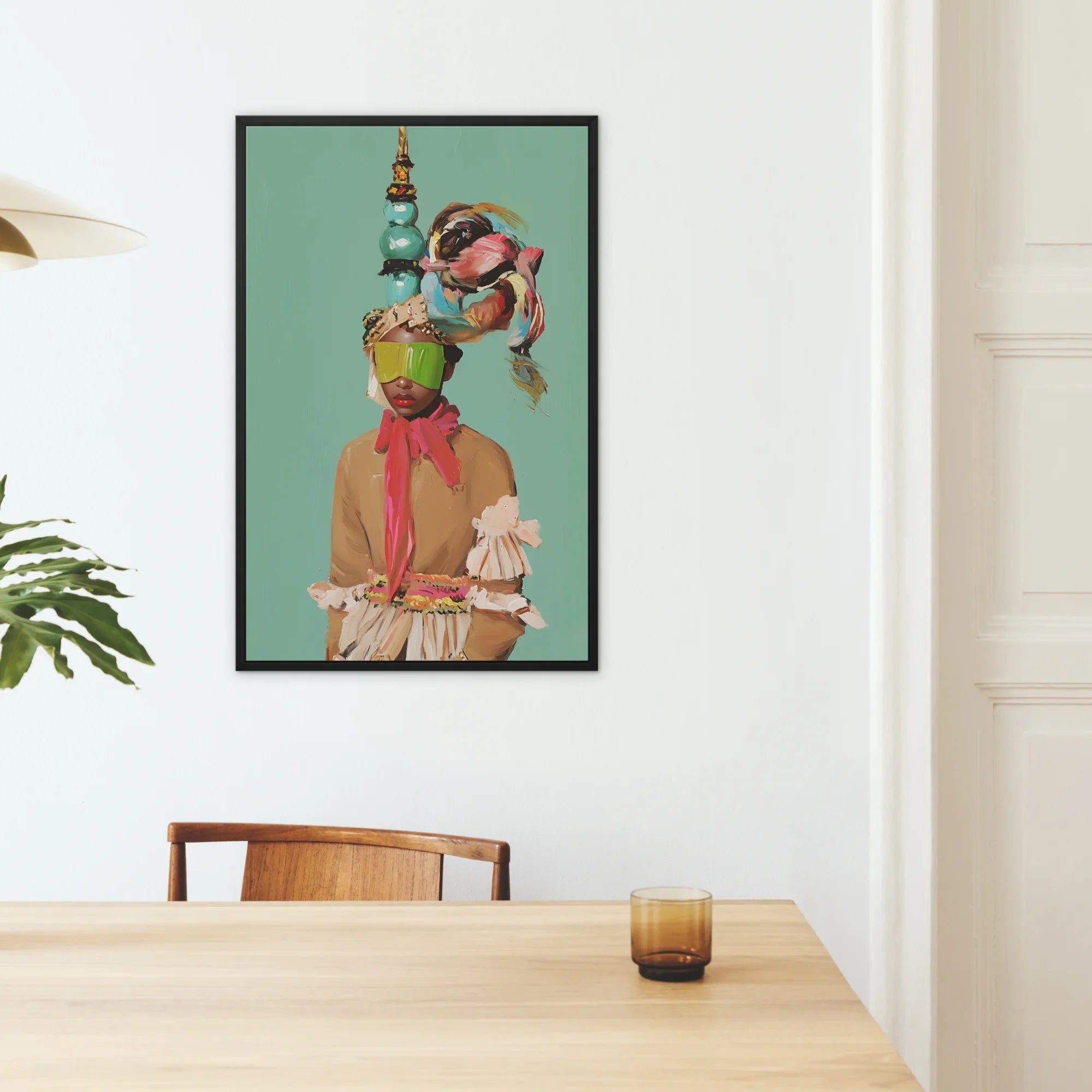 Draped in avant-garde fashion that defies gravity. Crowned with a headdress that could summon gods or disrupt dimensions. She is a vision pulled from the space between myth and futurism. The framed canvas captures her mid-metamorphosis, caught between realms—an avatar of Black surrealism and haute couture revolution.