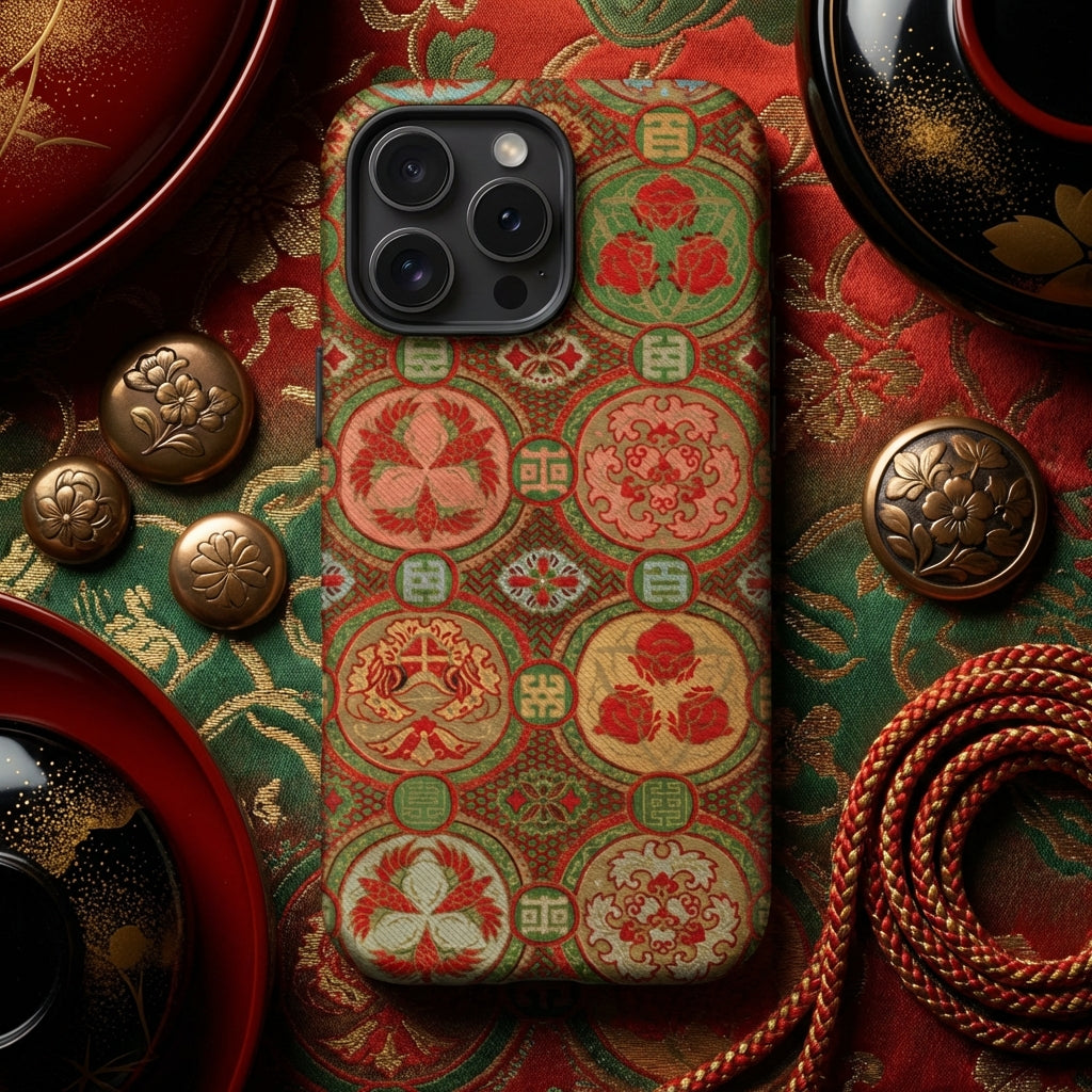 The Fan Pattern iPhone case immerses the viewer in a symphony of Victorian textile art and East Asian-inspired patterns. Each medallion is a world unto itself—delicate lotus flowers bloom as emblems of purity, while the shou symbol radiates longevity, its geometry anchoring the design in timeless balance. Intricate medallion patterns ripple across the surface, like fragments of celestial motifs mapped onto a rich tapestry of emerald lattice and crimson flourishes.