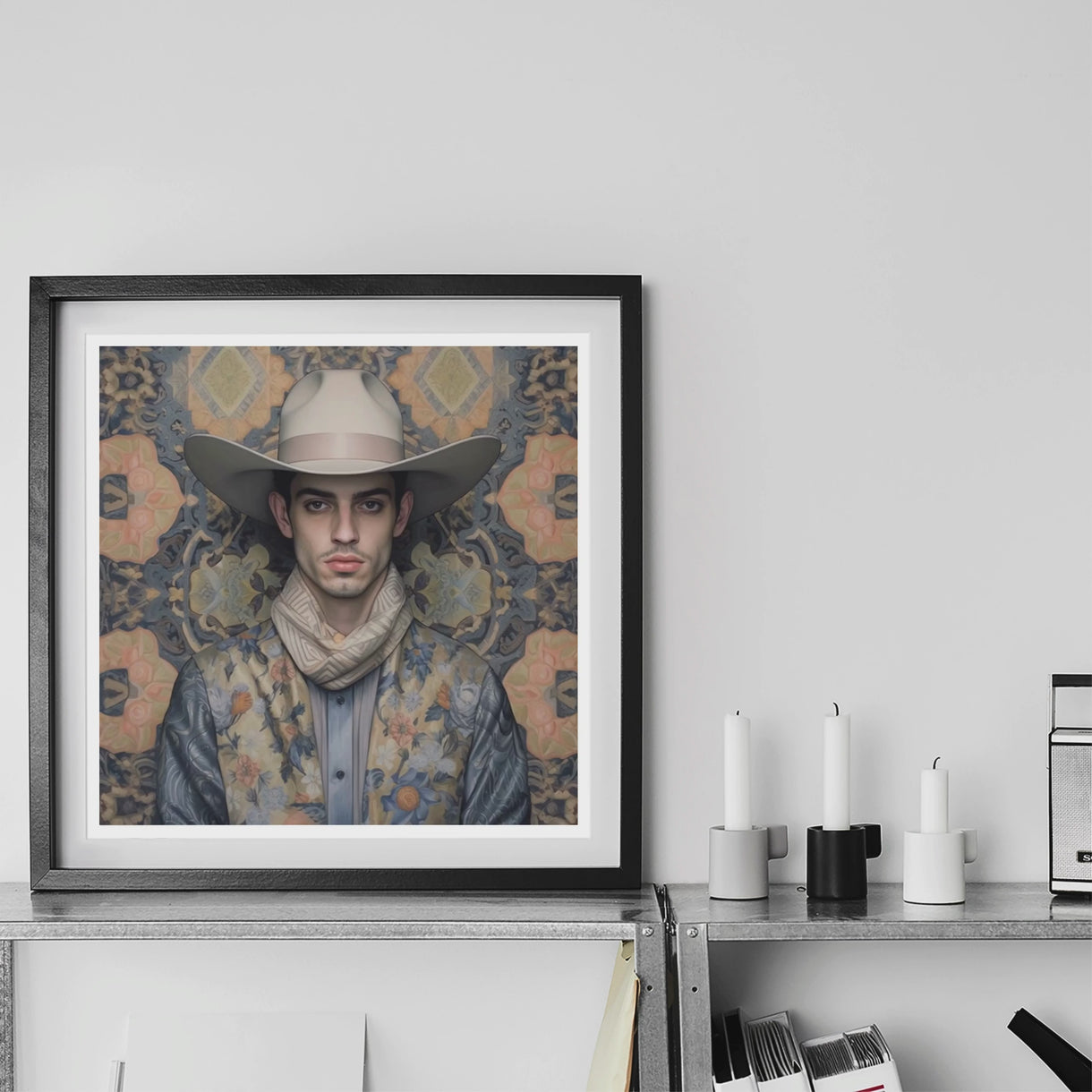 Farzad stands at the crossroads of East and West, his presence a bold reclamation of identity. This Arabic gay cowboy captures a man who defies convention—a desert rose blooming in the vast frontier of this fine art print. His unwavering gaze carries the weight of histories untold, whispering of queer Bedouin poets and Sufi mystics, of caravans that traced constellations across Persian sands.
