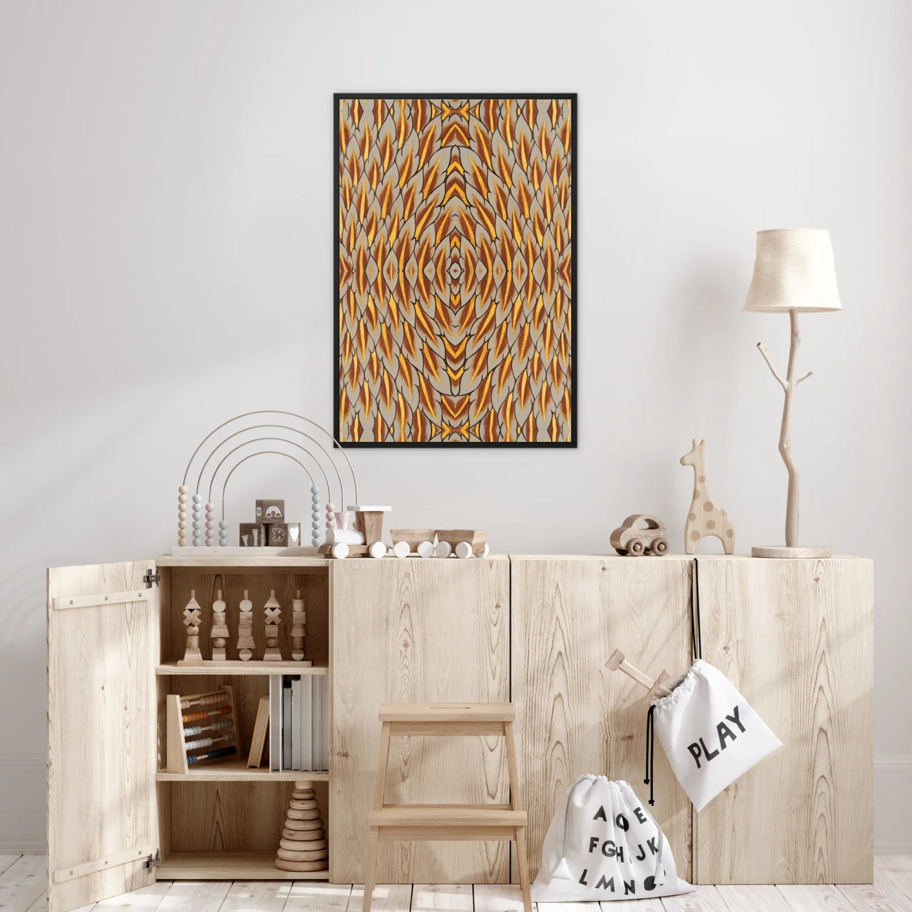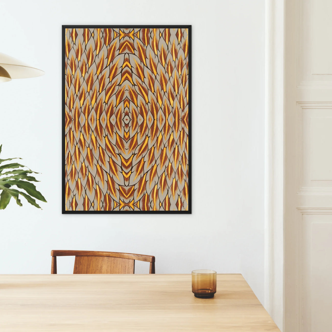 This isn't just decor; it's a focal point for transformation. The rhythmic feather motif will stimulate your synapses, encouraging creative thinking and introspection. Whether you're meditating or entertaining, this float-framed canvas will be your steadfast companion in navigating the liminal spaces between earthly existence and cosmic consciousness.