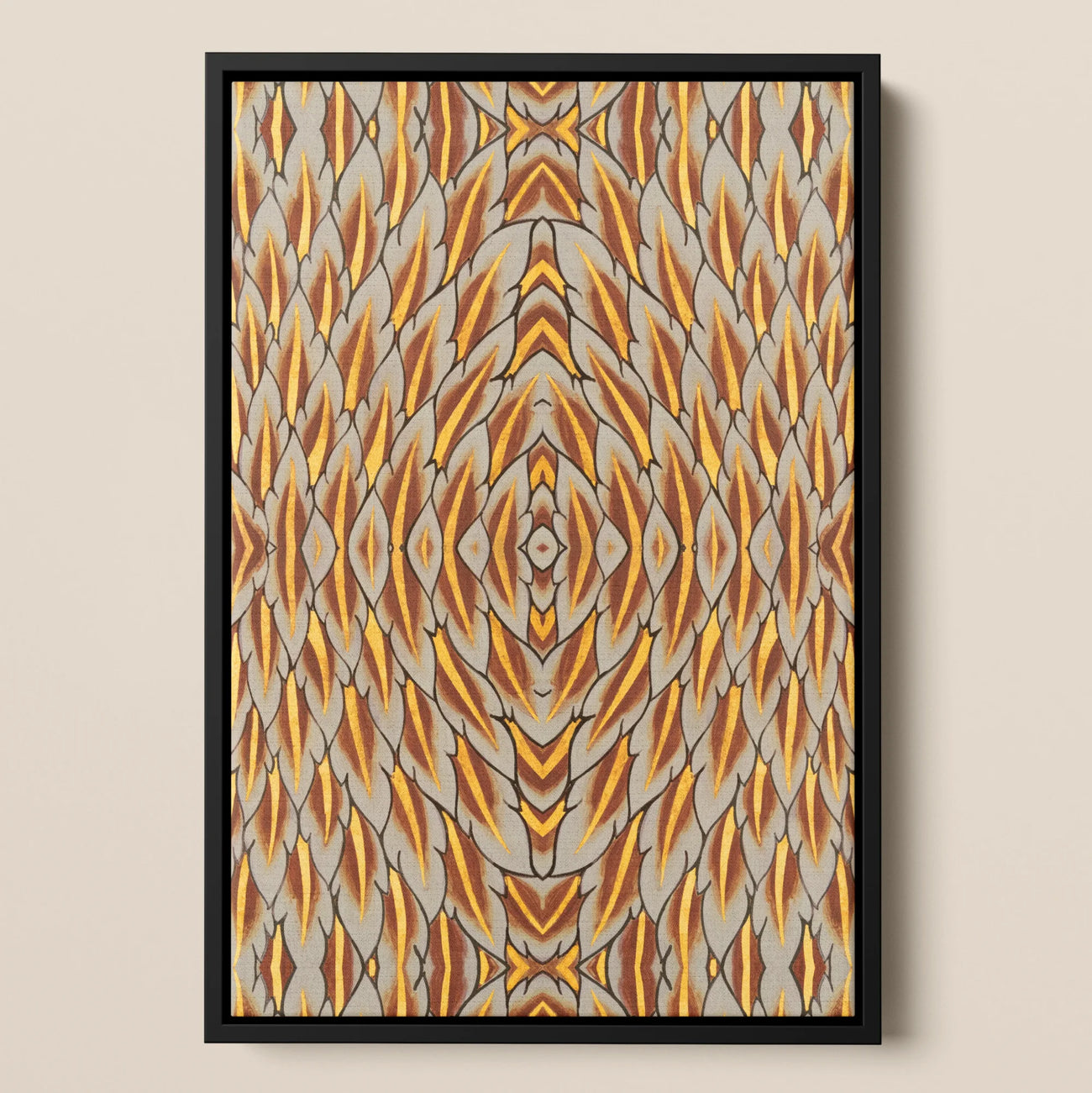 This Thai art float framed canvas features a kaleidoscopic reimagining of the Garuda's celestial plumage. Amber and umber hues dance in symmetrical abandon, forming concentric lozenges that seem to undulate within their obsidian frame. The design's sacred geometry marries ancient Thai yantra patterns with cutting-edge op-art techniques, bridging millennia of artistic evolution on your wall.