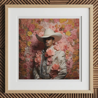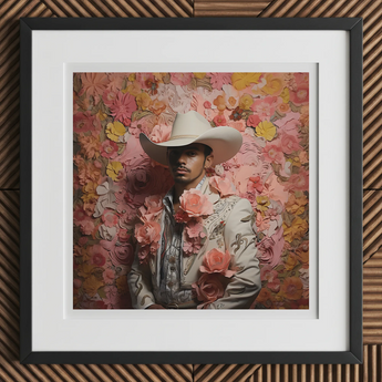 The flowers know this gay vaquero like sunrise and the rain. Forever roaming so he can press boot leather into new soil that remembers everything. Canción and carne viva in bloom—a living ballad wearing his own history like a crown. Composed note by note and stitch by stitch.