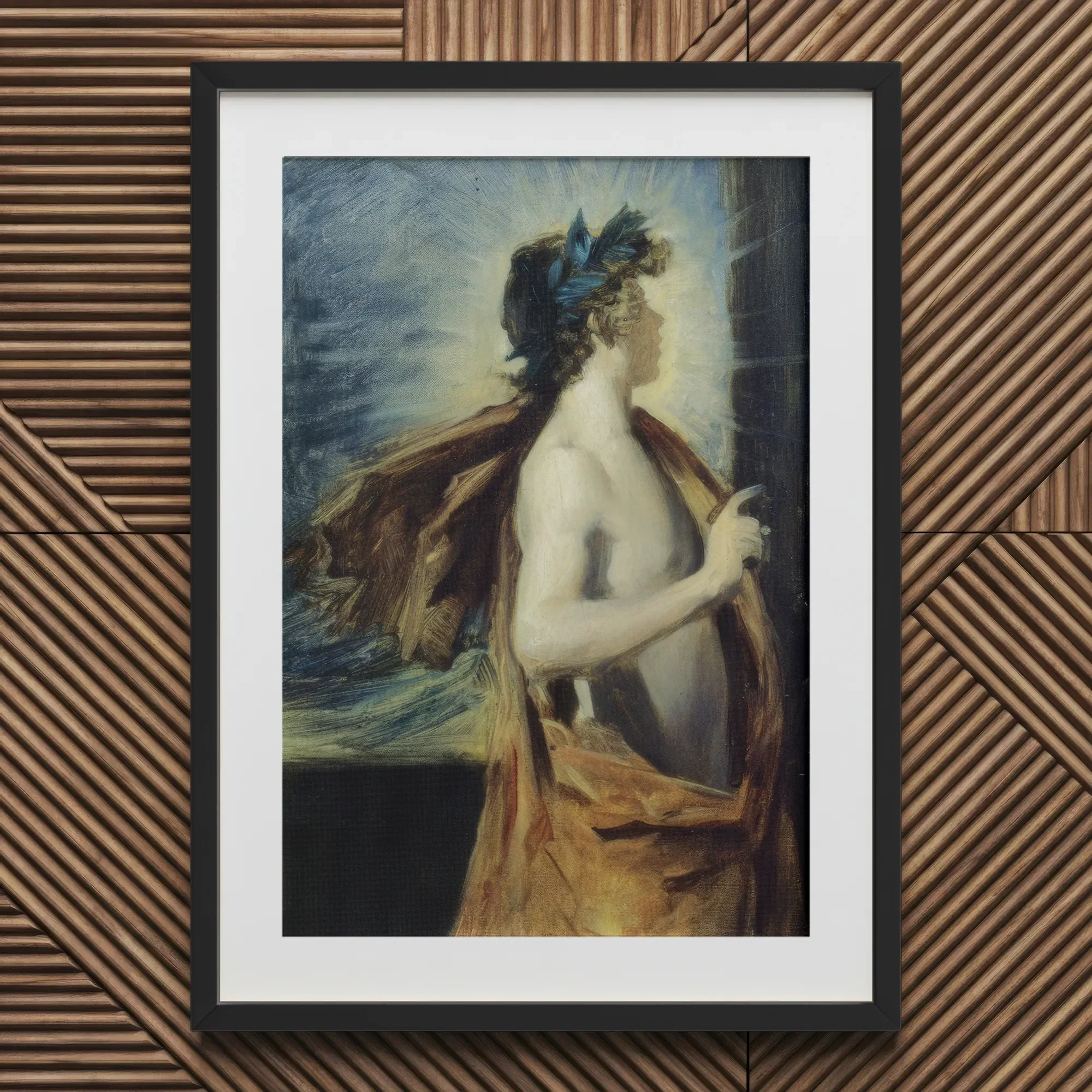 Light detonates around him, an incandescent crown forged from motion itself. John Singer Sargent channels Velázquez yet paints Apollo as apparition: bare-shouldered youth caught between godhood and glare. Every stroke hums with metallic heat—lapis shadows, umber fabric, ochre flare. His profile feels sculpted from storm; that blue-leaf wreath burns like oxidized bronze.