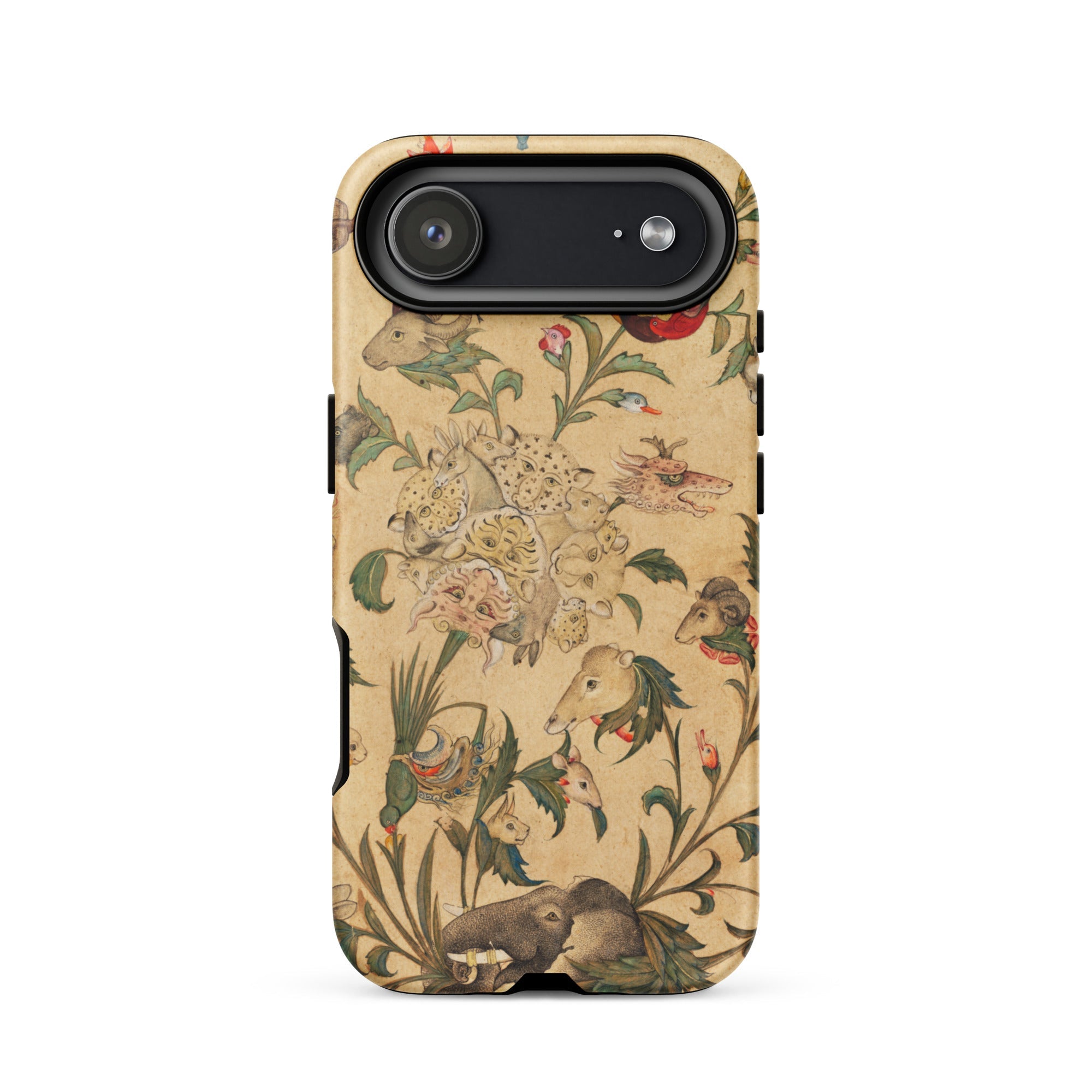 Each botanical tendril wraps around a hybrid creature drawn from 17th-century Mughal bestiaries and Qajar scrolls, etched in gouache with the detail of imperial curiosity. The parchment-tinted background isn’t weathered—it’s calculating. Scroll down, and you’ll find an elephant dreaming in ink, clutching a dagger or a chrysanthemum, or both.