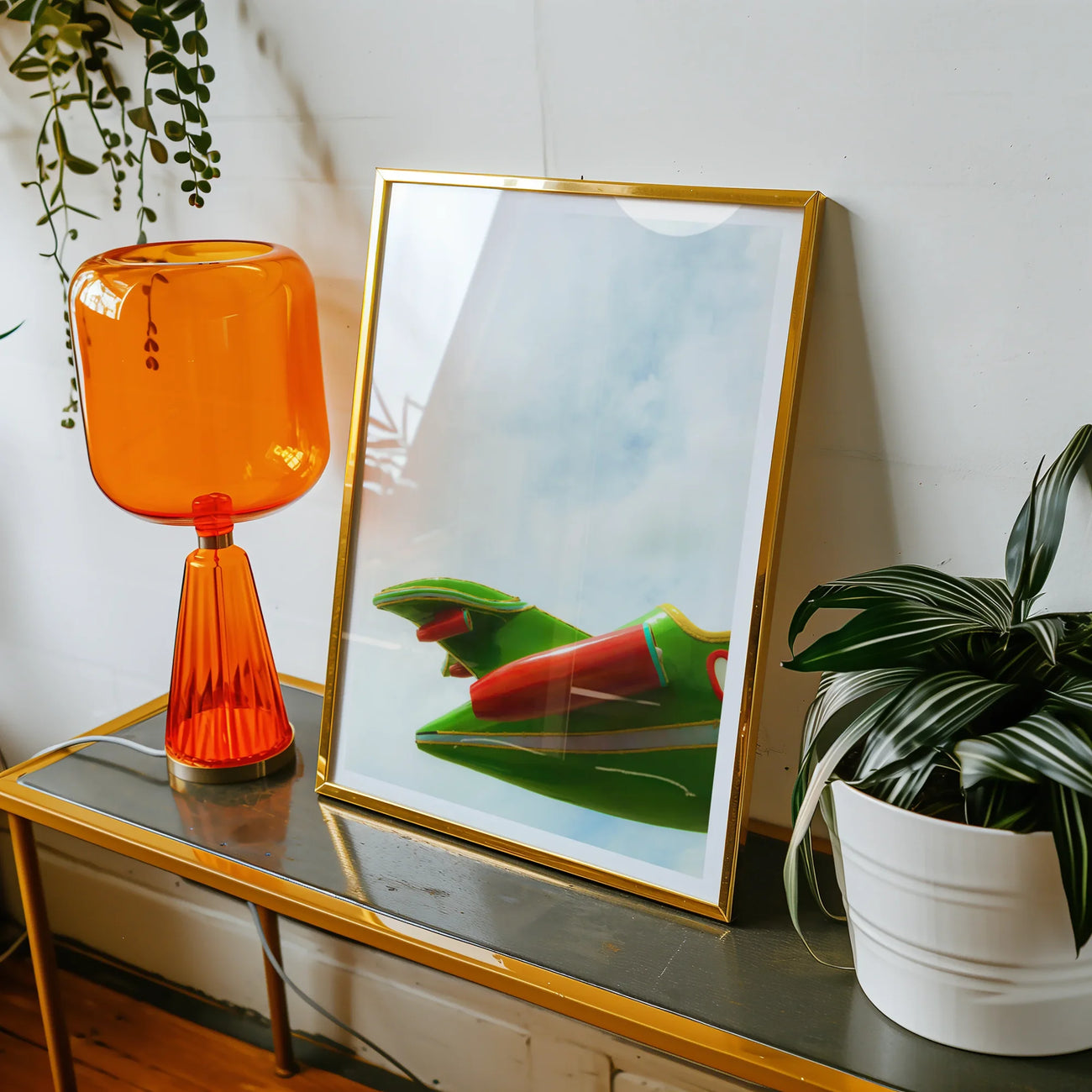 This amusement park airplane art transports you to a realm where childlike wonder takes flight. The photographer's keen eye captures the essence of retro carnival aesthetics, focusing on the aircraft's sleek contours against an ethereal sky. Emerald green dominates the fuselage, punctuated by a crimson engine pod that beckons adventure.