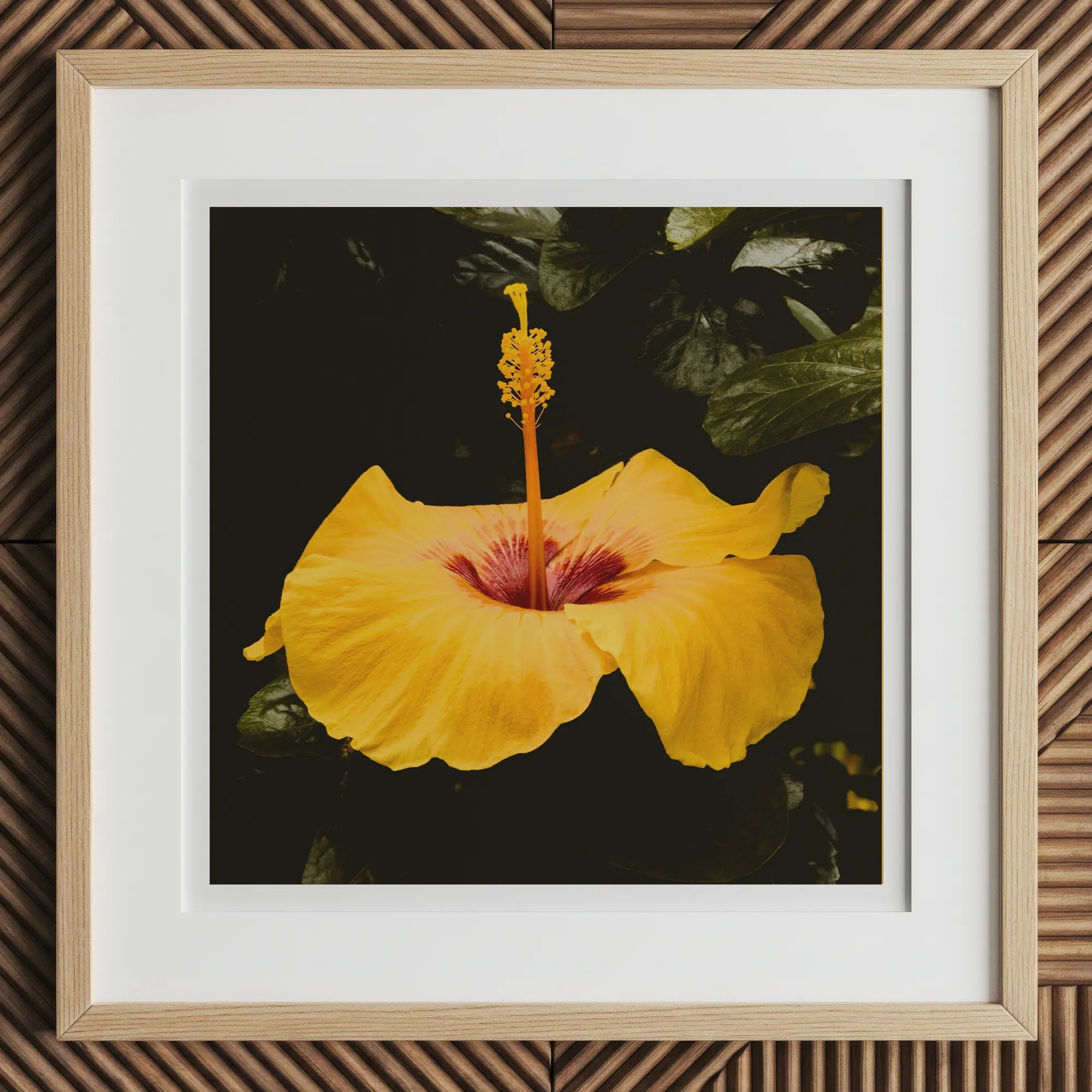 Bask in the golden radiance of this Hoi An hibiscus, a tropical jewel captured in stunning detail. This fine art print showcases nature's artistry, with sun-kissed petals unfurling against shadowy foliage.