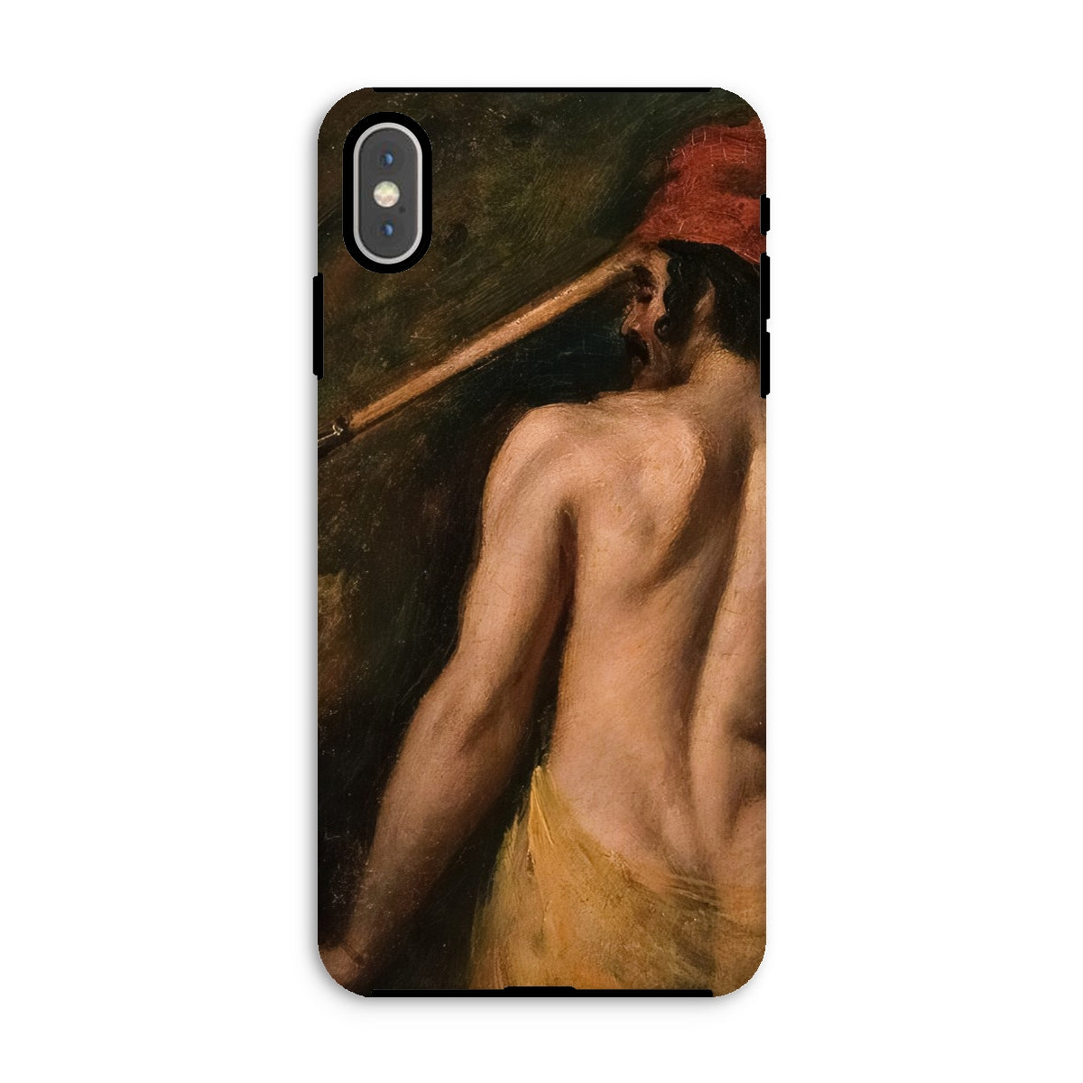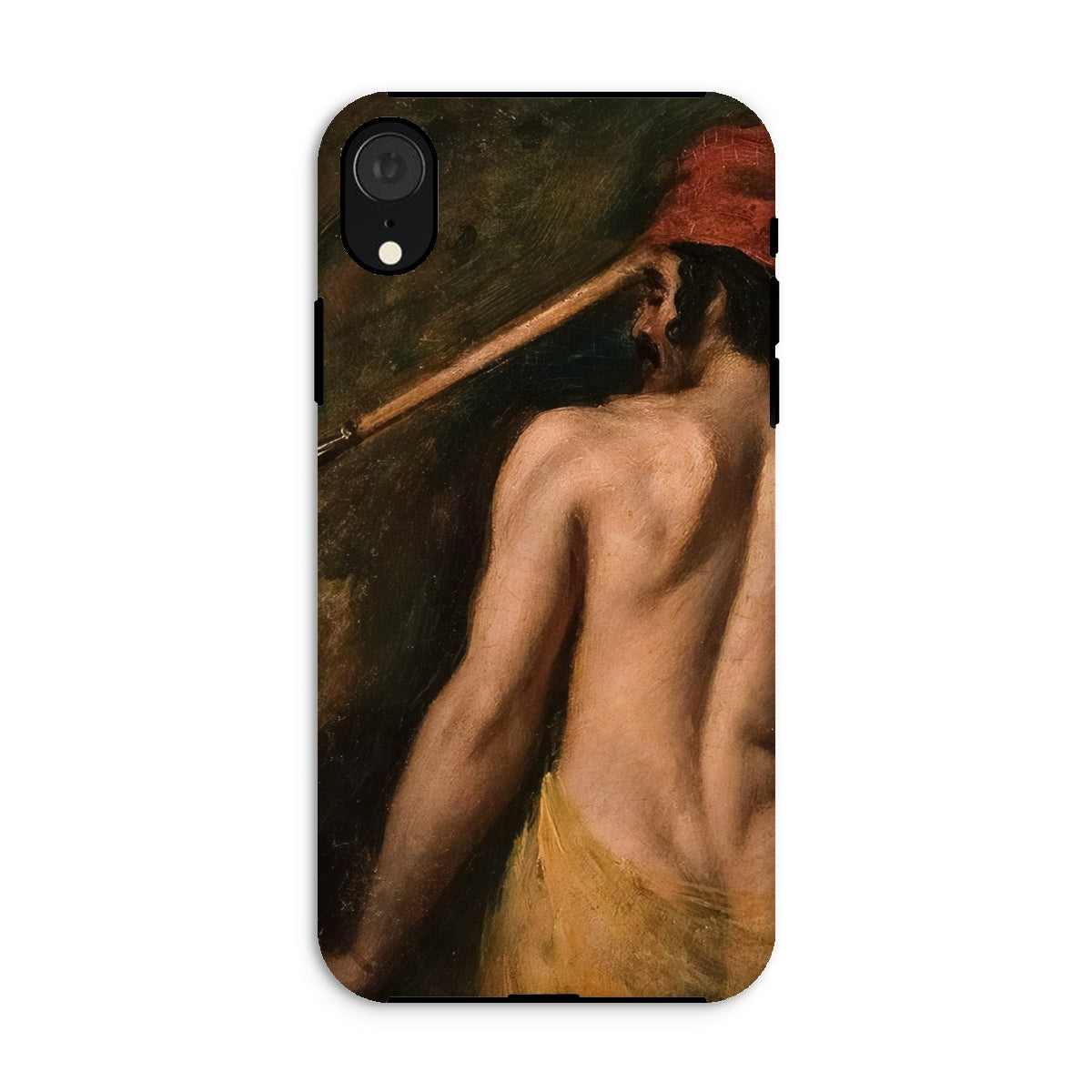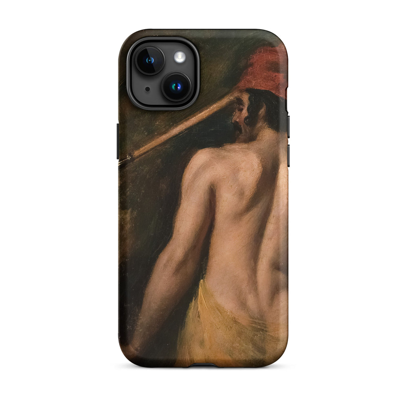 This iPhone case captures a moment of lustful ambiguity, where strength and subjugation intertwine in the soft skinned glow of A Greek Slave by William Etty. The bare back of the male figure dominating the composition. Sinews taut beneath the soft glow of flickering light. A vivid red Phrygian cap perches atop his head—an ancient emblem of liberation playfully inverted. The loosely draped yellow cloth around his waist suggesting movement, as though caught between flight and stillness, freedom and restraint. The darkened background swirling like a storm, framing the figure in an atmosphere heavy with unspoken tension.