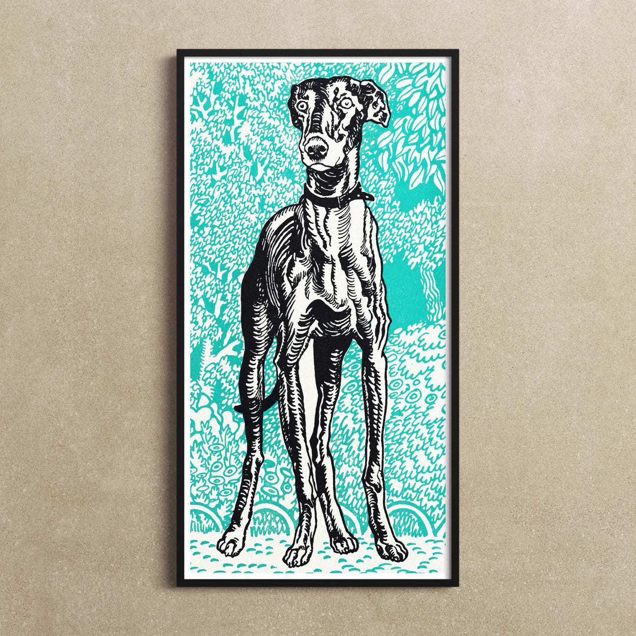 Immerse yourself in the sleek elegance of Moriz Jung's 1912 Greyhound lithograph, a monochromatic canine marvel set against a sea of turquoise.