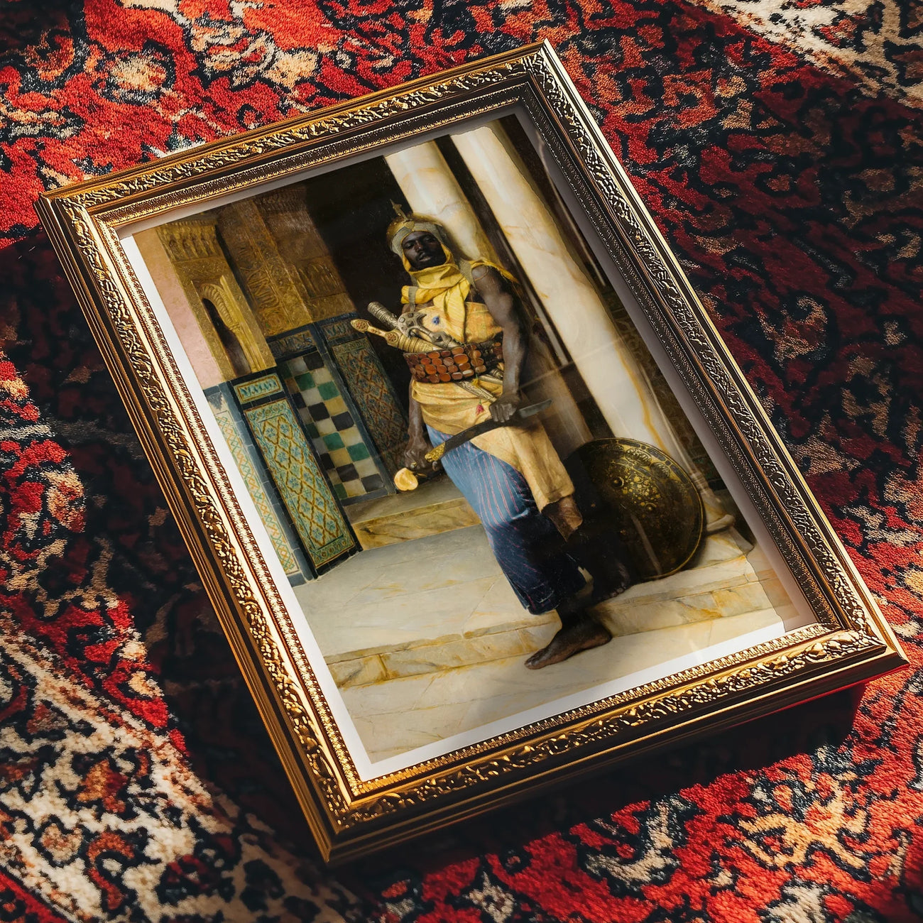 Deutsch's meticulous attention to detail brings this Orientalist scene to life. From the guard's embroidered turban to the burnished shield at his feet, every element invites you to explore the exoticism of 19th-century Egypt. This print isn't just decor; it's a portal to a bygone era of mystery and splendor.
