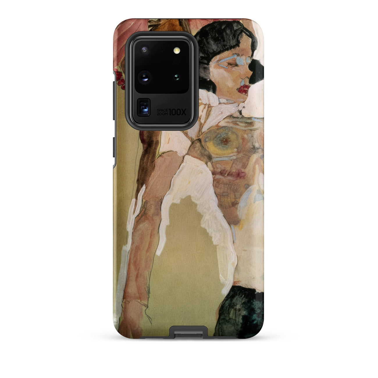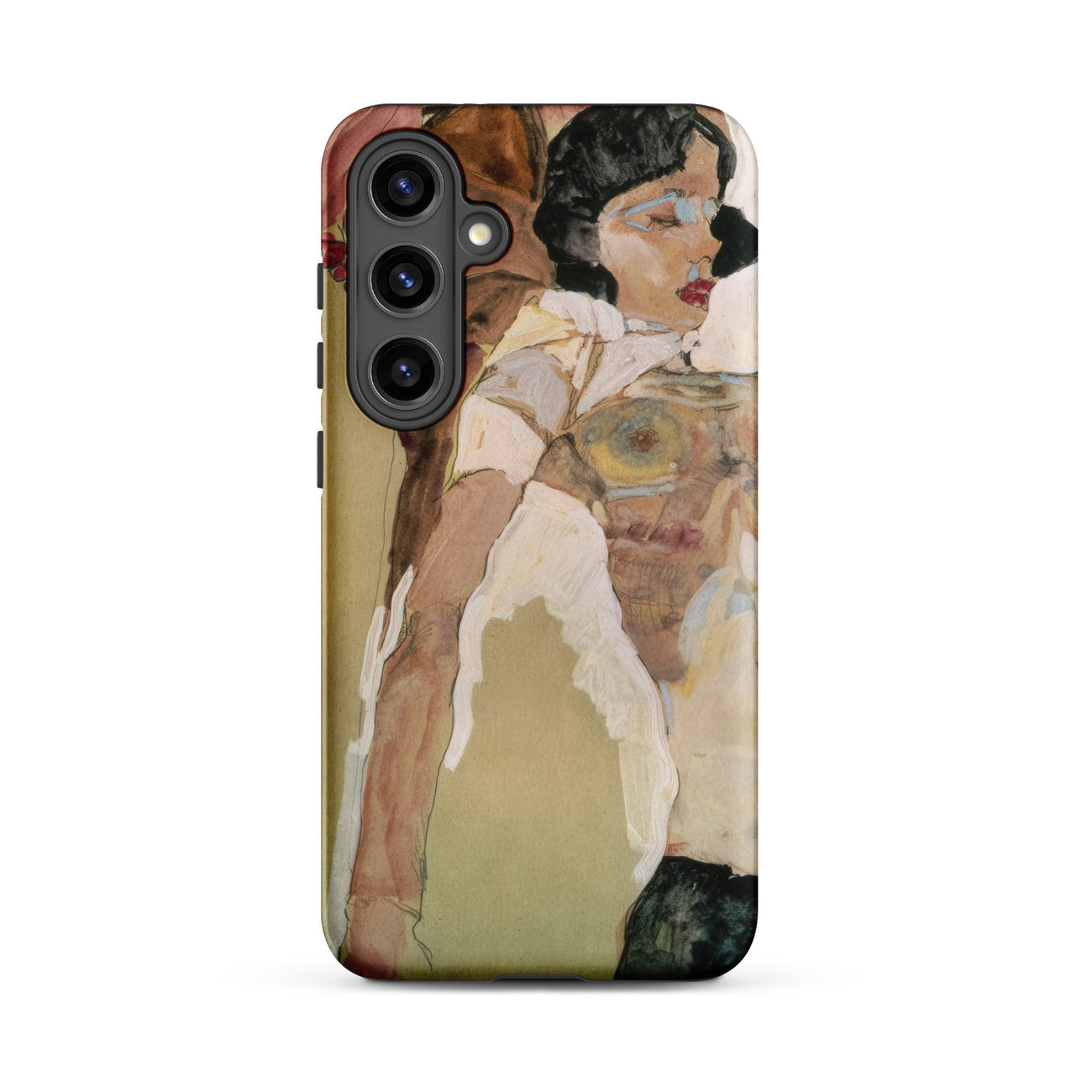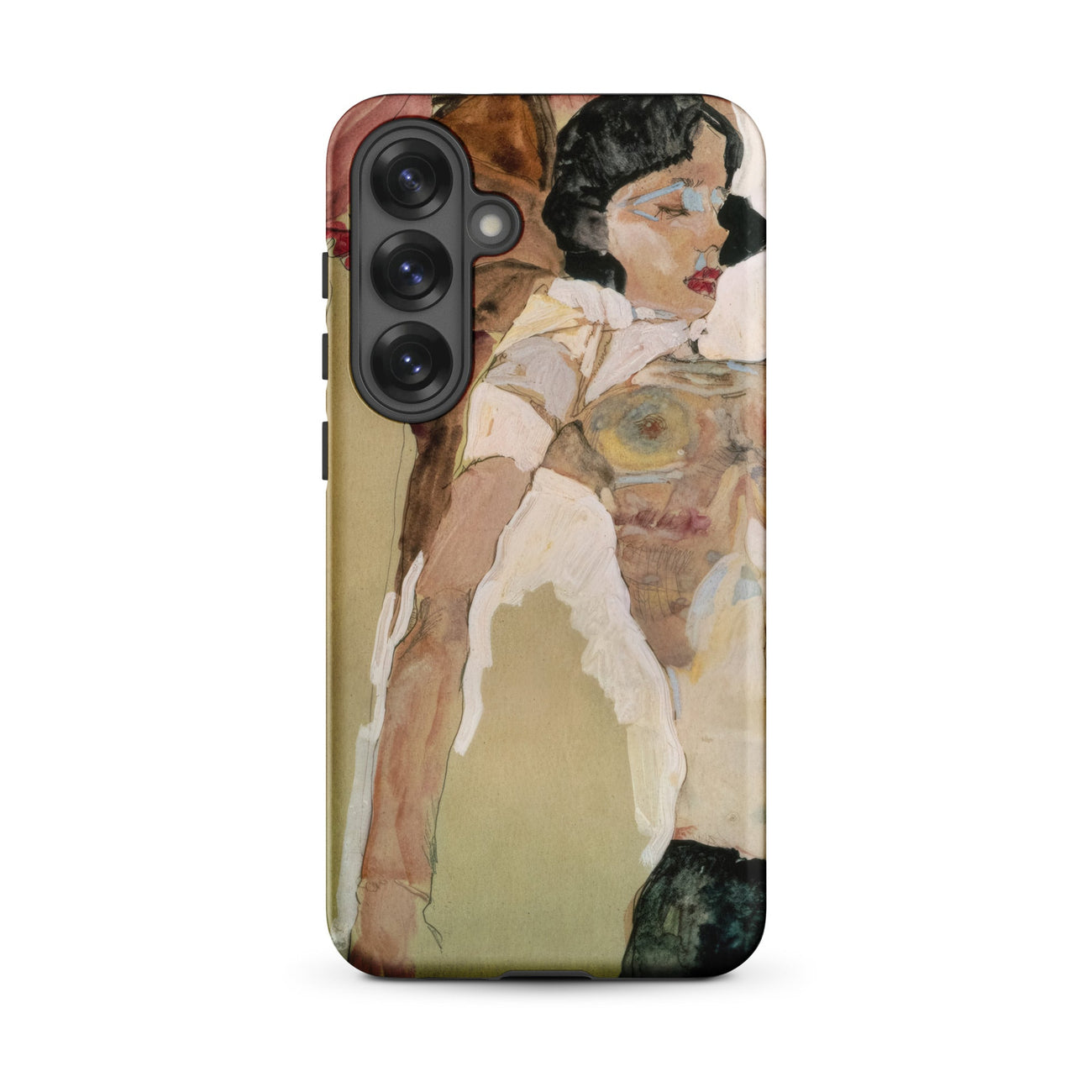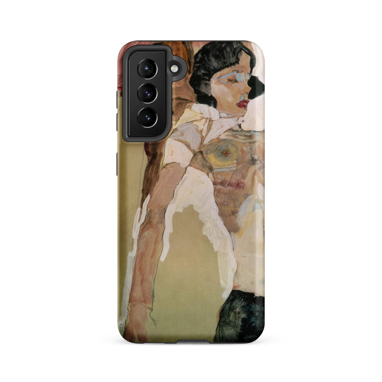 On this Samsung case, Schiele’s half-clothed figure lingers in liminal suspension, neither fully posed nor entirely abandoned. The cropped composition intensifies the body’s distortion: an elongated arm, a tilted face, shadows of rose, smoke gray, and mossy green bleeding through translucent washes.