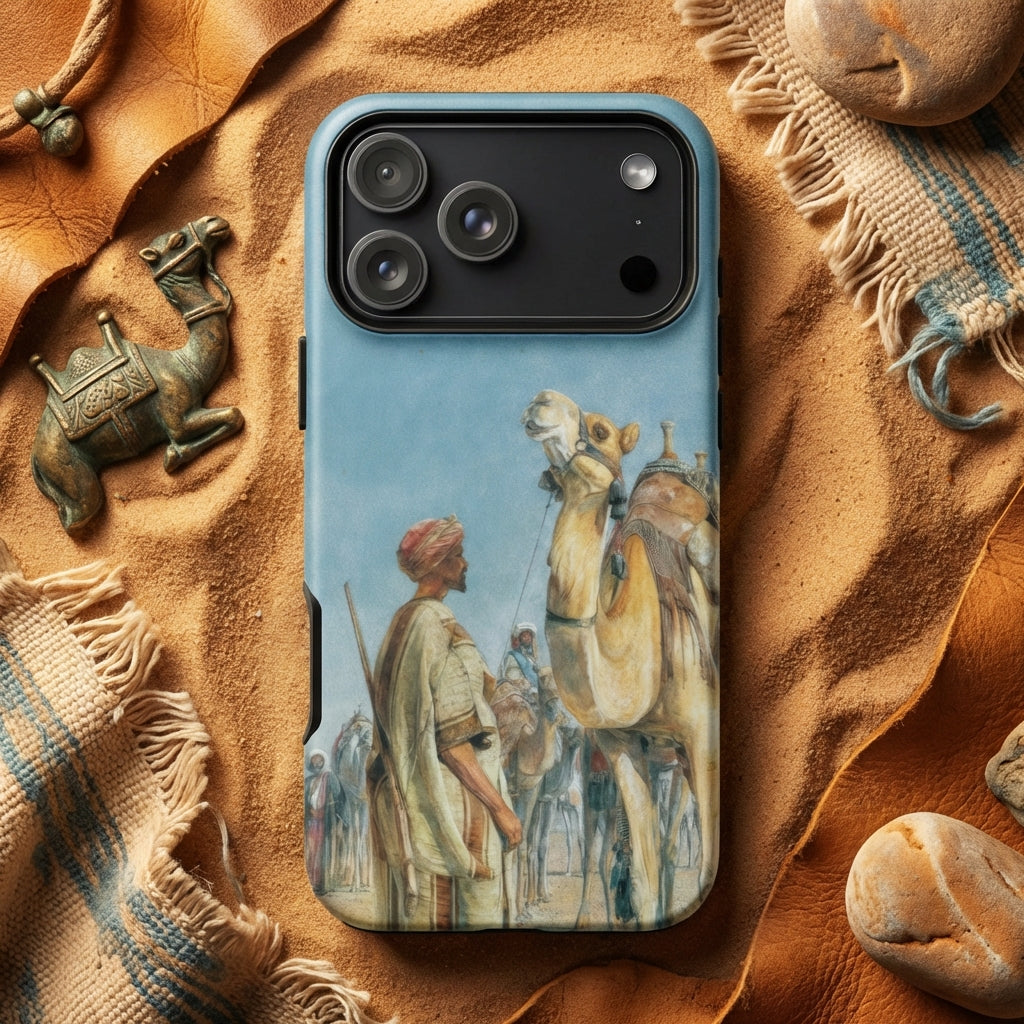 This iPhone case transforms the watercolor into a talisman of desert wanderings—shimmering mirage, camel bells, slow pilgrimage—preserved in portable form for the modern traveler.