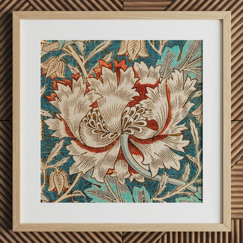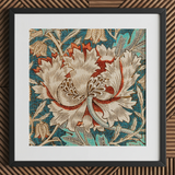 Discover the quintessence of William Morris's artistry in this Honeysuckle print. You'll be transported to a realm where nature's elegance reigns supreme. The centerpiece: a resplendent chrysanthemum-like bloom, its cream petals unfurling against a deep teal backdrop. Intricate linework breathes life into each petal, stem, and leaf. Surrounding this floral focal point, sinuous vines and delicate foliage weave a tapestry of organic forms.