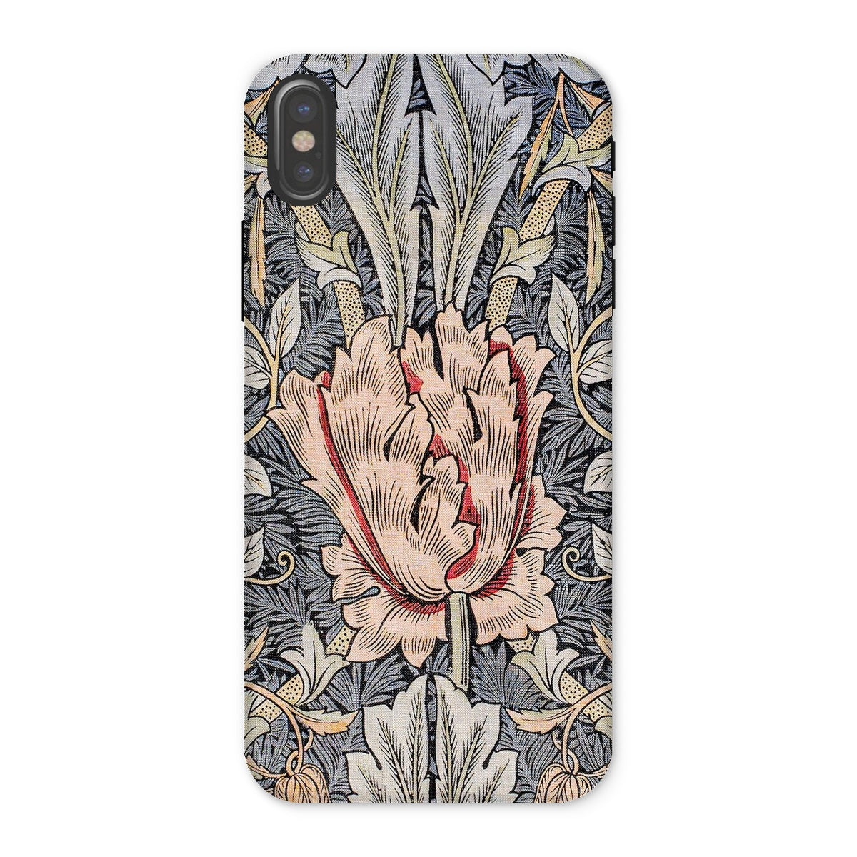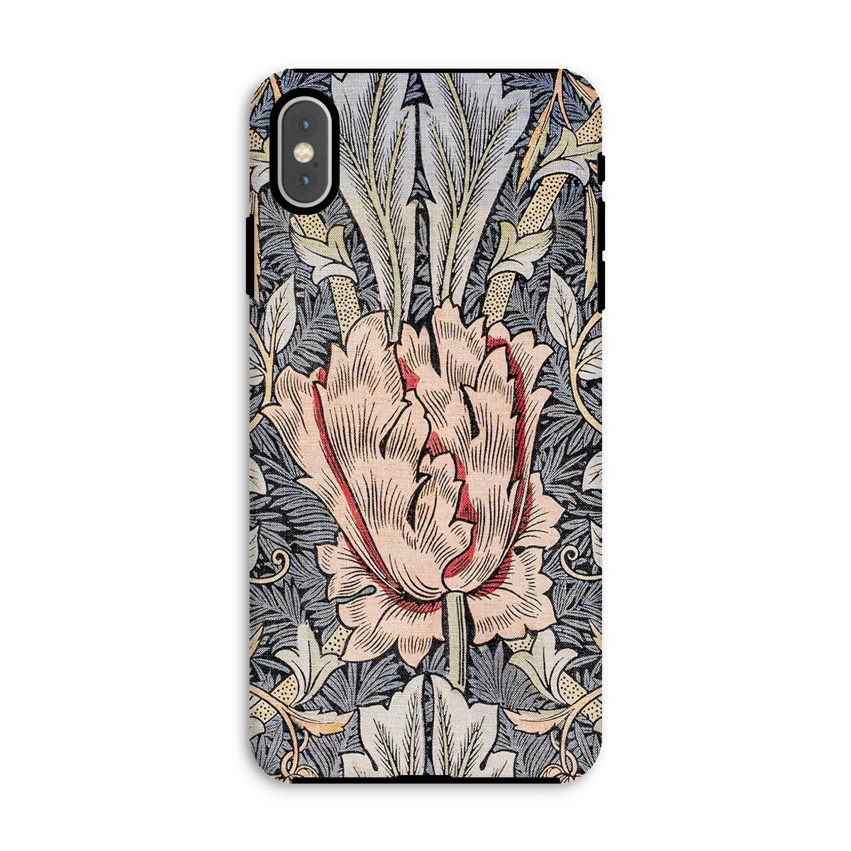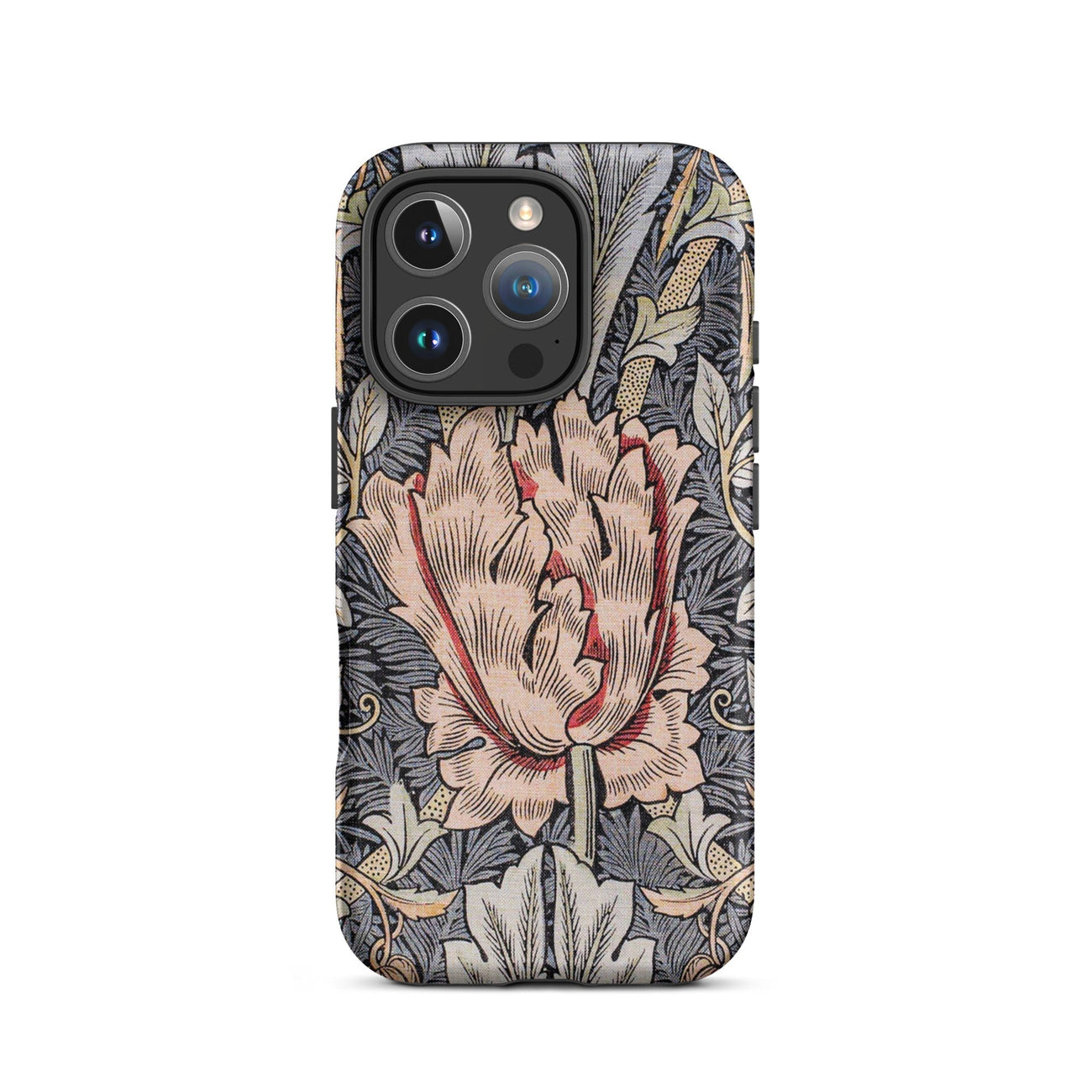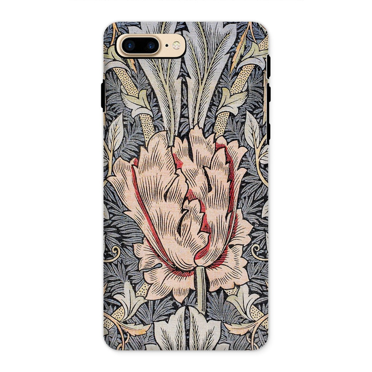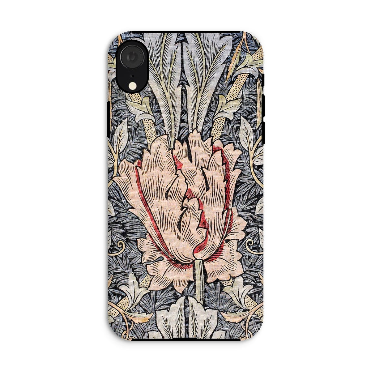 Morris's genius blooms before your eyes - a central peach colored blossom unfurls amidst a tapestry of leaves, stems, and buds. This isn't just a phone cover; it's a rebellion against industrial monotony, a celebration of nature's complexity rendered in exquisite detail.
