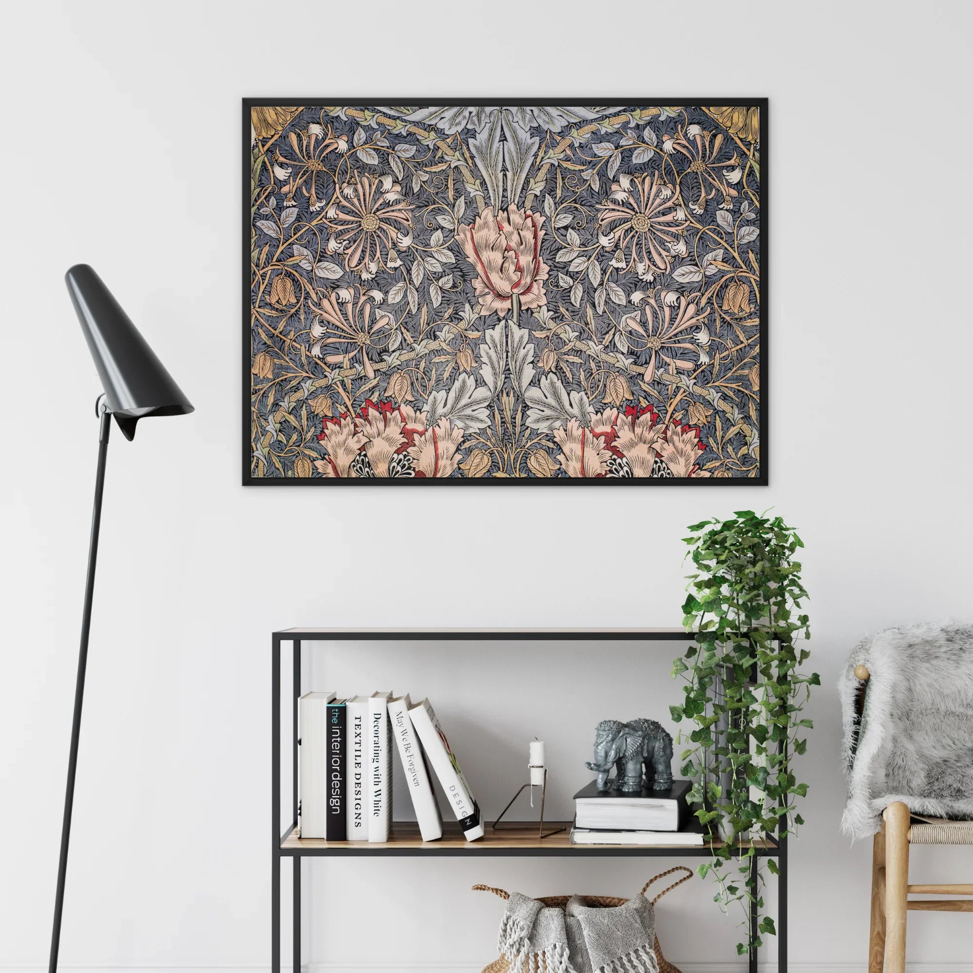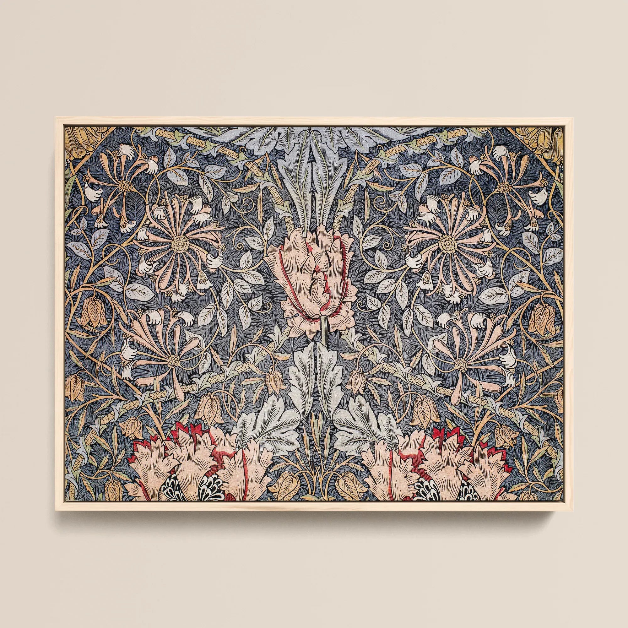 Immerse yourself in William Morris's botanical wonderland with this Honeysuckle art print. You'll be captivated by the intricate dance of flora, where delicate petals and sinuous stems intertwine in a mesmerizing pattern.