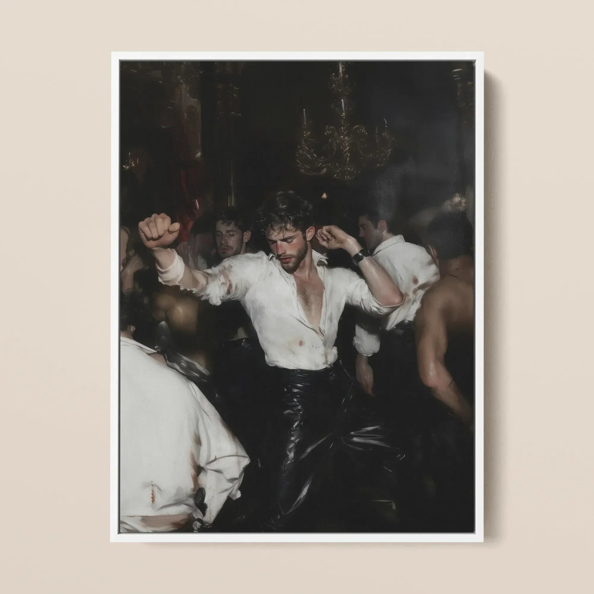 Limbs jerk. Mouths open. Fingers dig. And Caravaggio sensuality unzips the dark of this circuit gay afterparty where the room vibrates and his hips grind into darkness. The crowd a blur of writhing gay baroque at its most sensual... and savage. Every beat tearing through neoclassical stillness, rendered in oil paint.