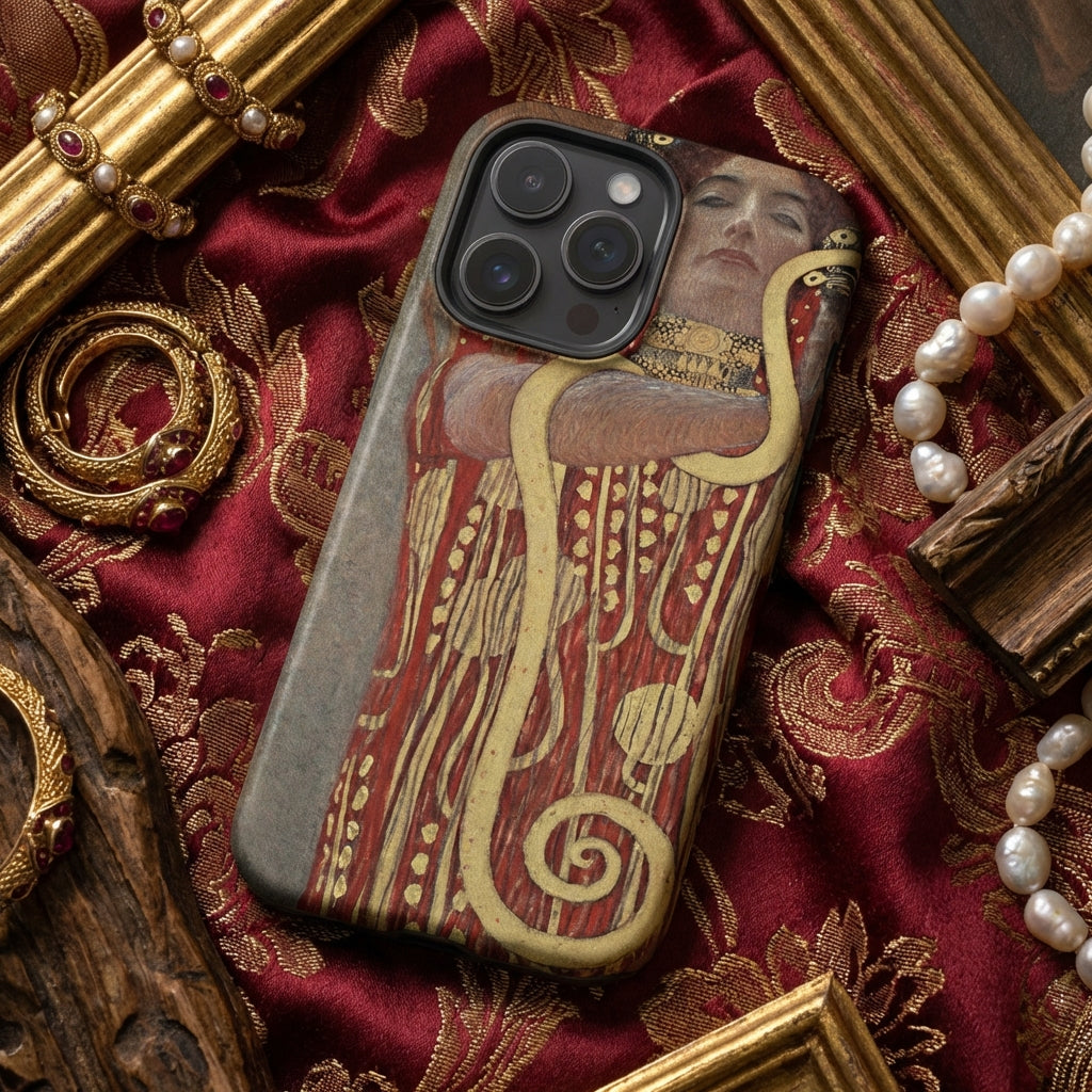 By adorning your phone with this Jugendstil jewel, you carry a piece of art history. Let Hygieia's enigmatic gaze and Klimt's golden rebellion inspire your daily life, merging cutting-edge technology with turn-of-the-century Viennese decadence.