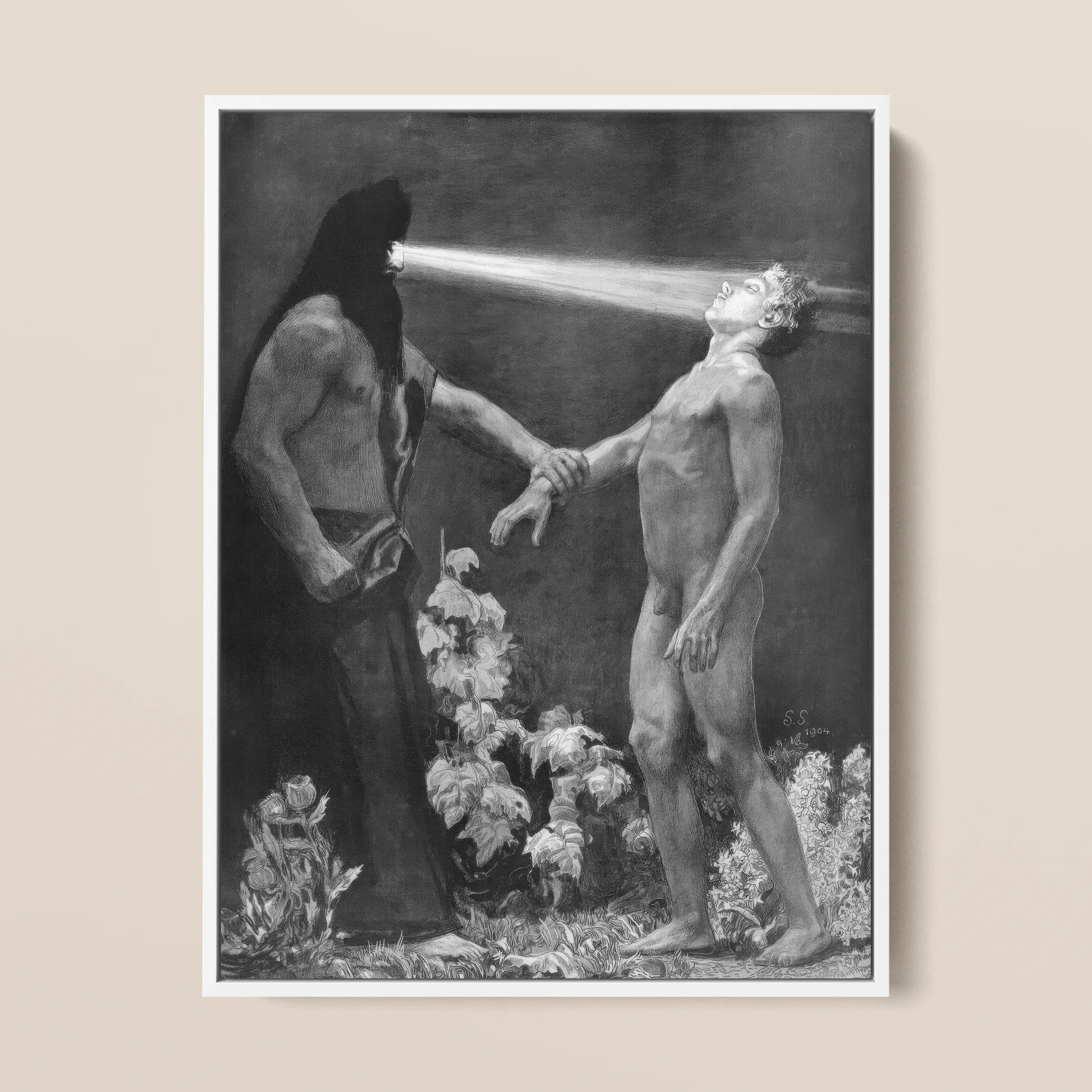 A torrent of white light erupts from the standing man’s eyes, scalding the naked youth in a radiance that feels both surgical and ecstatic. Muscles tremble beneath that merciless gaze, caught between surrender and seizure.