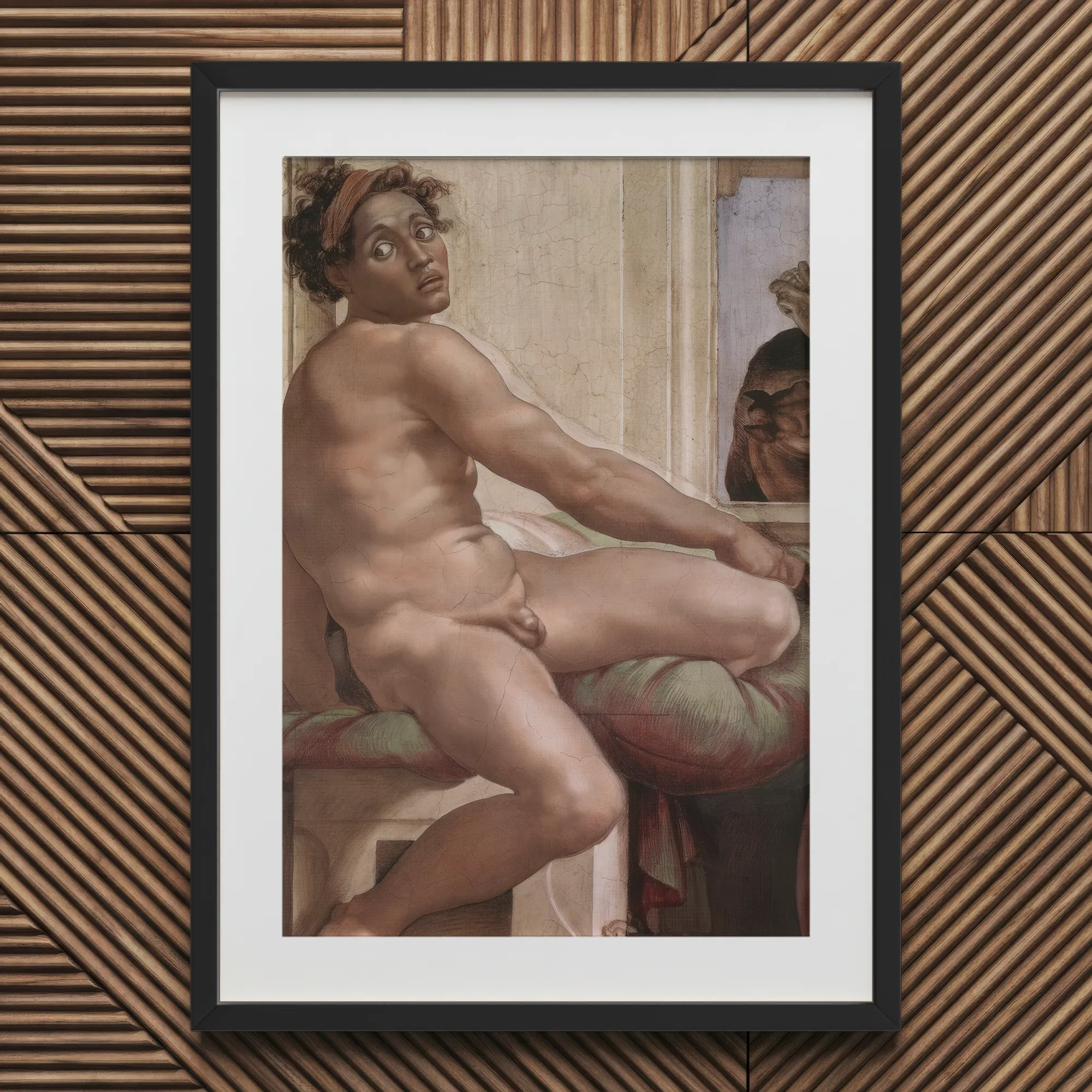 Michelangelo carves this ignudo not from clay or chalk but from quarried defiance: thigh bronzed, torso coiled, gaze unclaimed. The fingers rest — not grasping, but suspended — on a cushion dyed the chromatic palate of Tuscan linens and Roman decadence. His browband slices through papal authority with the arrogance of Apollo in exile.