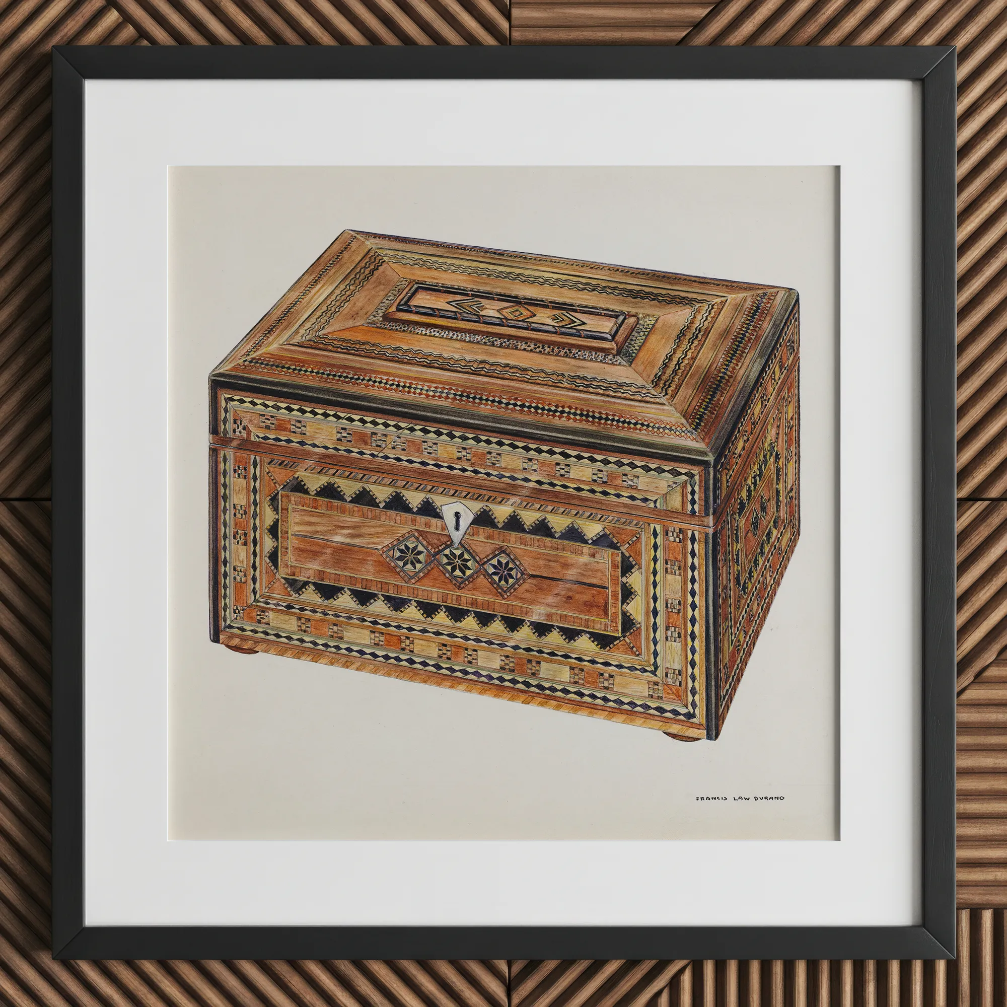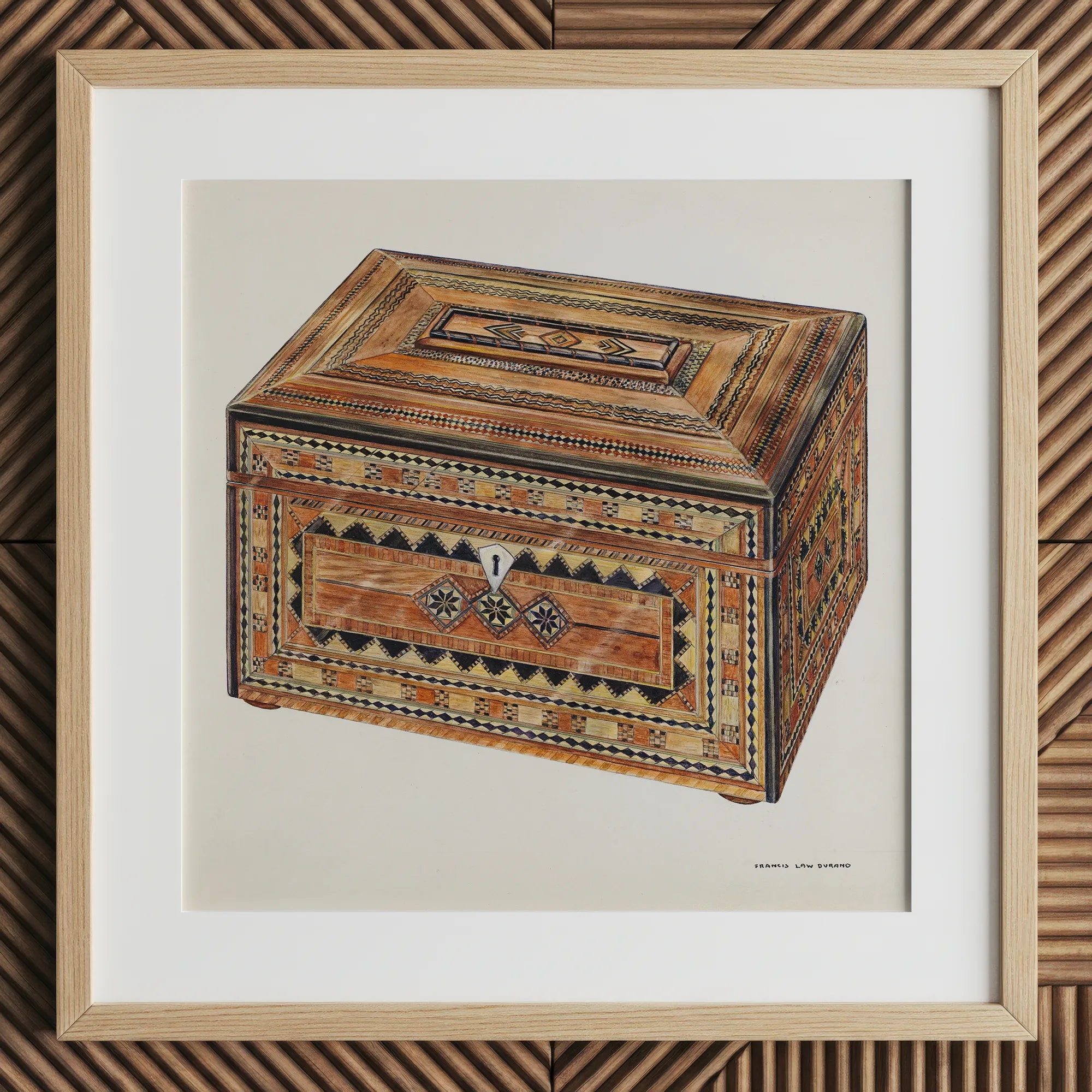 Feast your eyes on this exquisite Francis Law Durand masterpiece – an inlaid sewing box that transcends mere utility. You'll be mesmerized by the labyrinthine patterns adorning its surface, a symphony of geometric precision in warm, earthy hues.
