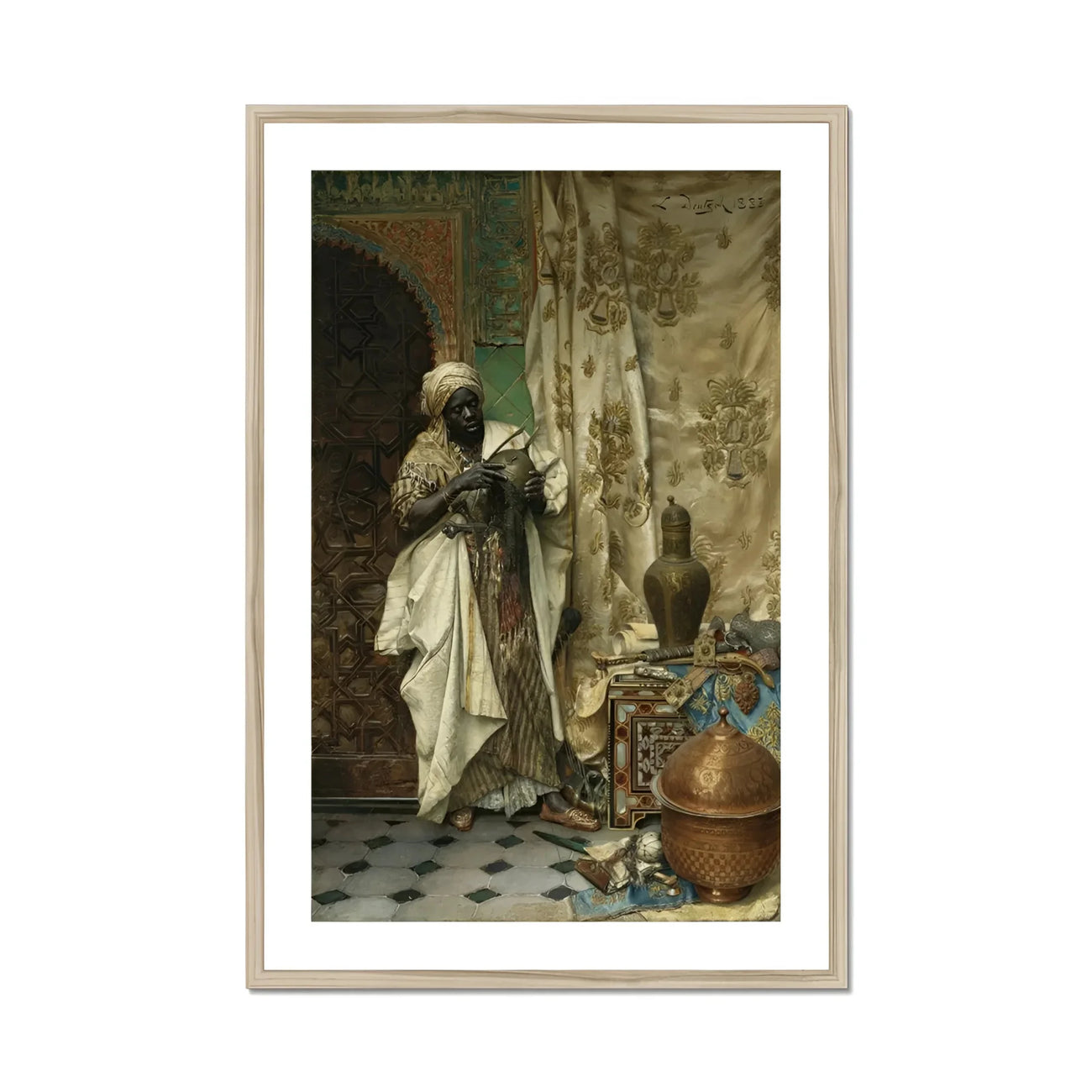 Immerse yourself in the opulent world of Ludwig Deutsch's The Inspection, where every brushstroke transports you to a lavish 19th-century Cairo interior. This art print captures a mesmerizing moment as a turbaned figure, draped in a striped kaftan, scrutinizes an ornate helmet amidst a treasure trove of Eastern artifacts.