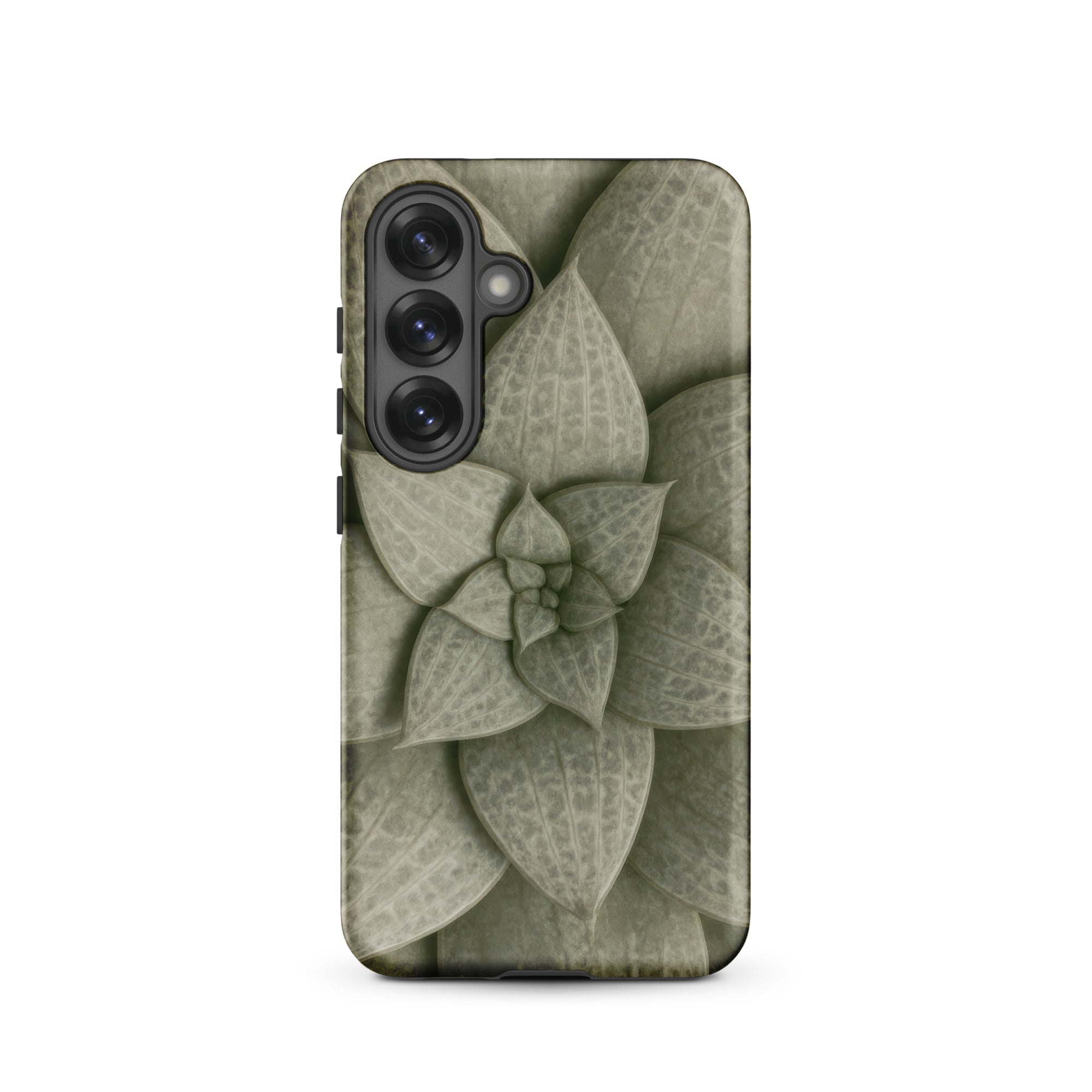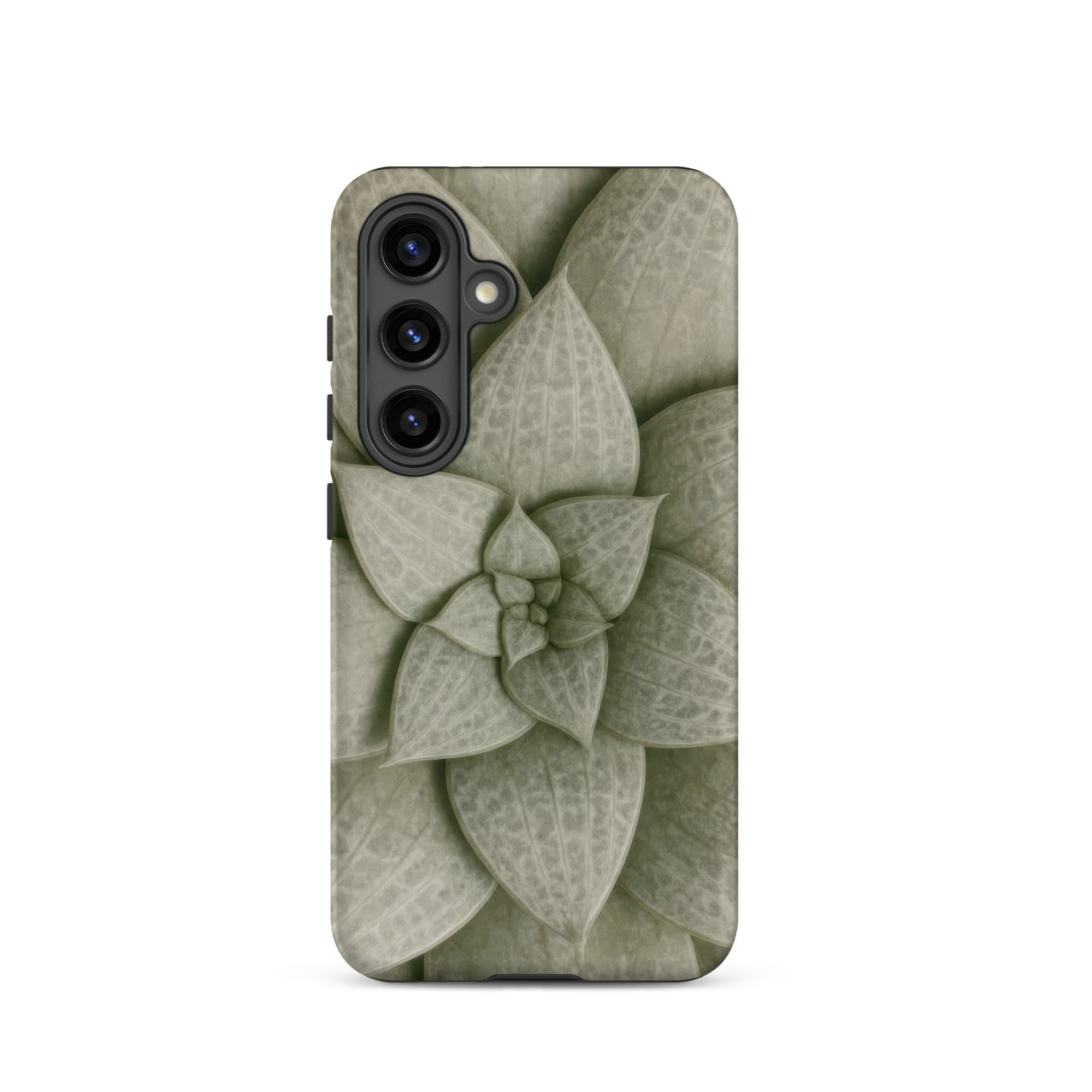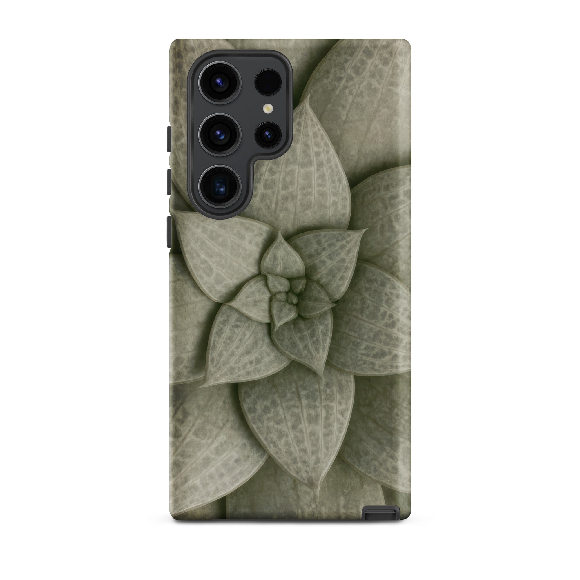 From above, the Echeveria rosette spirals like a clenched fist slowly opening. Dusty celadon leaves tier outward in concentric whorls, each one plump with stored water, ridged with longitudinal veins that catch light like grooves on aged bronze. The phone case carries this desert-born spiral as tactile talisman, sage pigments bleeding into olive where shadows pool between overlapping lobes.