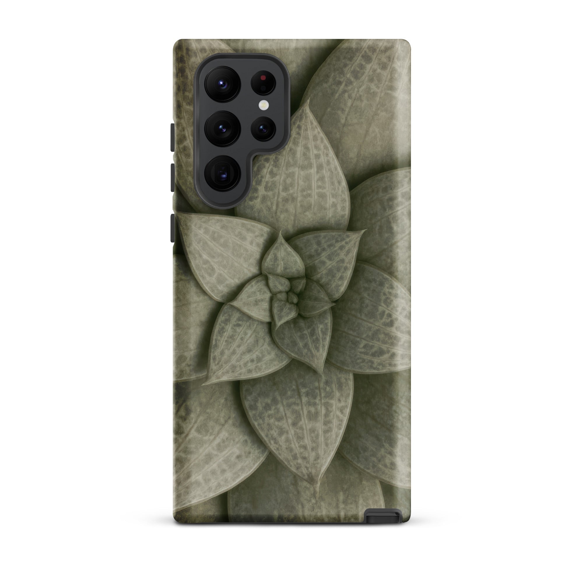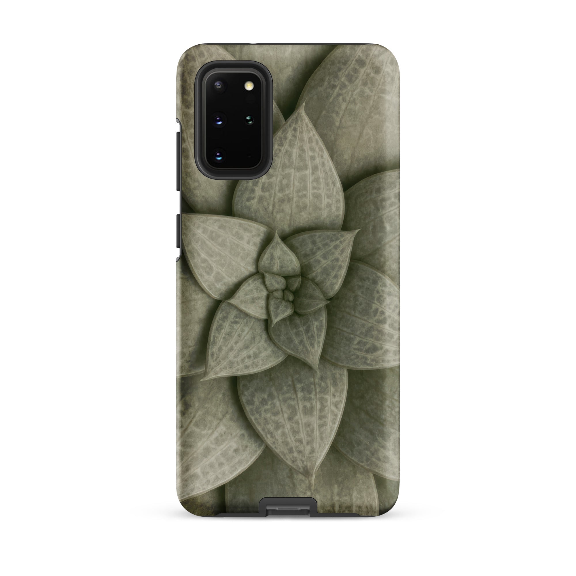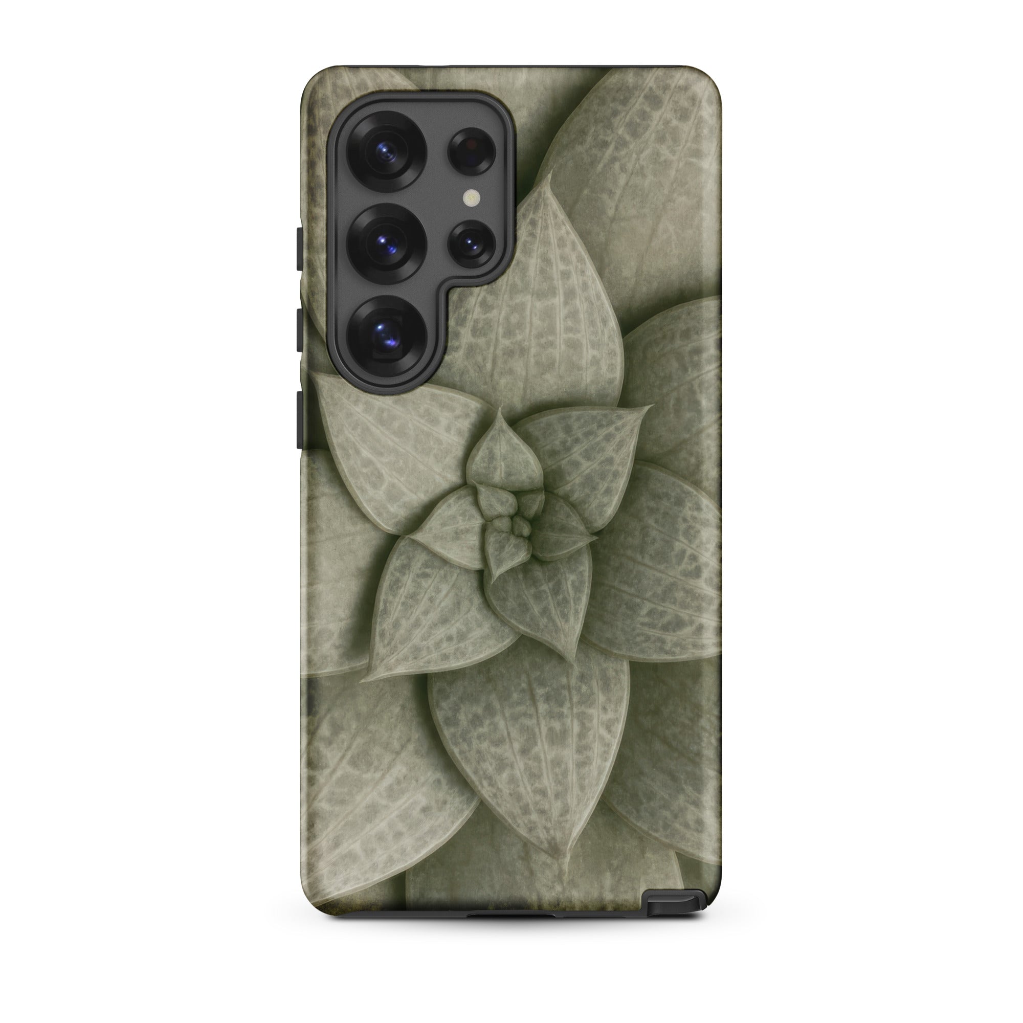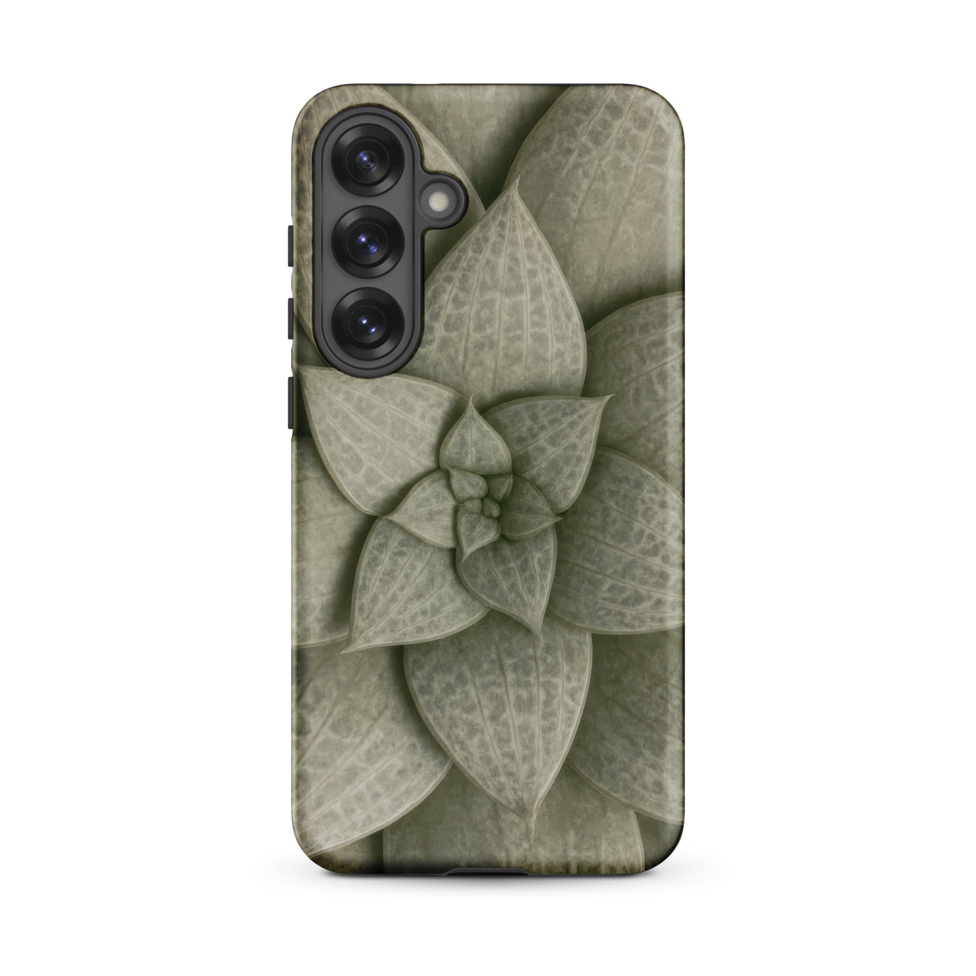 From above, the Echeveria rosette spirals like a clenched fist slowly opening. Dusty celadon leaves tier outward in concentric whorls, each one plump with stored water, ridged with longitudinal veins that catch light like grooves on aged bronze. The phone case carries this desert-born spiral as tactile talisman, sage pigments bleeding into olive where shadows pool between overlapping lobes.