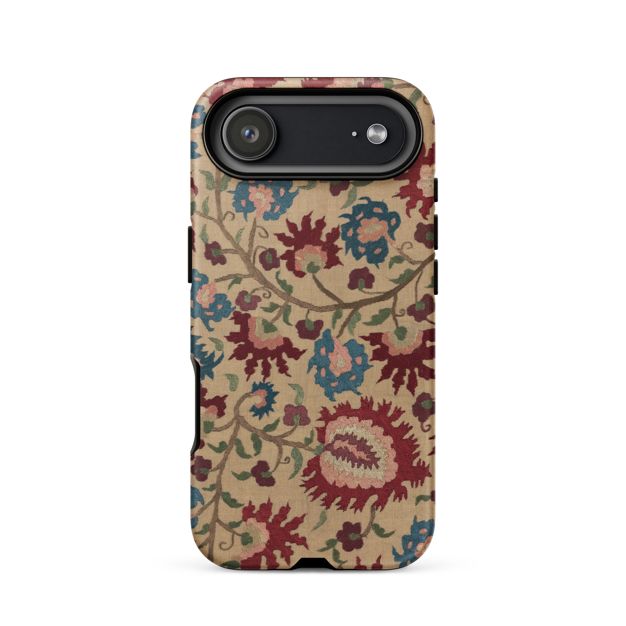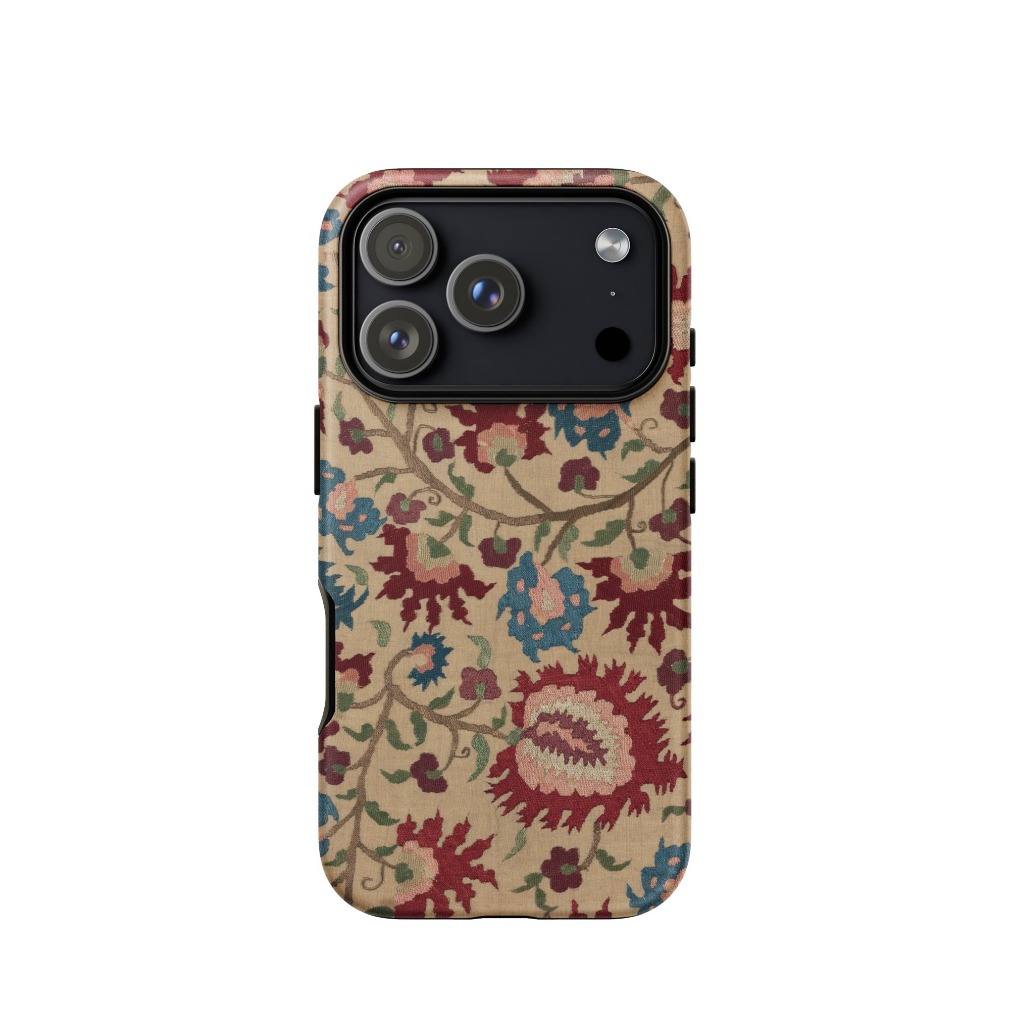 This iPhone case is a carrier of ancestral whispers: dressed in the blossoming ghosts of bridal linens and tablecloths steeped in myth and mulberry wine. A vine of Venetian-blooded carnations coils with Ottoman arabesques, unfurling across the surface like a folkloric incantation—stitched not in thread, but in pixelated permanence.