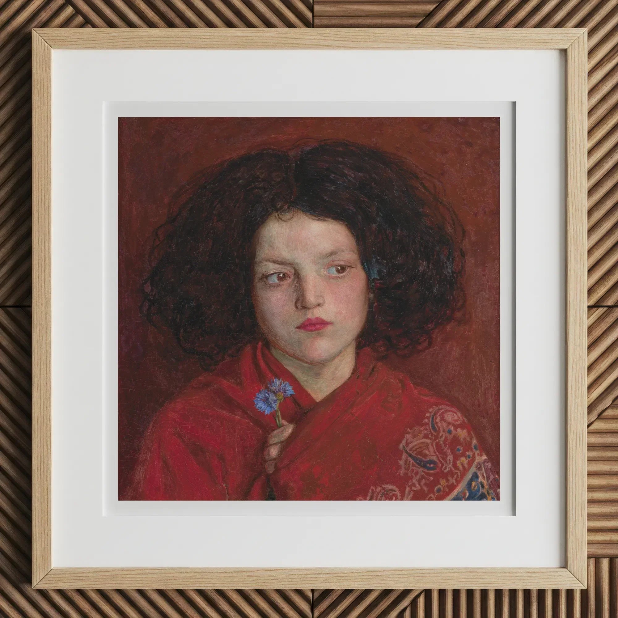 She is composed of opposites: florid cheek and clenched jaw, riotous hair and tightly wrapped wool. The blue cornflower, too delicate for this world, stands at odds with the unforgiving red garment wound around her. In Irish Girl, Ford Madox Brown achieves density without drama.